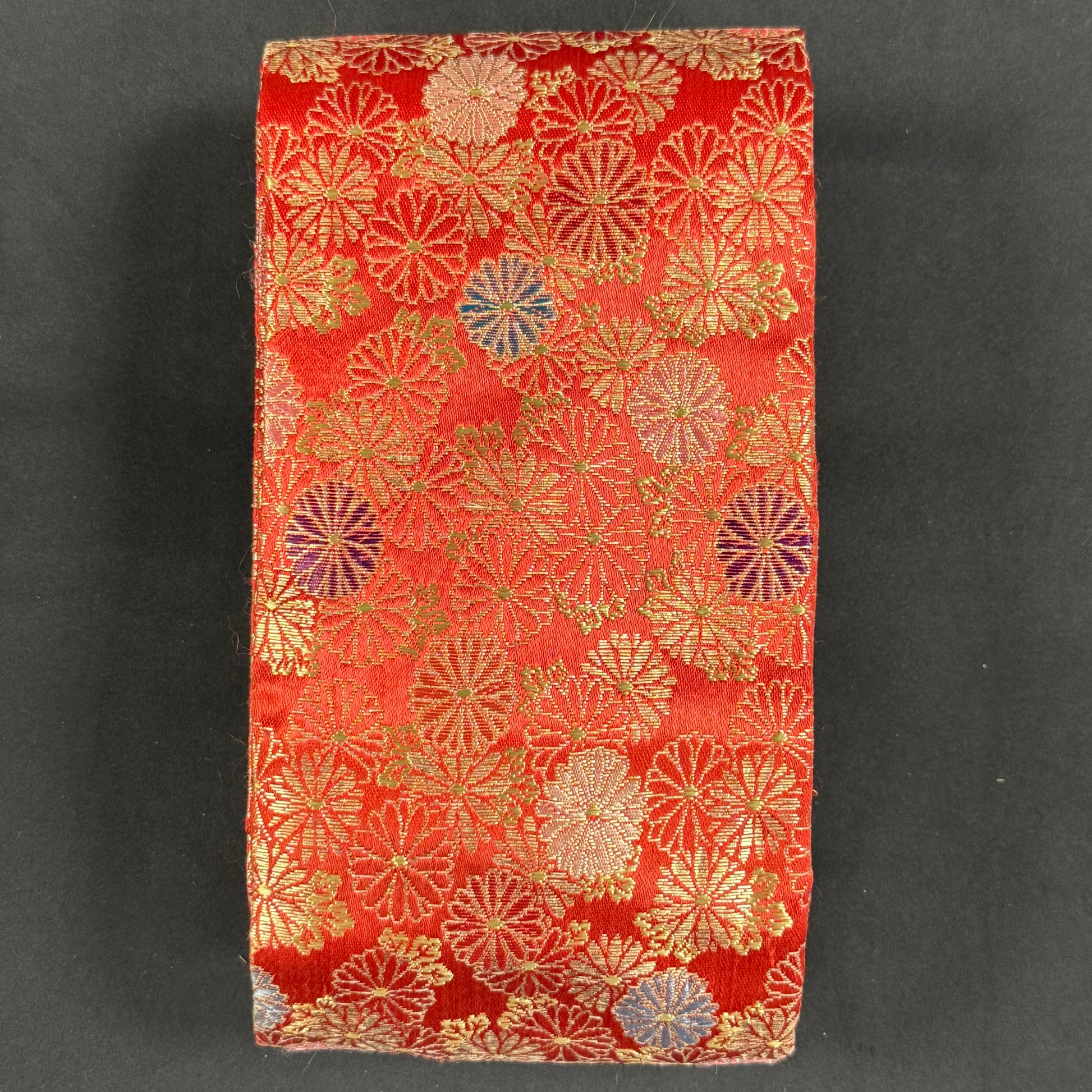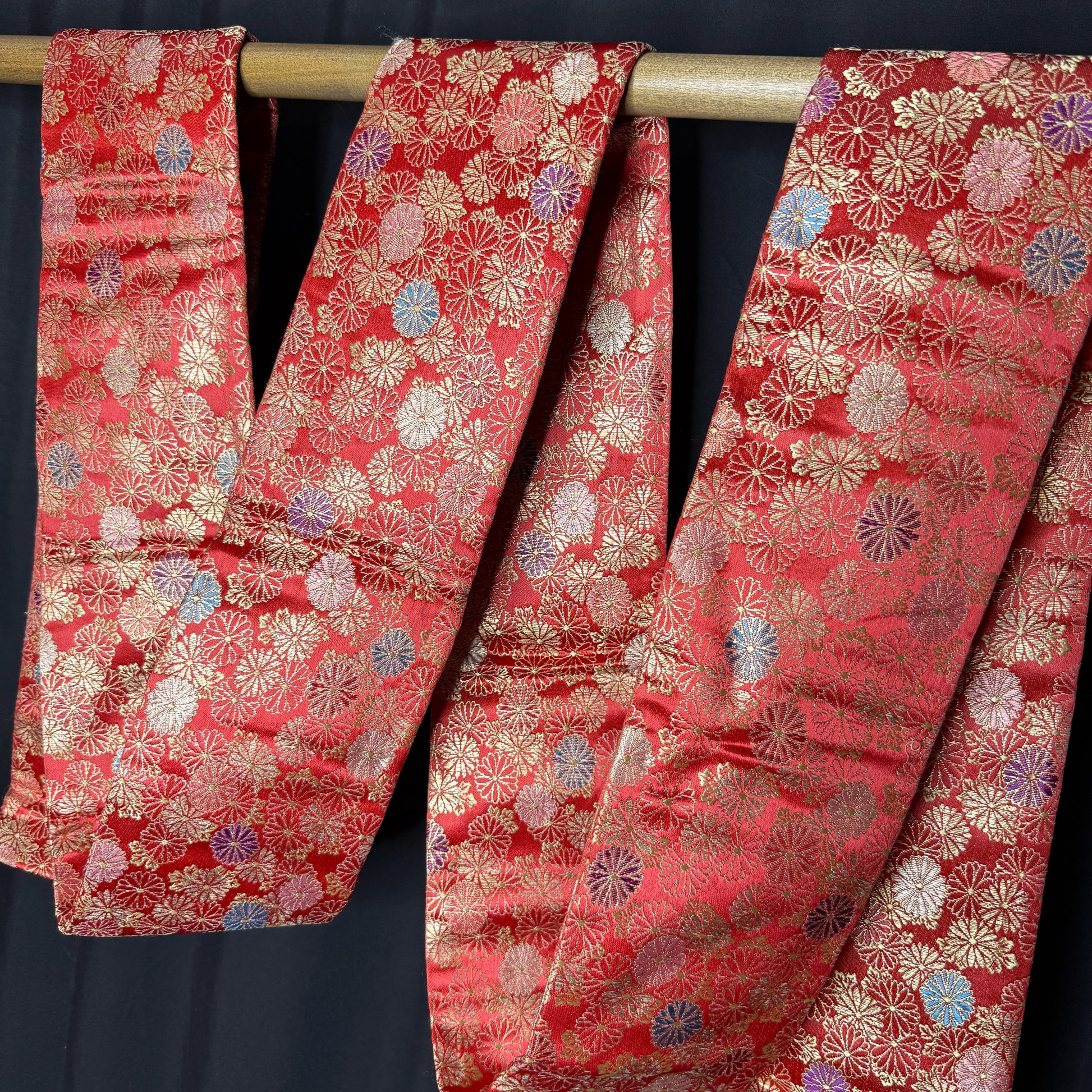 Bursting with festive cheer, this luminous red obi was richly woven with gold chrysanthemums and shimmering touches of pink, blue, and purple. The brocade catches the light beautifully and creates an elegant look that pairs perfectly with seasonal styling. The bold floral pattern symbolizes celebration, longevity, and joy!
