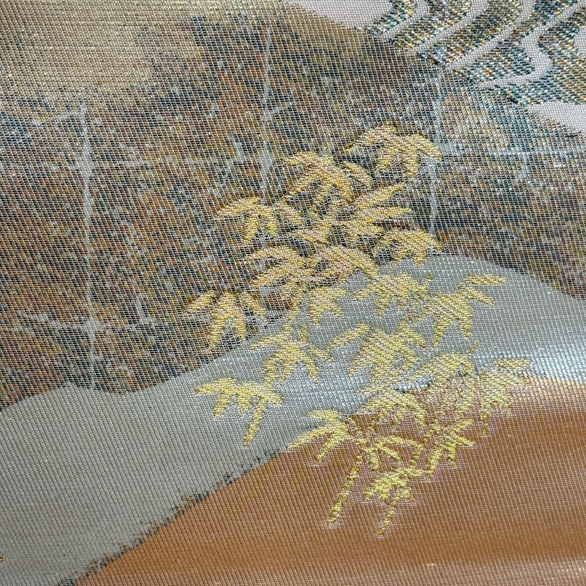 Softly luminous and layered with detail, this tapestry captures a woven landscape of rolling hills that feel both serene and expansive. The design unfolds in bands of gold, champagne, and warm earth tones, with delicate motifs of trees, flowing water, and subtle geometric accents tucked into the scene. The hills echo traditional Japanese landscape aesthetics, where nature is stylized into gentle, rhythmic forms that suggest calm, continuity, and the passage of seasons.