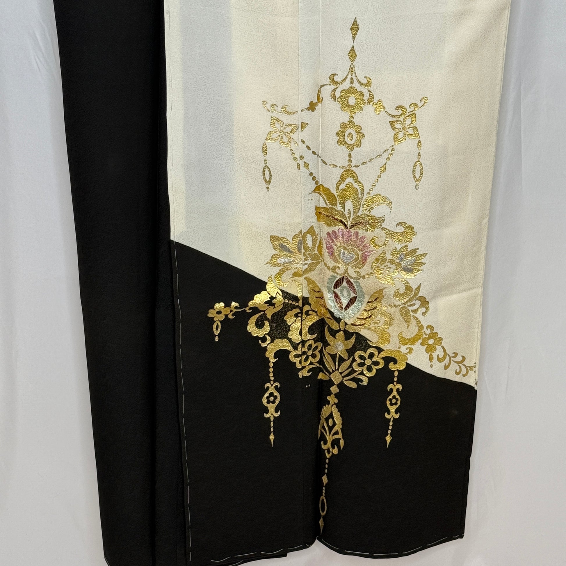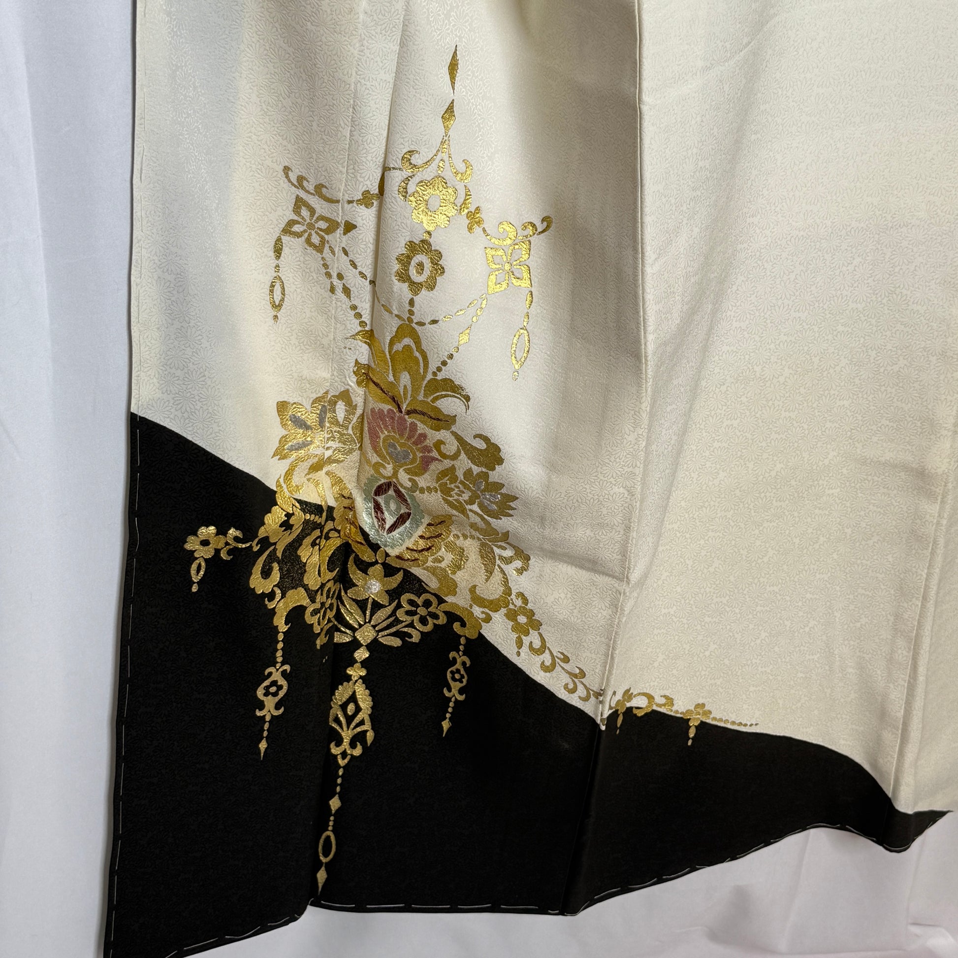 Command the room without saying a word. This striking asymmetrical kimono contrasts soft ivory with black - night and day, good and evil, rich and poor? On the black portion, we find an ornate arabesque floral motif rendered in radiant gold leaf and metallic thread embroidery. The cascading design flows diagonally across the body and look closely to see the floral tone-on-tone jacquard.