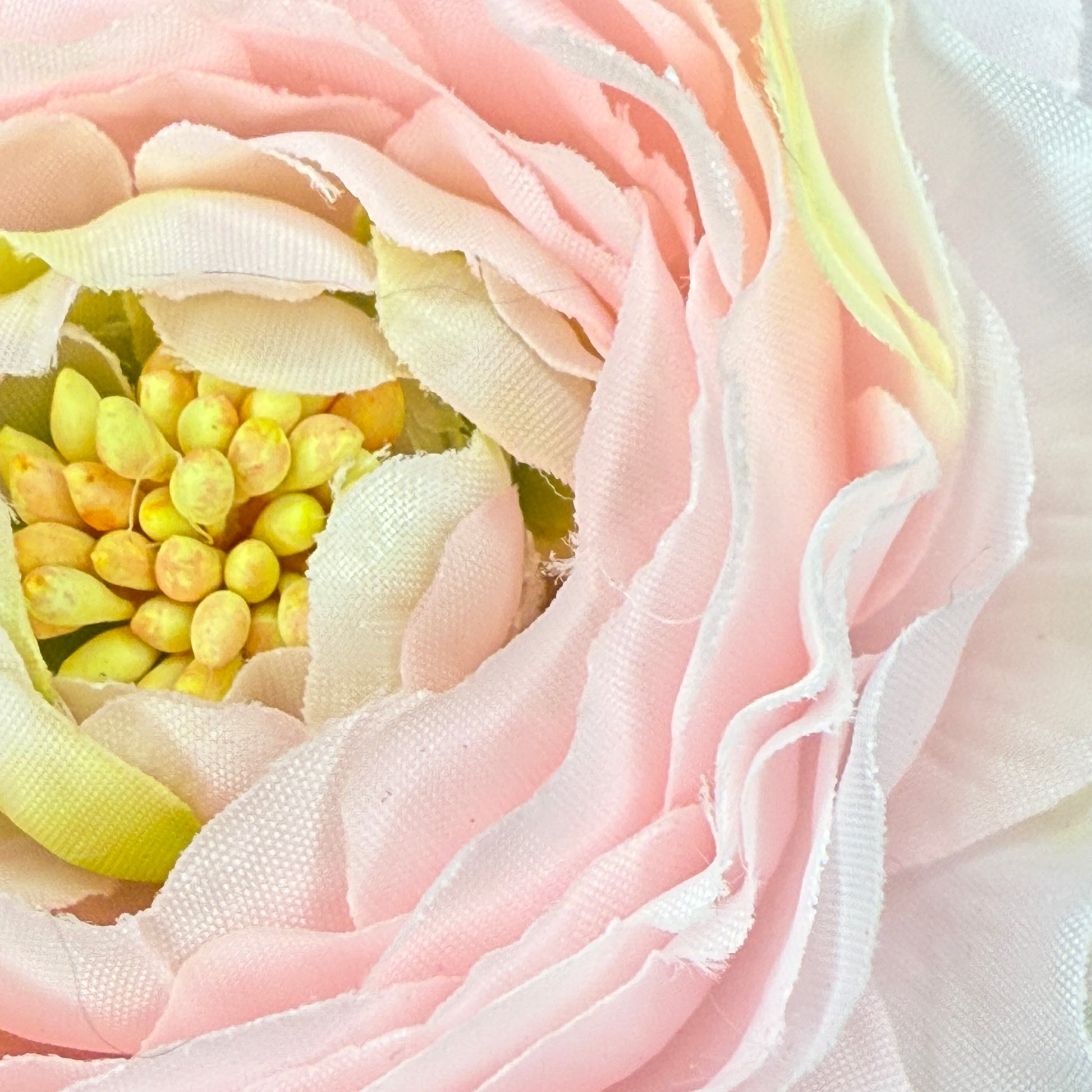 Softly layered in shades of blush pink and ivory, this voluminous peony clip radiates timeless grace. Each petal is delicately shaped to mimic the organic beauty of a flower in full bloom, with a cluster of pale yellow stamens at its heart for a touch of warmth and depth. The dual clip and pink backing makes it easy to wear in the hair, attach to a sash, or adorn a kimono ensemble. Its gentle hues and lush texture evoke early spring mornings when petals drift like clouds.