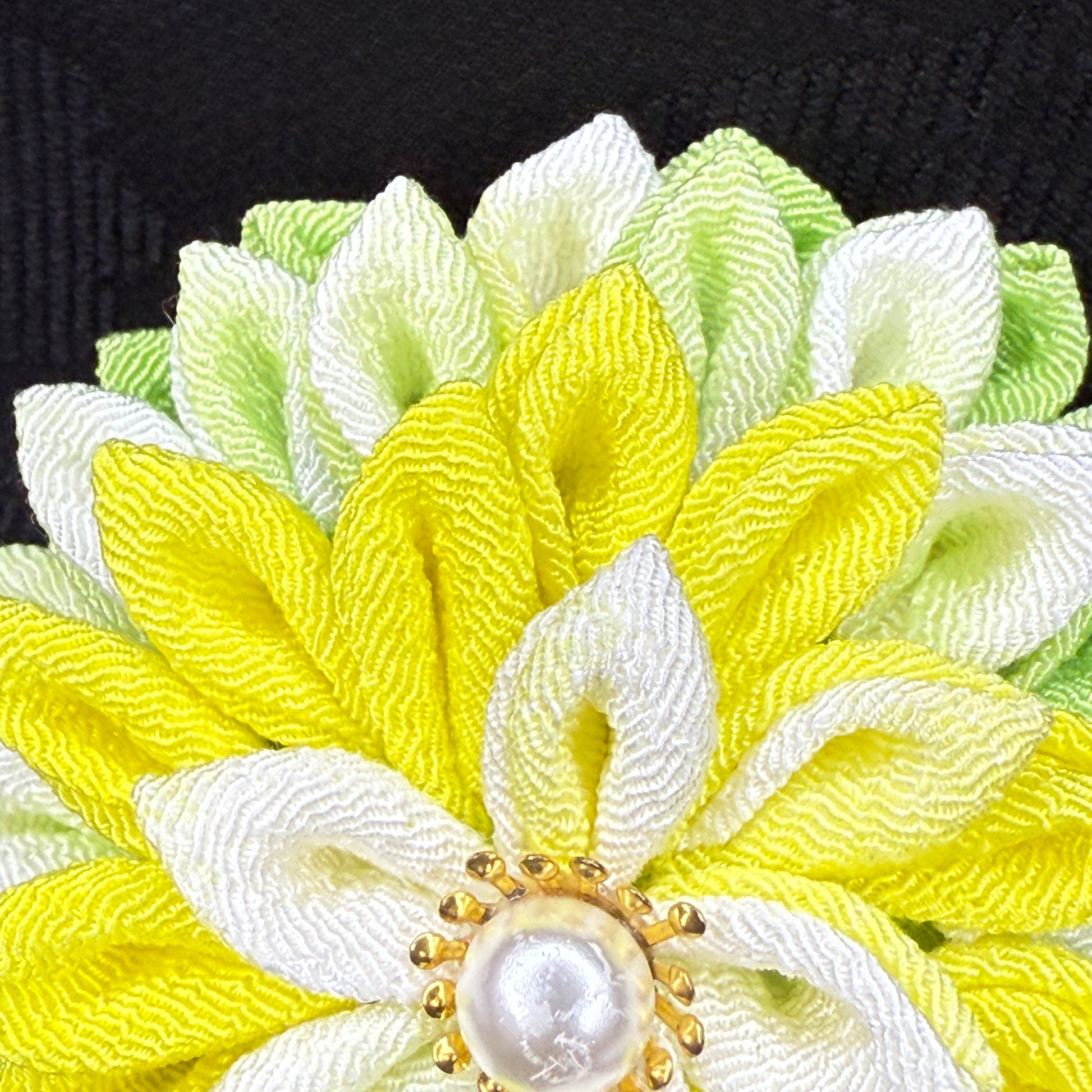 Bright and uplifting, this handmade kanzashi hair clip radiates the warmth of bright sunlight. Layered fabric petals in soft green, white, and sunny yellow form a perfect chrysanthemum bloom, centered with a pearlescent and golden bead accent that catches the light beautifully. Crafted with the traditional tsumami pinching technique, it reflects the care and precision of classic Japanese floral art. Versatile backing with a clip and pin.