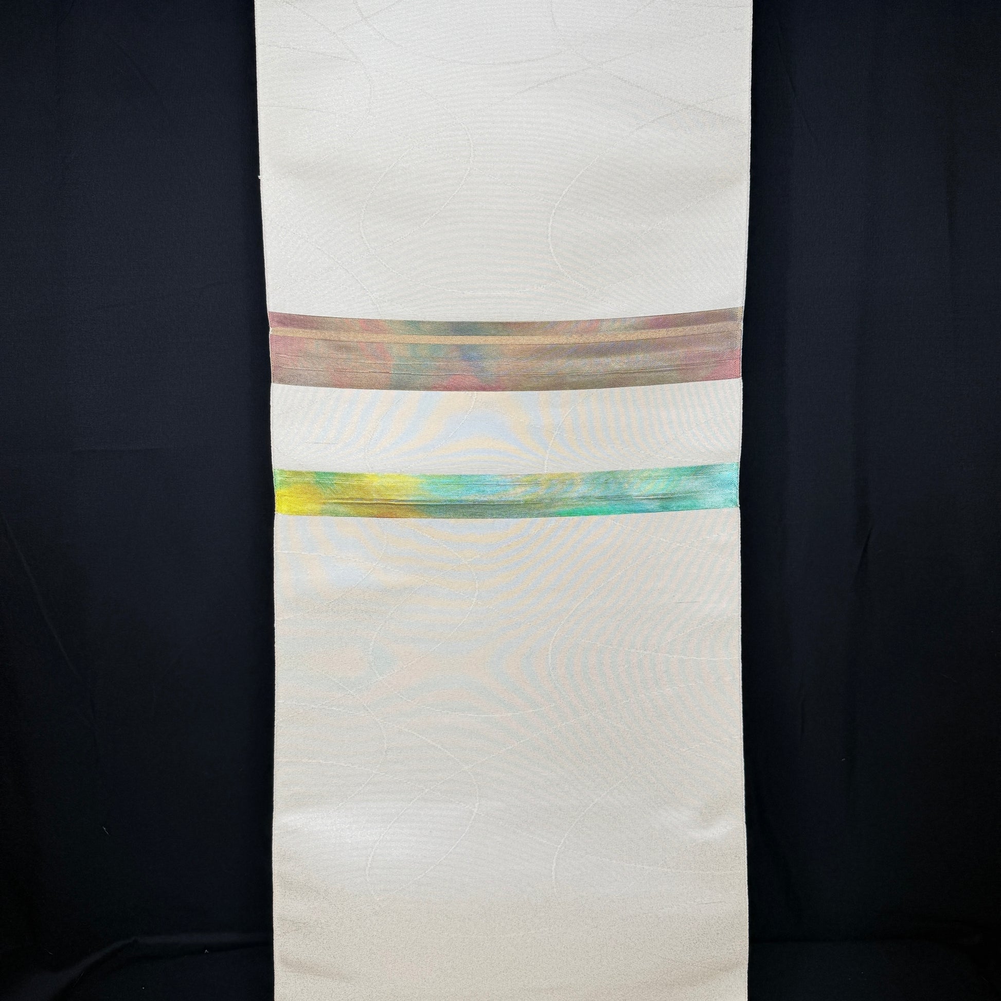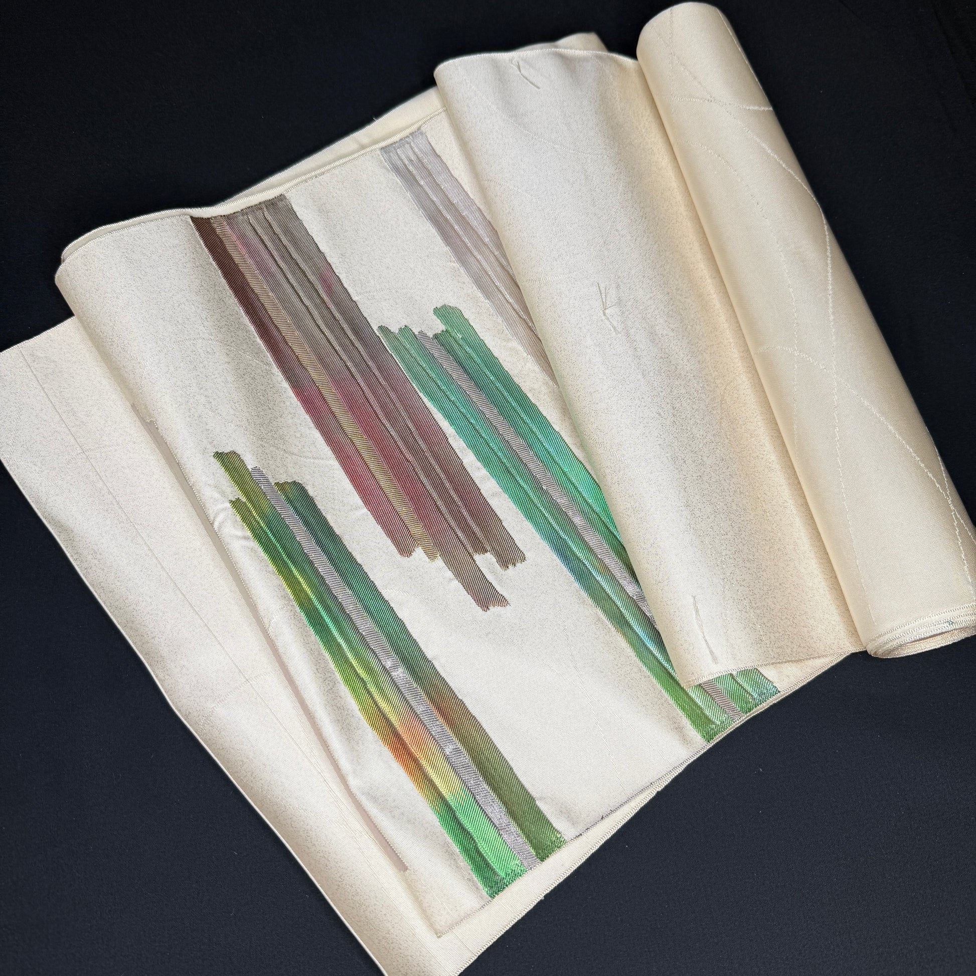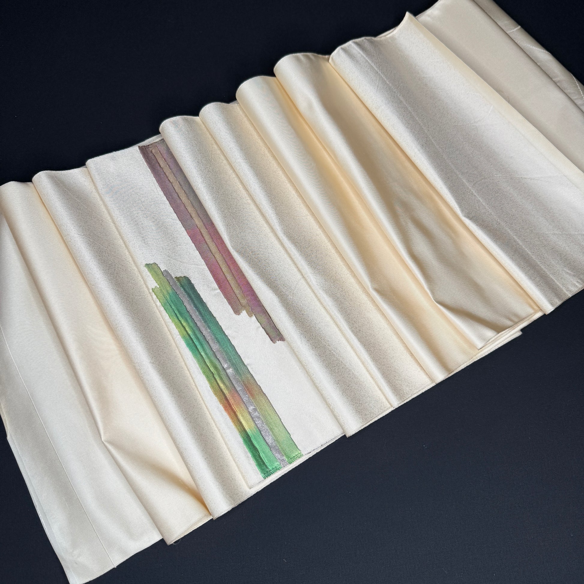A quietly compelling study in texture and tone, this vintage nagoya obi bolt features an abstract arrangement of elongated, painterly bands woven onto a swirled jacquard background. Muted greens, earthy browns, silvery grays, and shimmering accents drift across the surface, creating a modern, almost architectural feel.