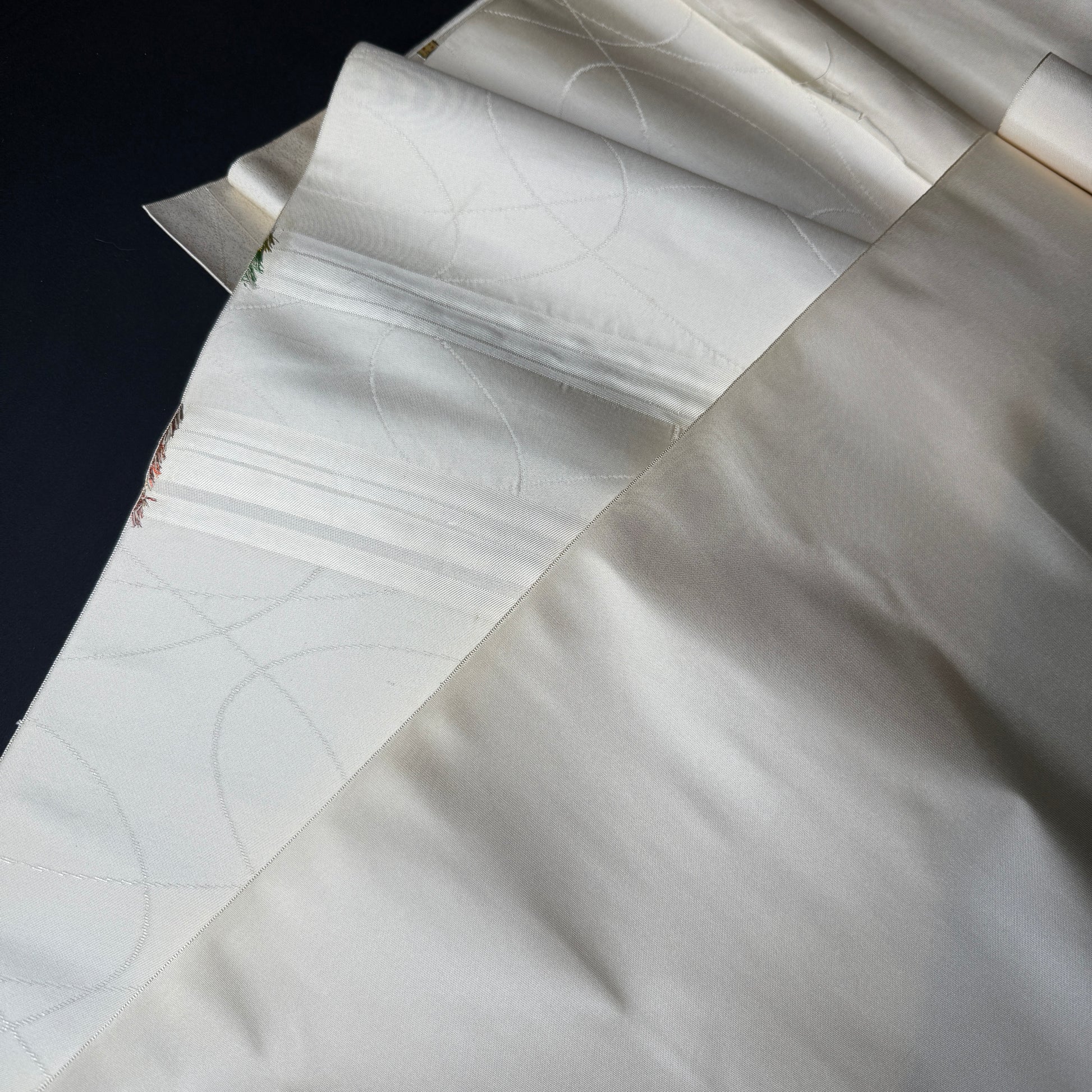 A nagoya obi is a semi-formal obi with a partially sewn structure, featuring a wide decorative element at the bow end and a smaller one on the narrower belt section. This bolt has not yet been sewn into the nagoya style but the patterning is set to do so.