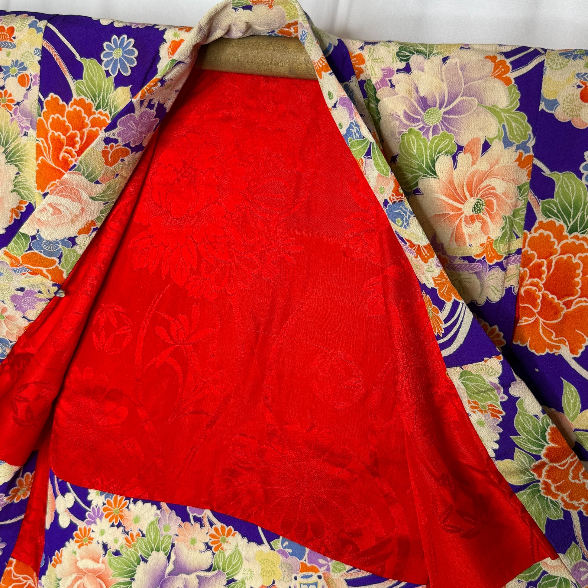 This vintage padded Japanese haori jacket is a celebration of color and form, with bold blossoms flowing across a deep purple background. Large peonies take center stage, their lush petals symbolizing prosperity and beauty, while chrysanthemums and camellias add charm and layers of meaning. Look closely to notice the florals are arranged on folding fans and tied together with flowing cords.