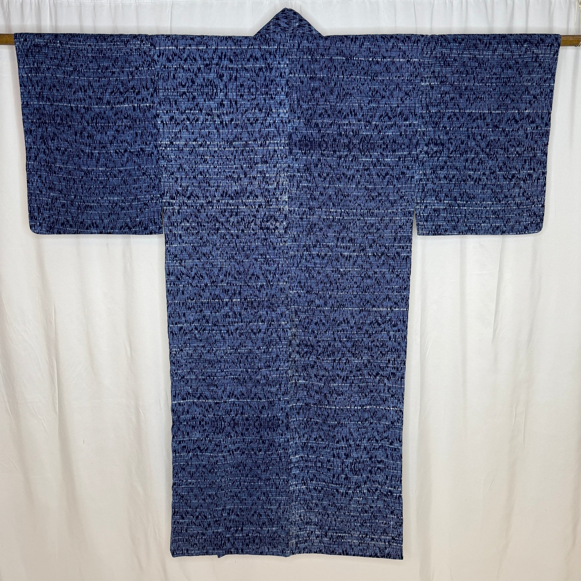 Drape yourself with a pattern that feels alive in motion. This vintage cotton yukata is covered in a mesmerizing cascade of micro lines and staggered marks, creating a look similar to kasuri (ikat) style weaving. The effect is rich, rhythmic, and wonderfully modern, even though the piece carries the charm of mid-century craft.