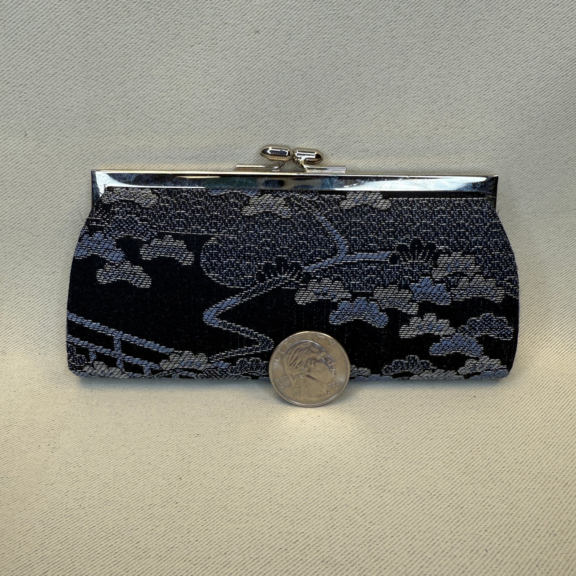 This Japanese clutch purse captures quiet sophistication through shades of blue. The intricate weave gives the impression of moonlight filtering through pine branches over a tranquil bridge scene.