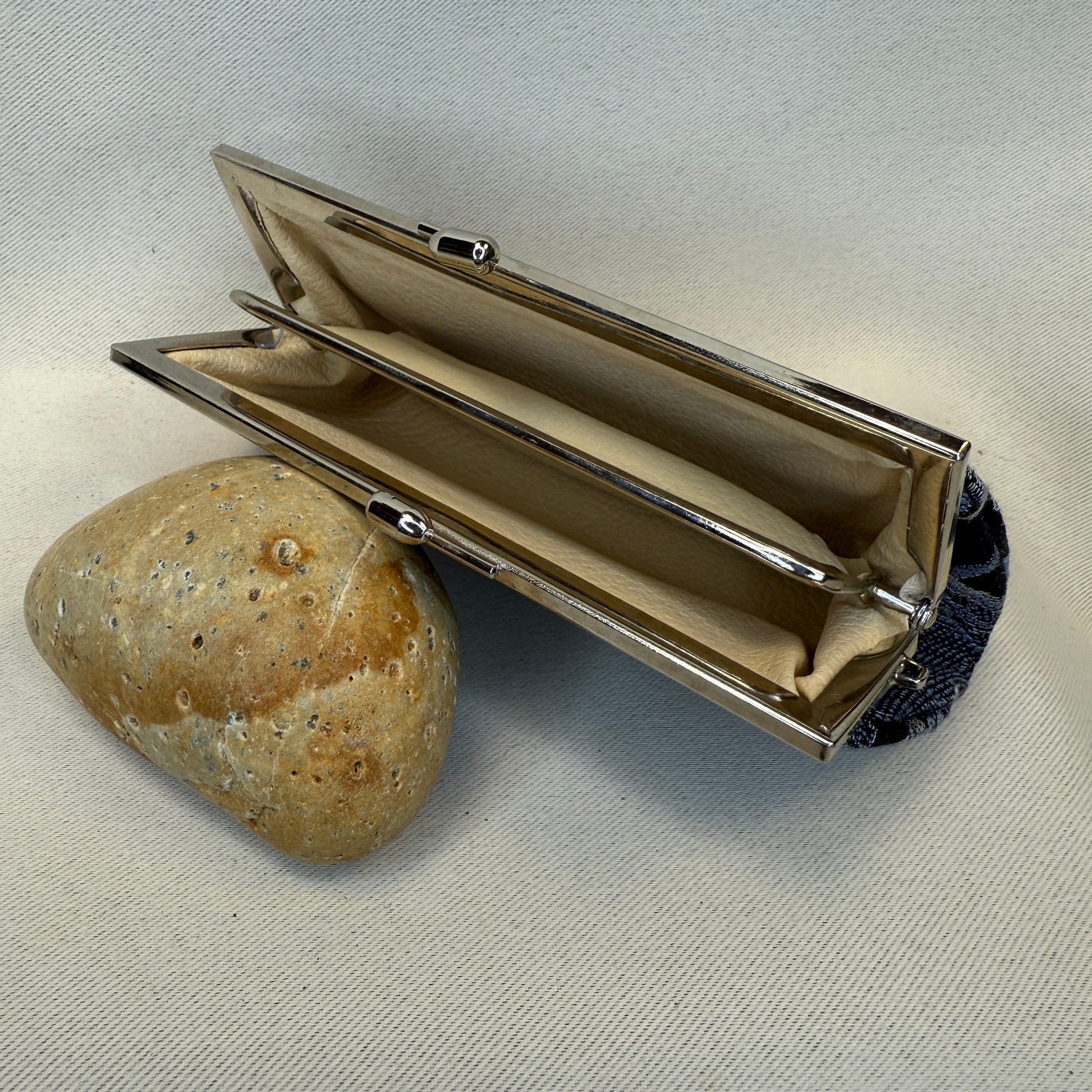 Framed in polished silver-tone metal with a kiss-lock clasp, it opens to reveal a softly lined cream interior with two compartments.