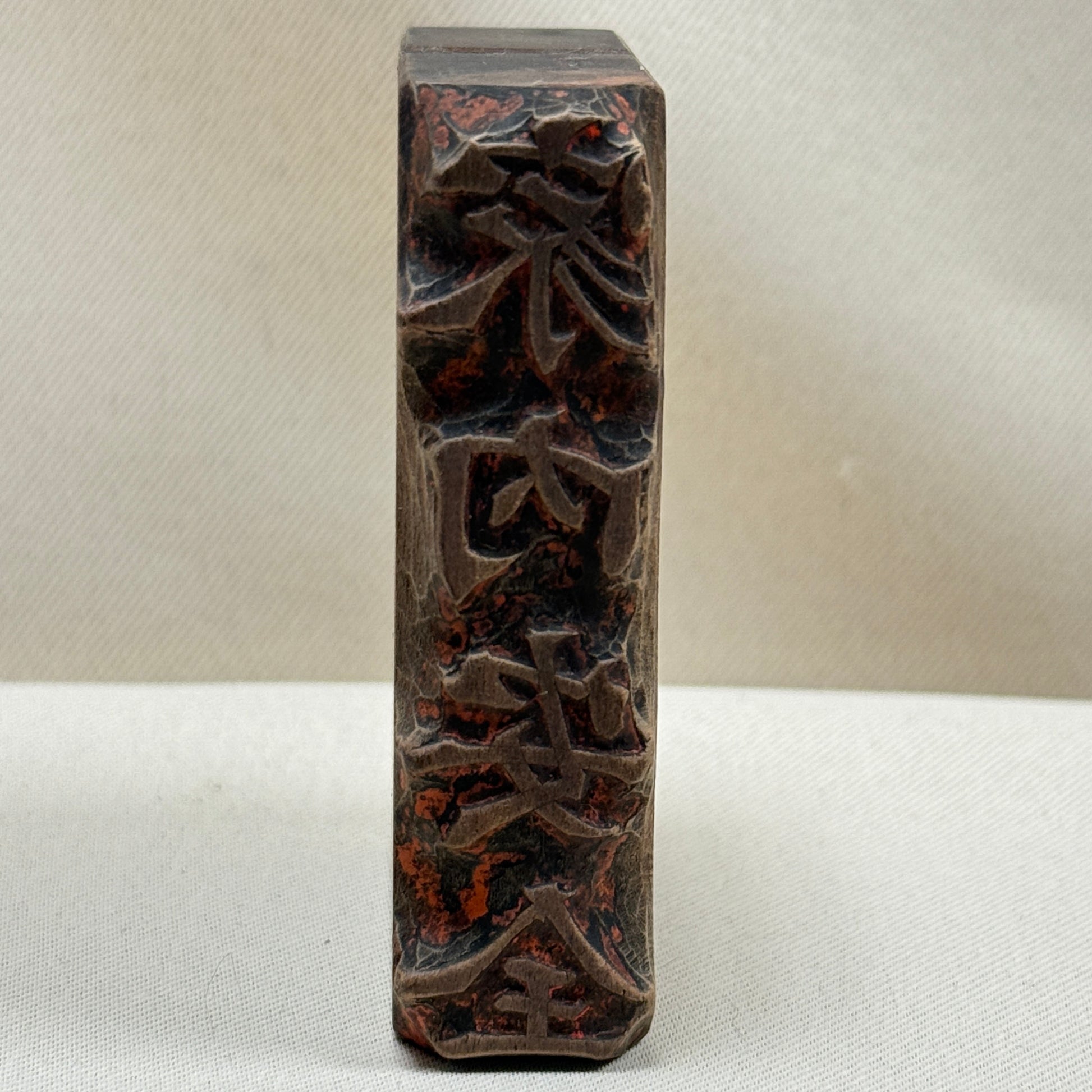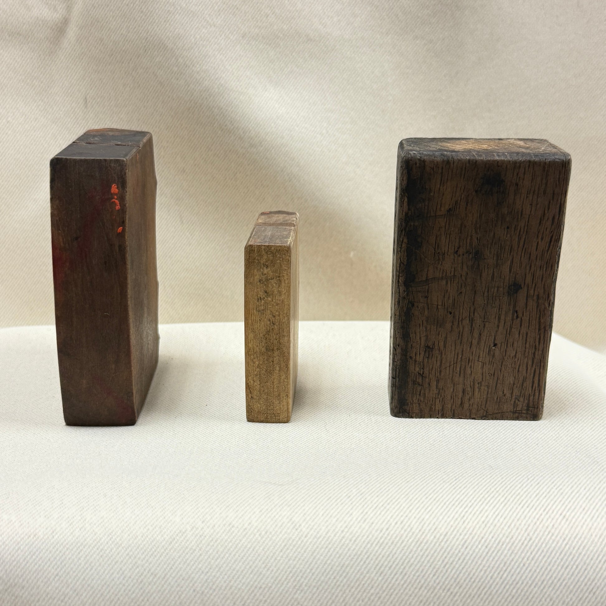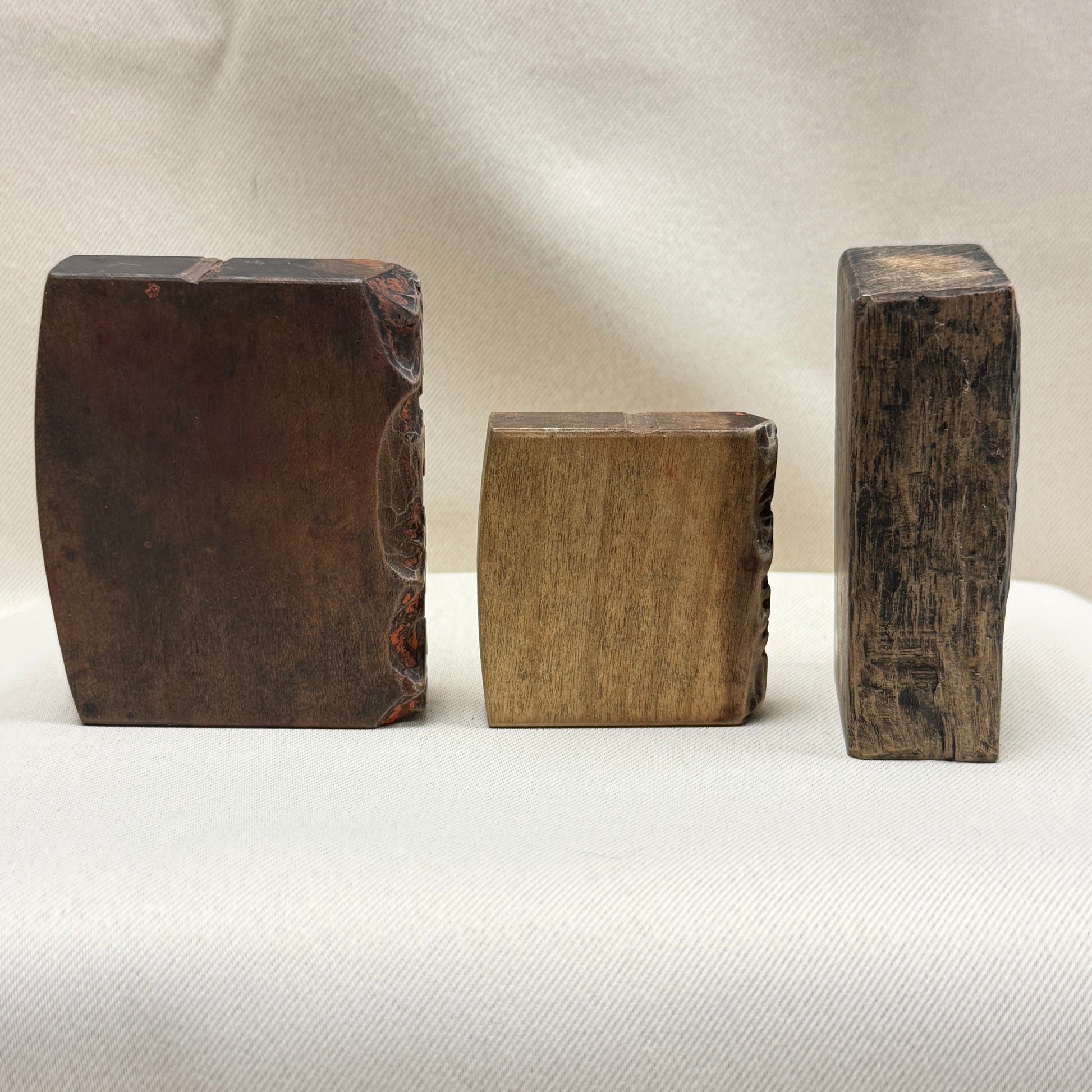 The darkened surfaces, ink staining, and worn carving marks reflects their history as functional printing tools used repeatedly in traditional Japanese printing practices.