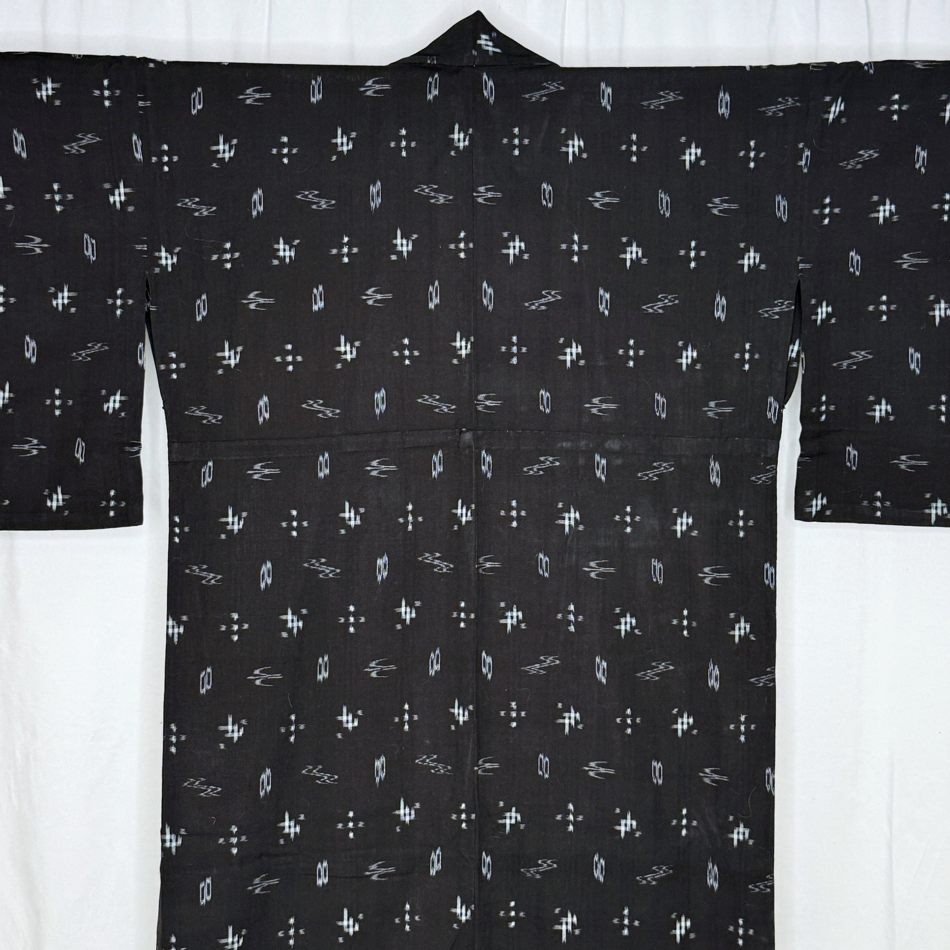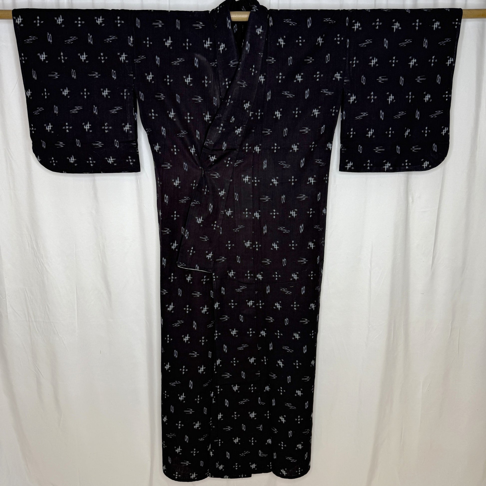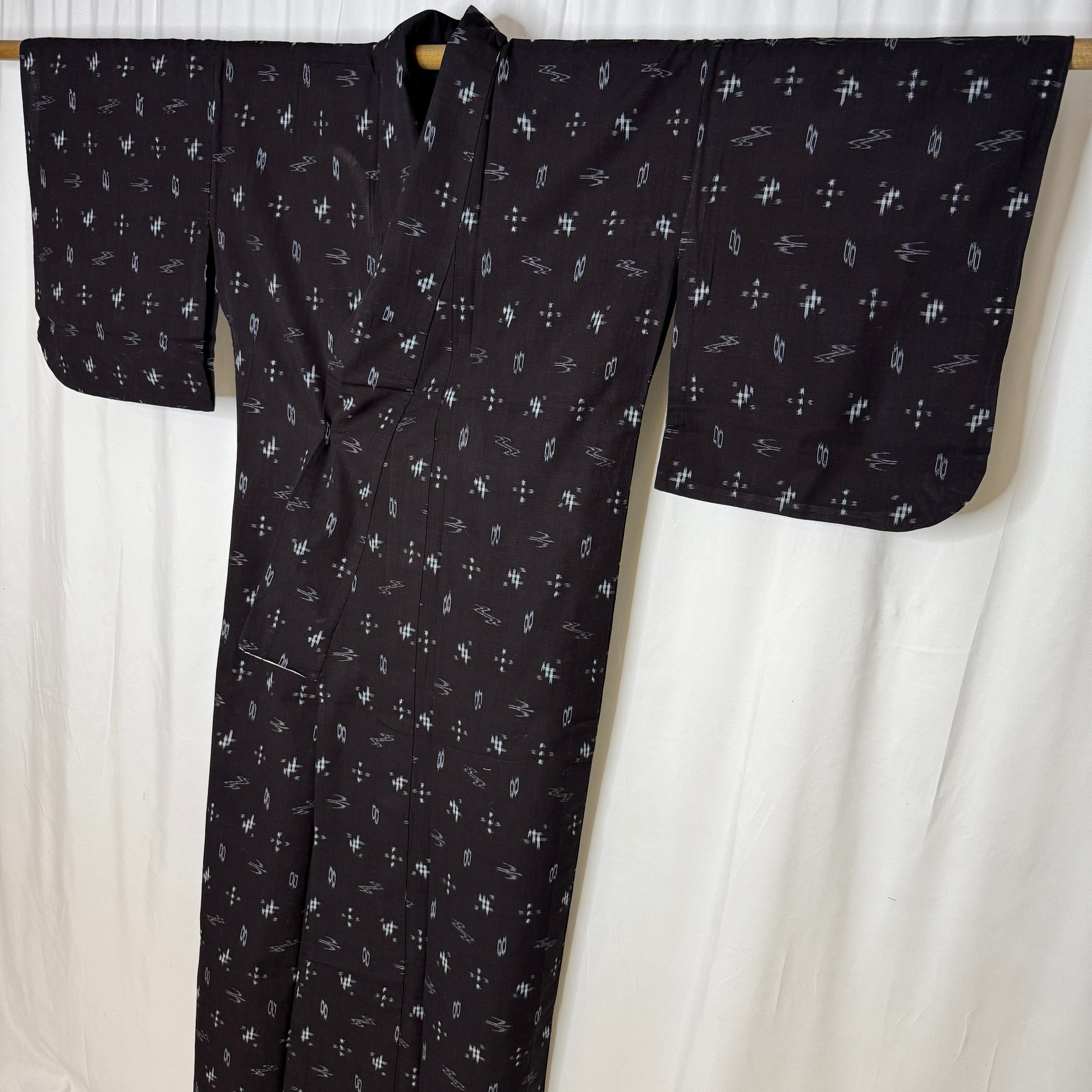 Like constellations scattered across a summer sky, this indigo - almost black - kimono features a light blue ikat weave. The pattern includes many different small traditional motifs, and this required time-intensive work to prepare and weave. This is a double-ikat weave, meaning that both the warp and weft threads were resist-dyed before weaving.