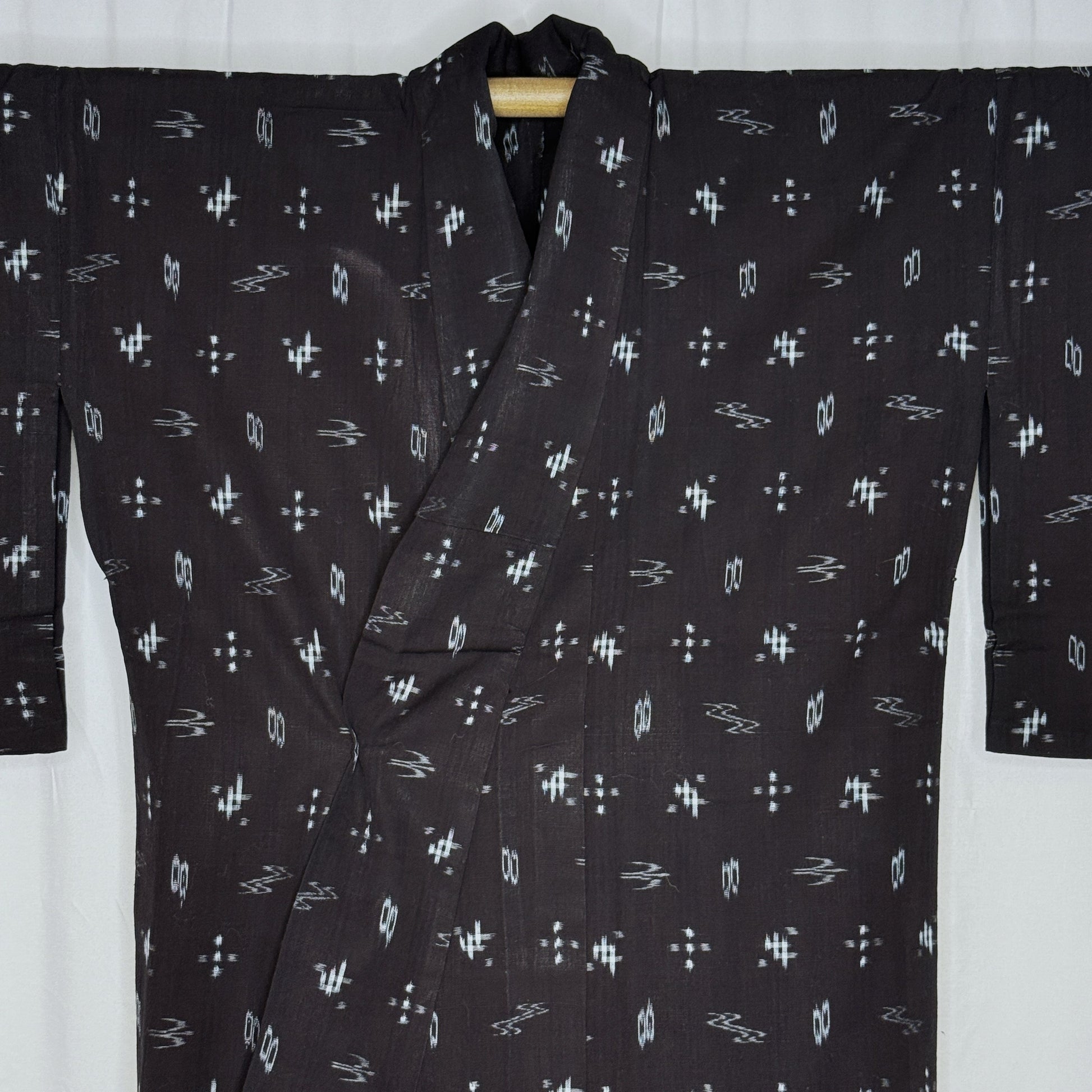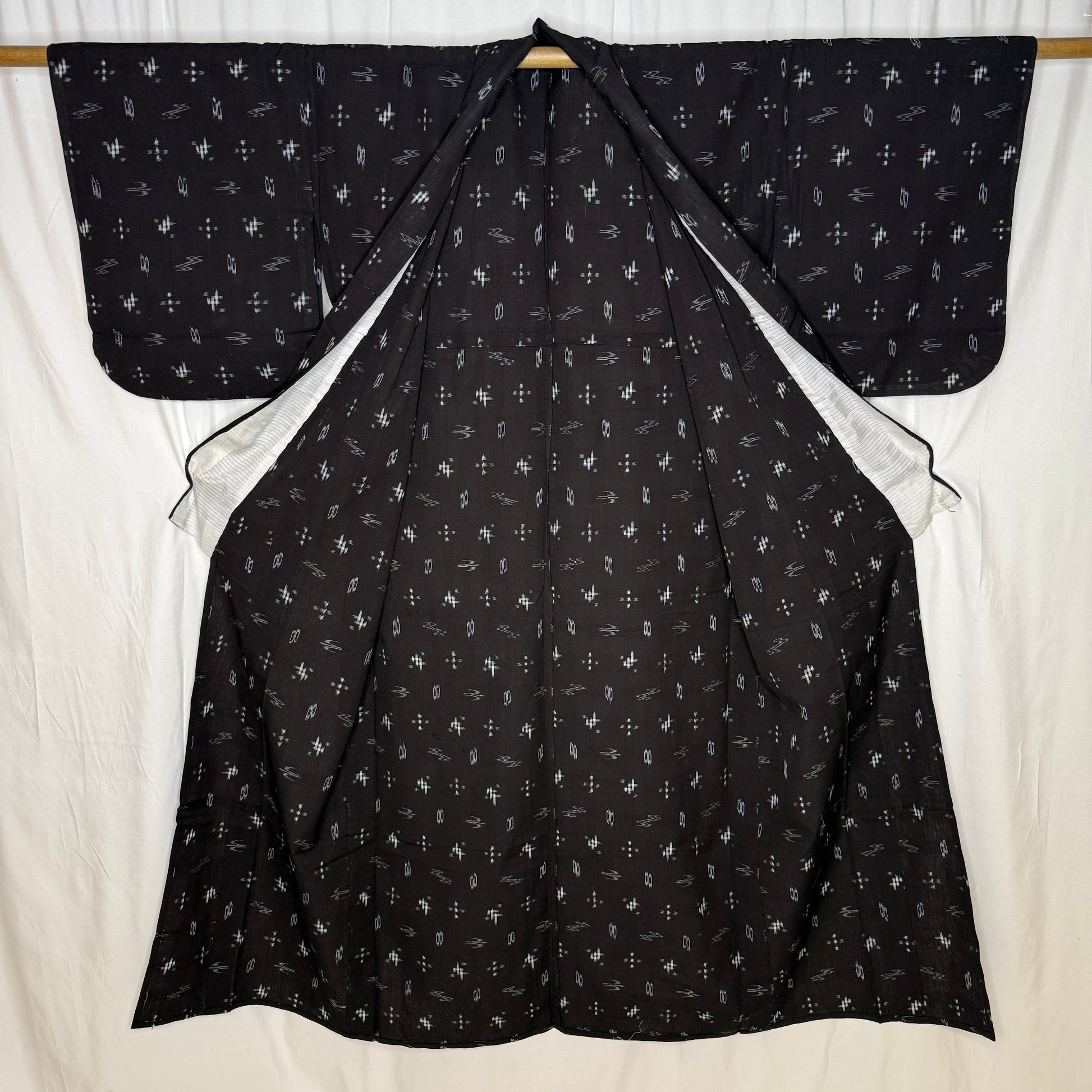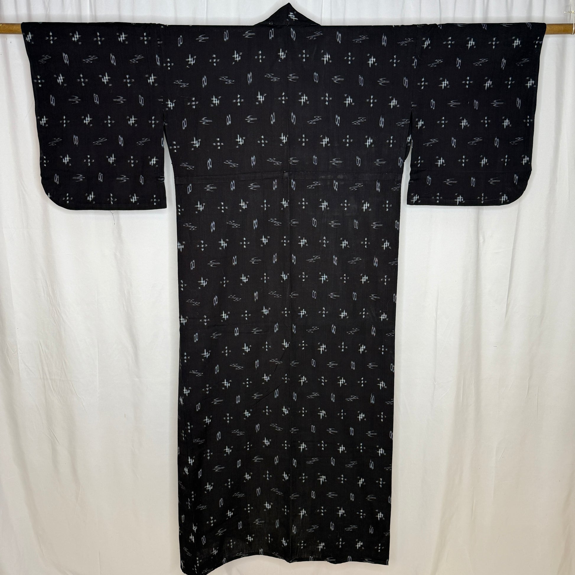 Like constellations scattered across a summer sky, this indigo - almost black - kimono features a light blue ikat weave. The pattern includes many different small traditional motifs, and this required time-intensive work to prepare and weave. This is a double-ikat weave, meaning that both the warp and weft threads were resist-dyed before weaving.