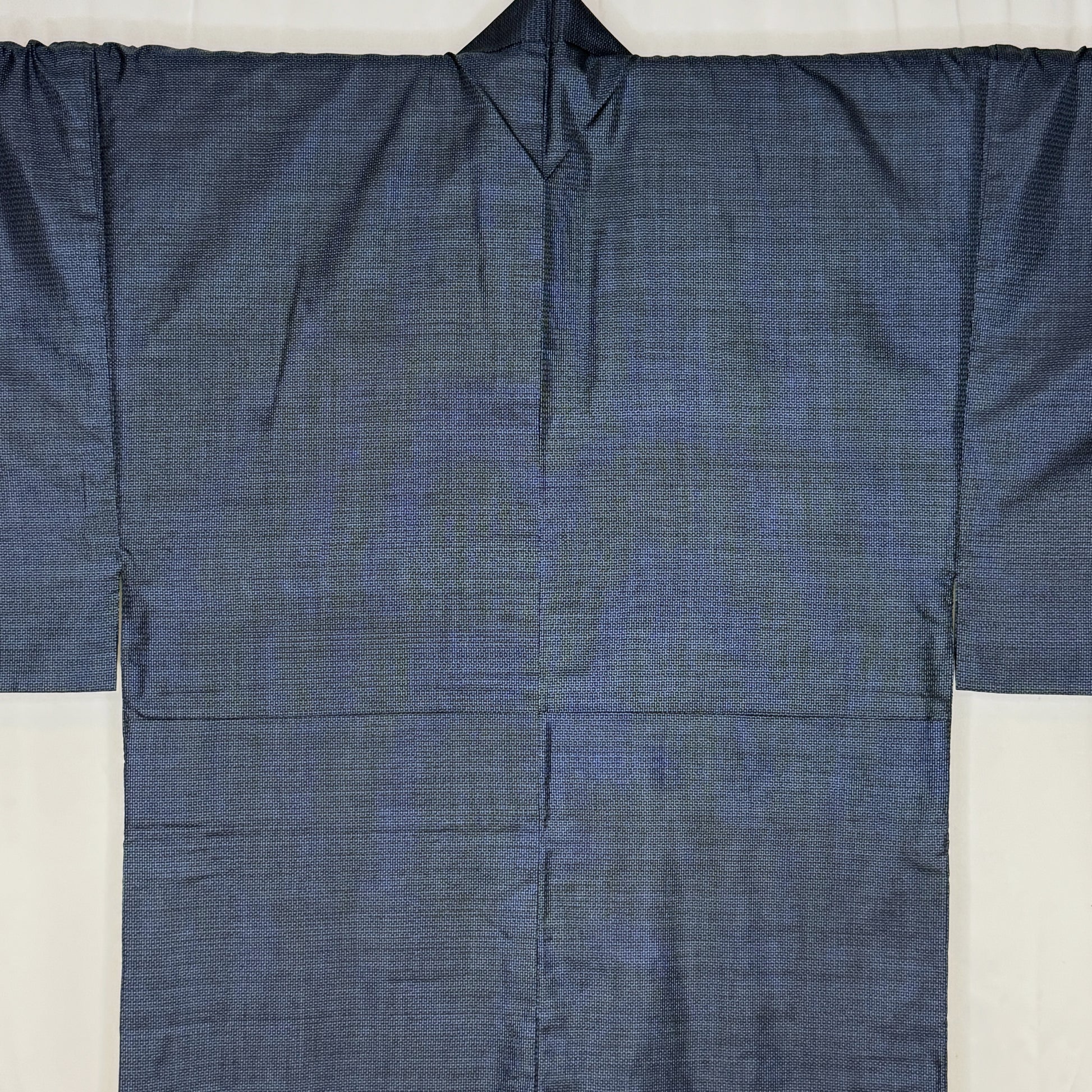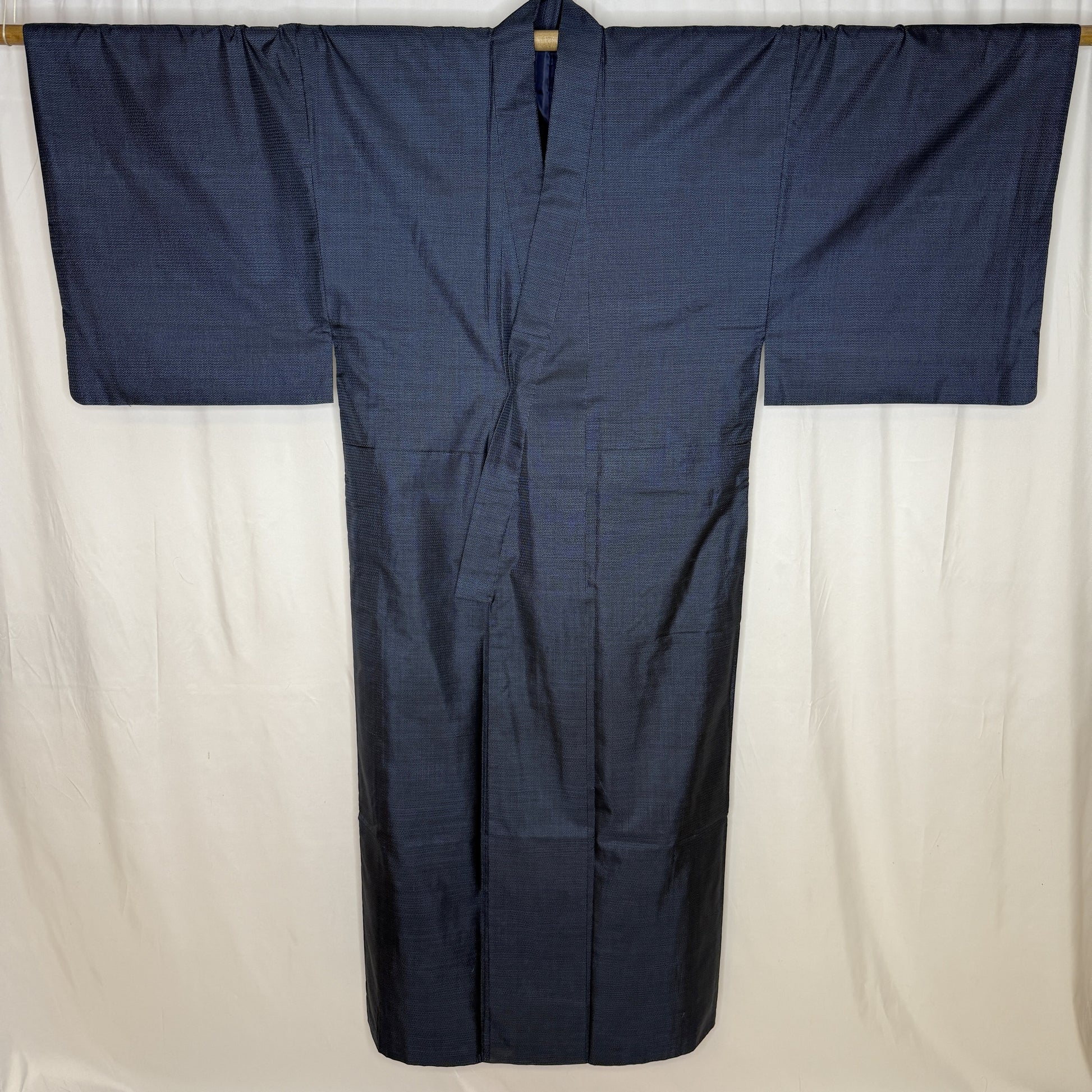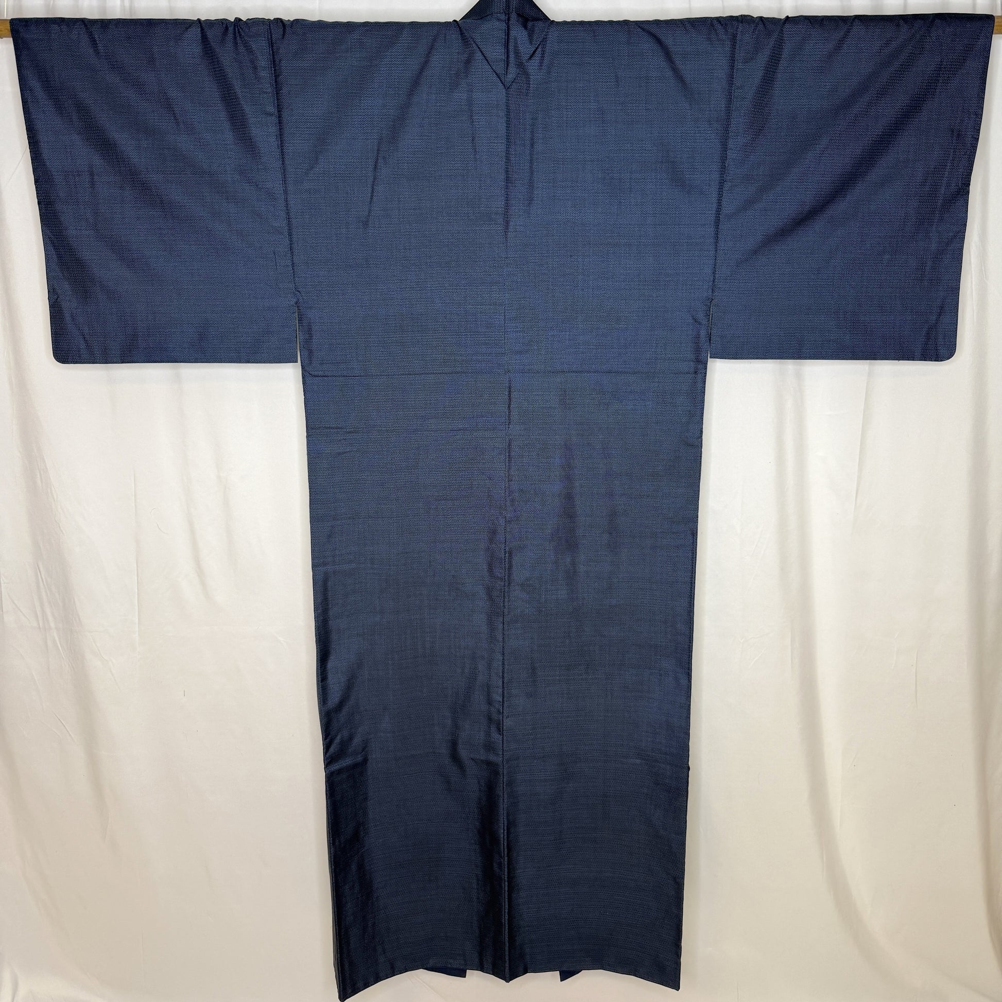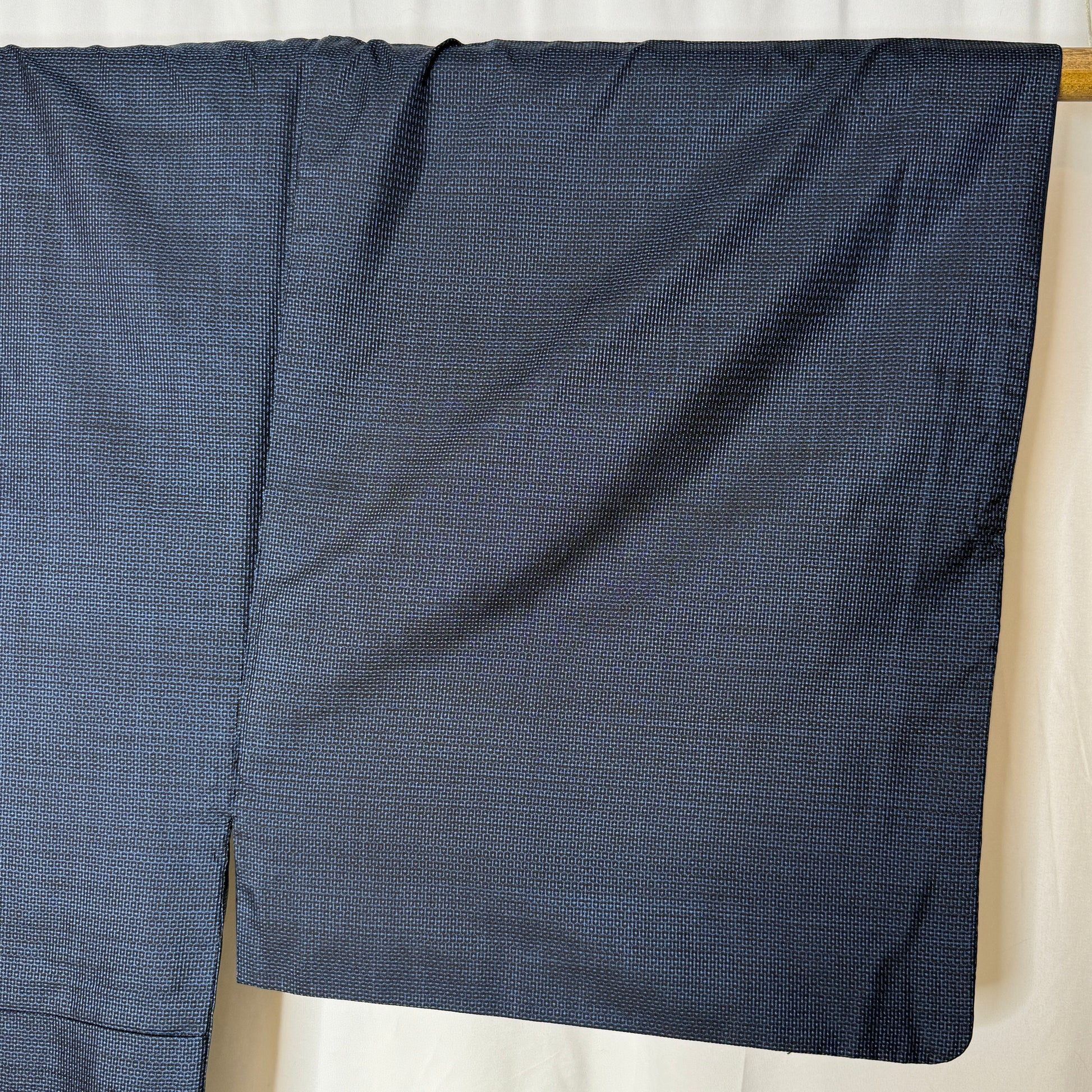 This classic men's kimono carries a quiet sophistication in its deep navy silk, woven with a fine grid pattern that shimmers subtly as it catches the light. Up close, the intricate weave reveals tiny hexagons of blue, creating visual depth reminiscent of rippling water or woven shadow. Fully lined in smooth dark indigo blue silk.