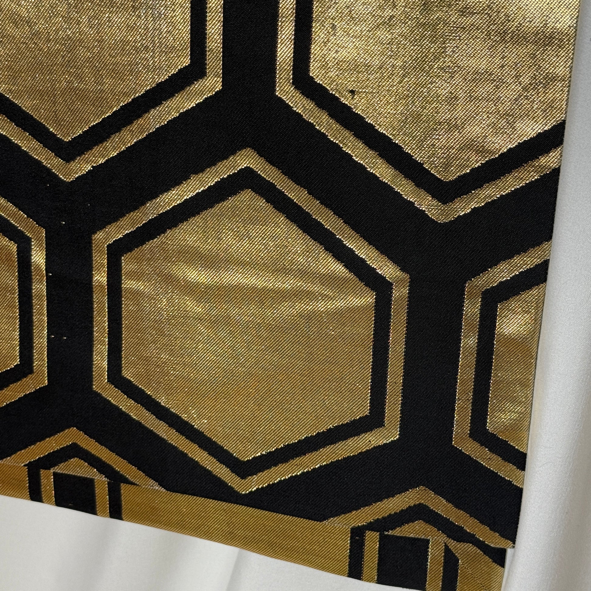 Strength meets shimmer in this commanding gold and black fukuro style obi. Oversized hexagons, inspired by traditional tortoise shell motifs (symbolizing longevity and resilience) glow in rich metallic gold against a dramatic black silk. The scale of the pattern gives it architectural impact, while the luminous weave shifts beautifully in the light.