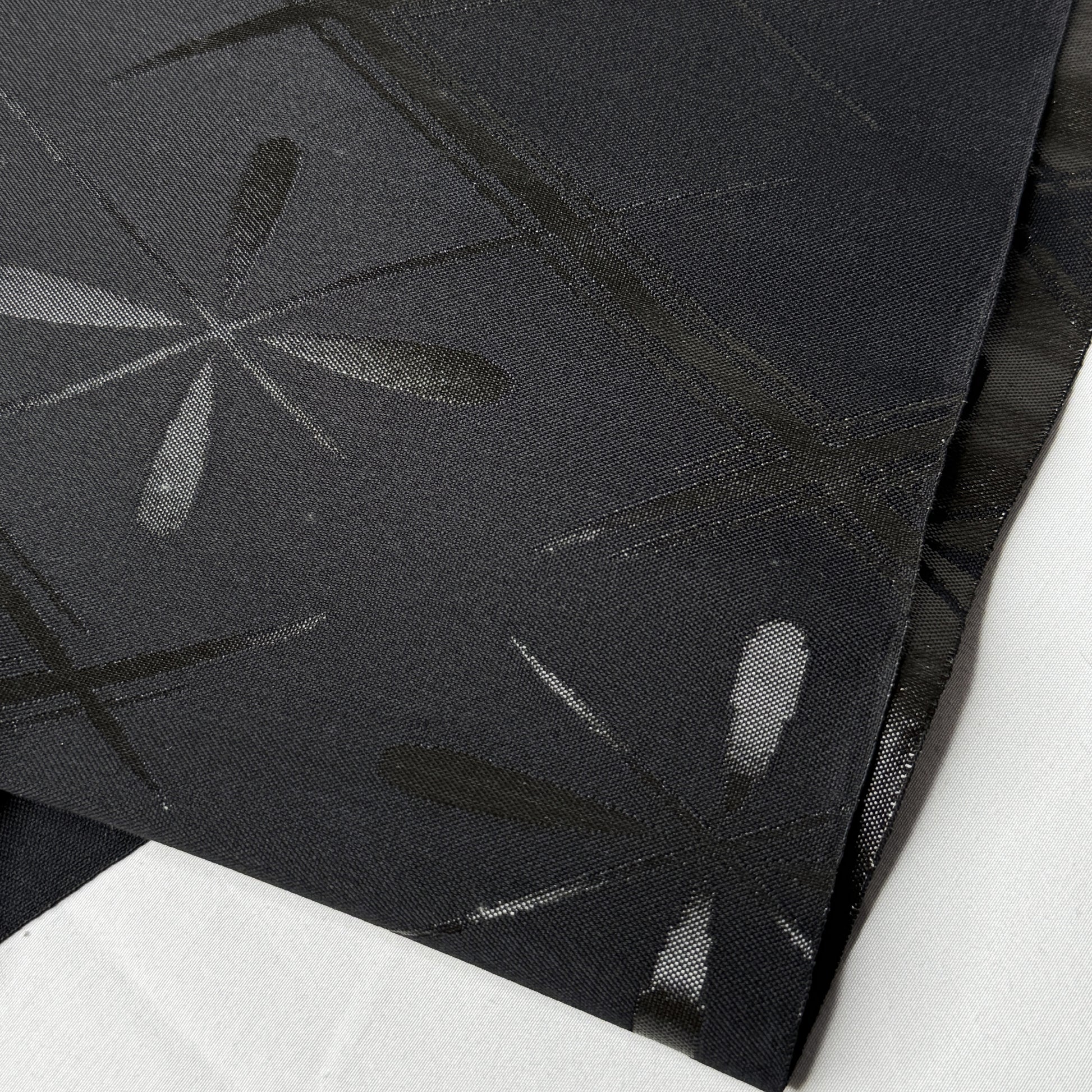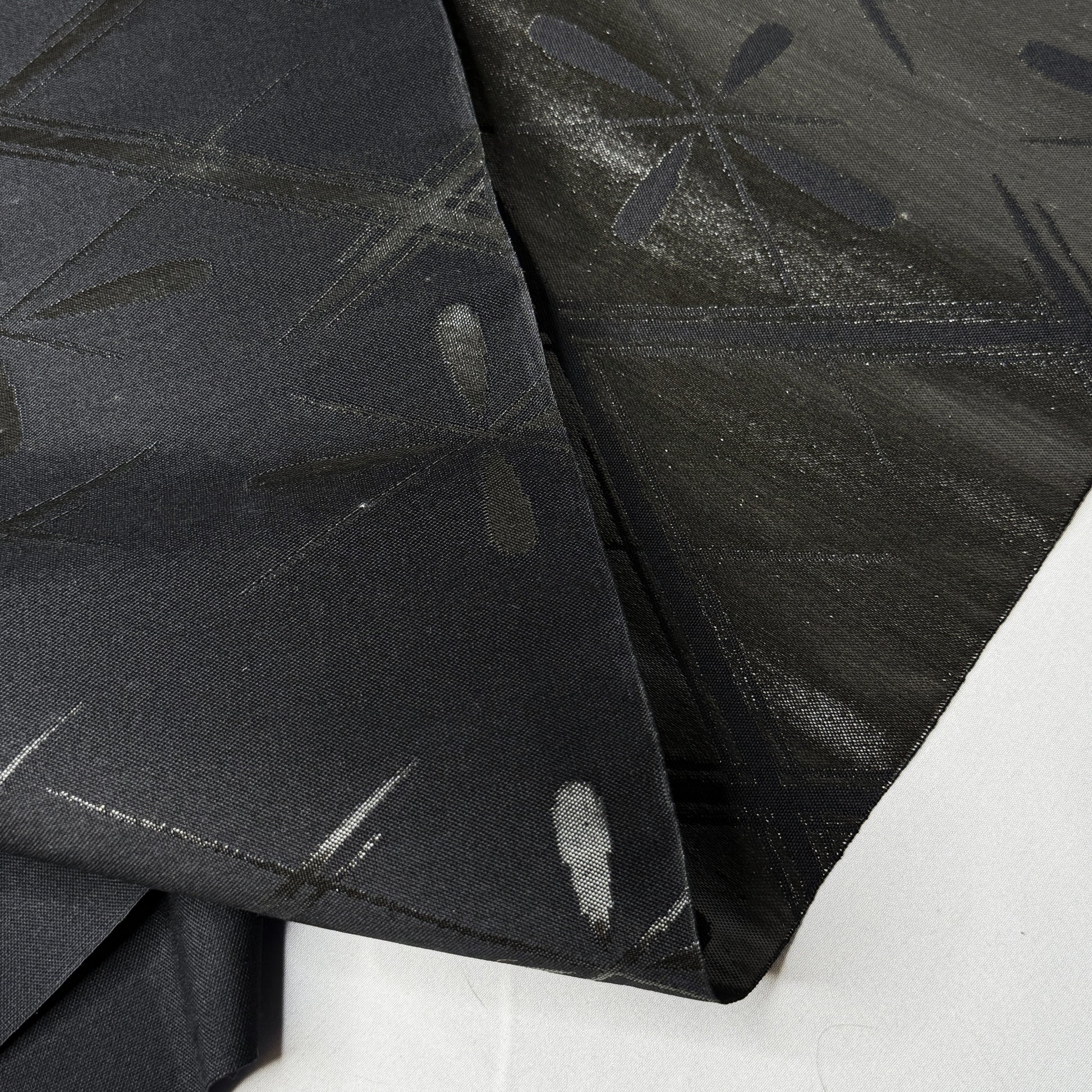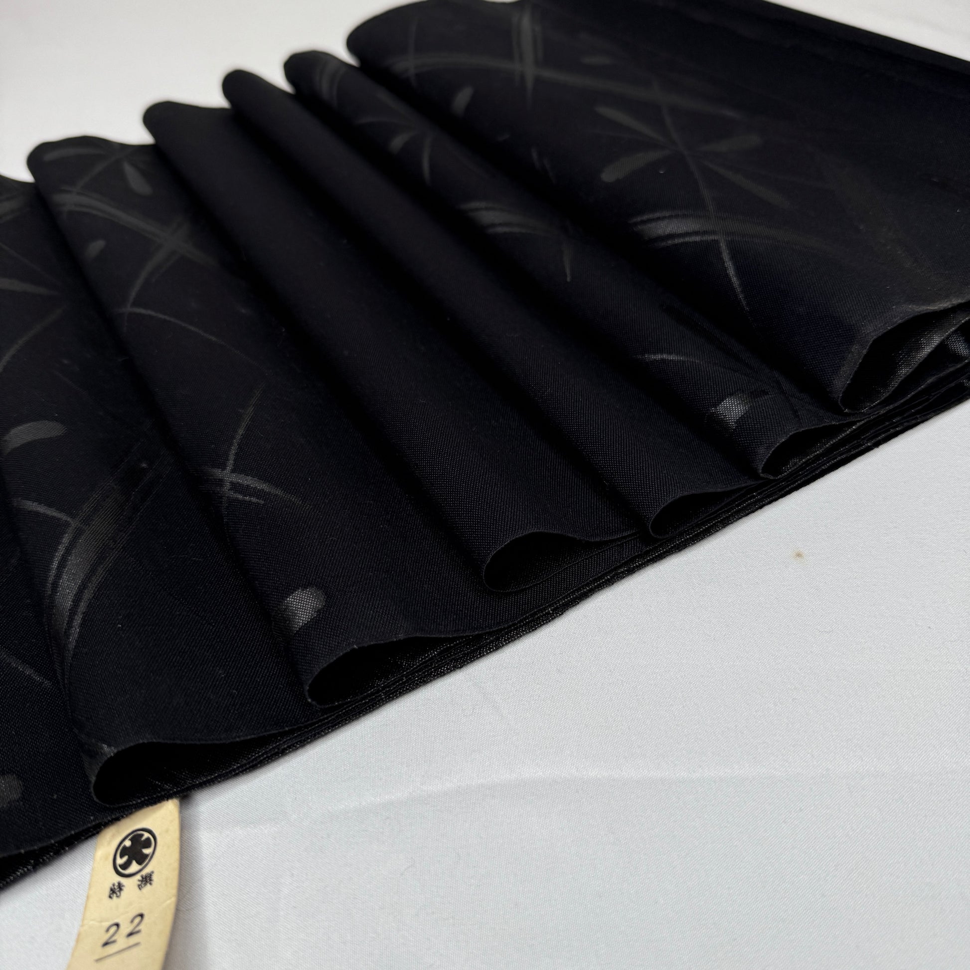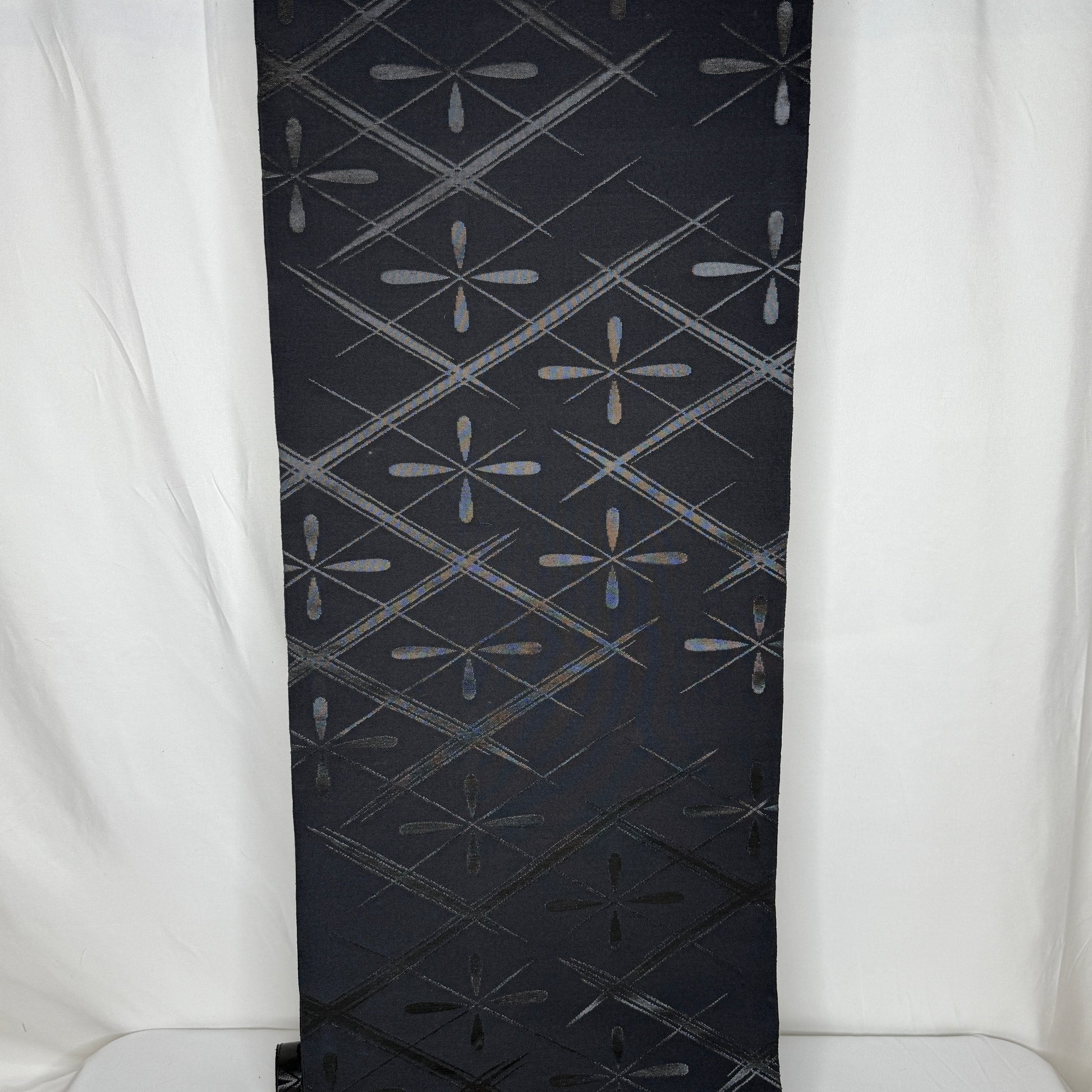 Quietly dramatic, this vintage fukuro style obi fabric bolt draws you in with its deep black silk and subtle, tone-on-tone jacquard patterning. Woven diamonds and intersecting lines emerge softly as the light shifts, creating depth and movement without relying on contrast or color.