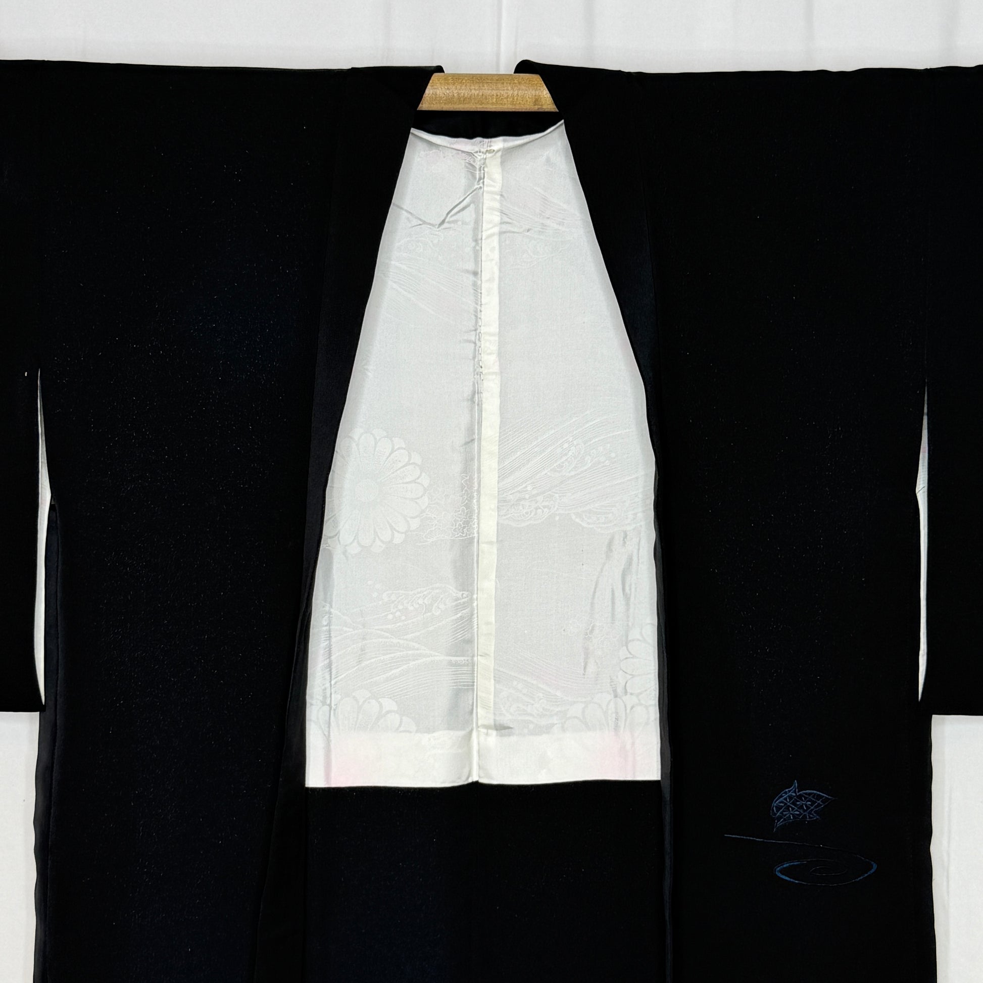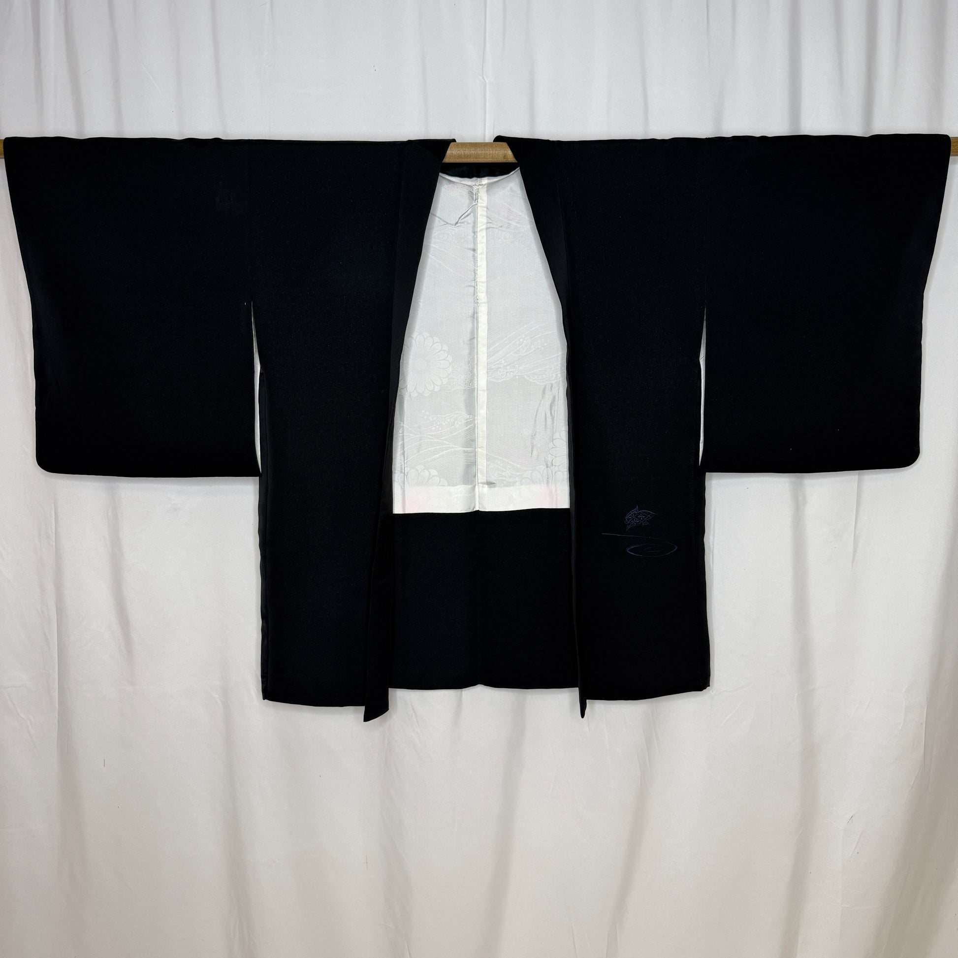 This vintage jacket has a serene, almost cinematic beauty, featuring a subtle embroidered scene of plants embroidered in shades of blue along a flowing stream. The design sits low on the hem for a refined, understated effect that rewards a closer look. The black silk is accented with metallic threads that create a soft sheen and light-catching glitter, but it is subtle, not overpowering. A single, stitched family crest at the back adds formality and tradition.