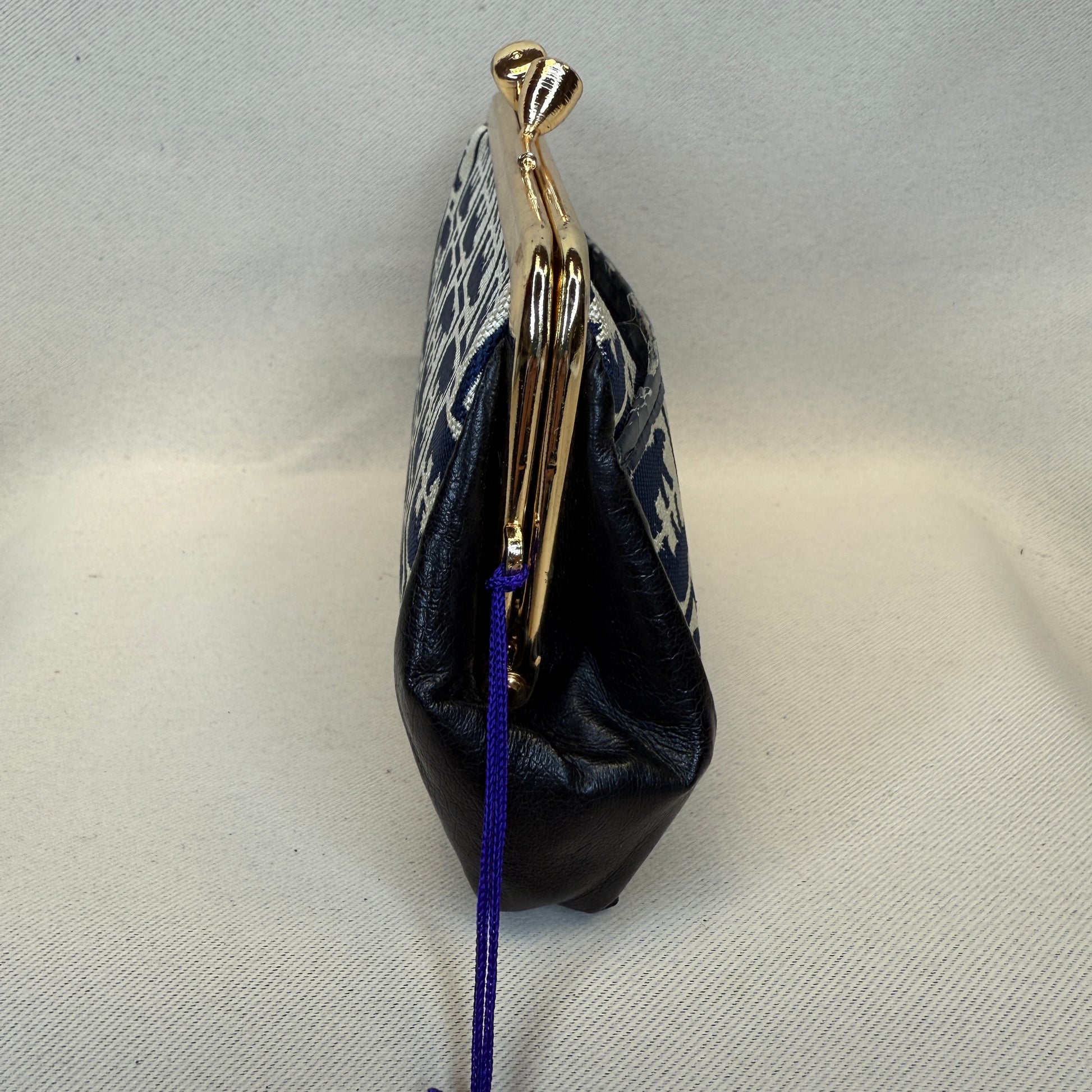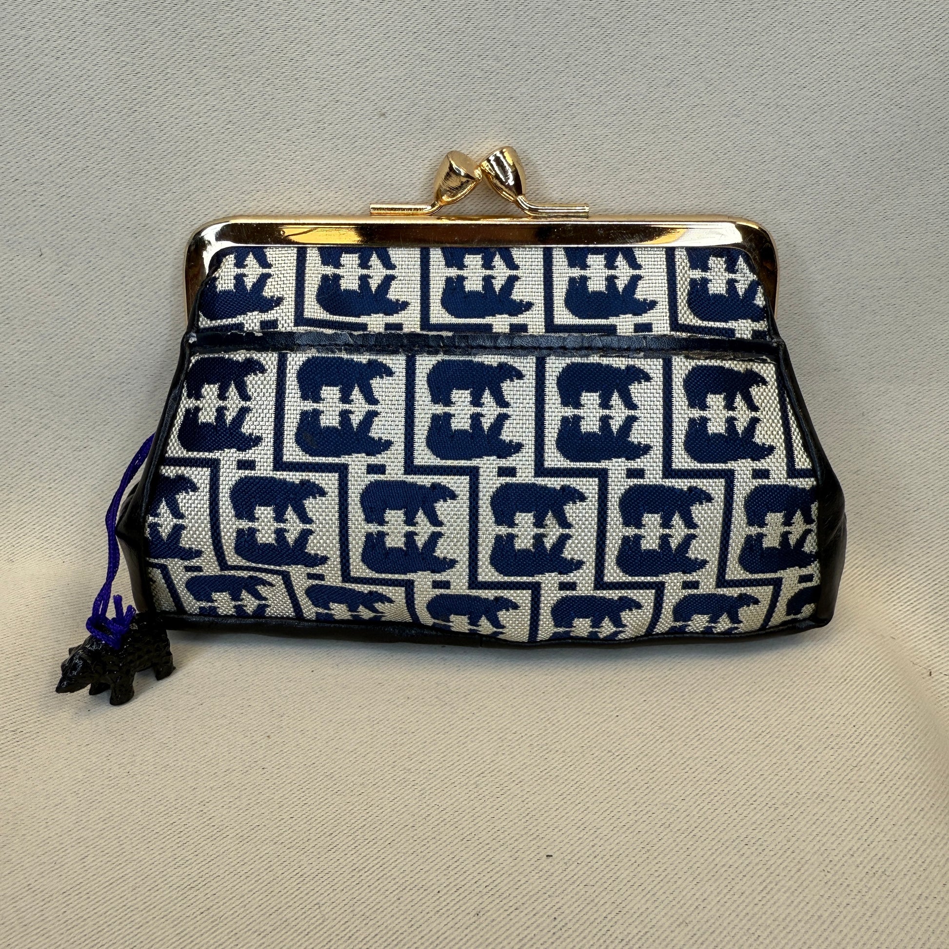 This Japanese clasp purse features an indigo and ivory bear (kuma) motif woven in a playful mirrored pattern, paired with black faux leather sides and a gold-tone metal frame. A small lacquer-style bear charm on a violet cord adds a whimsical finishing touch. The inside is dark blue with two compartments.