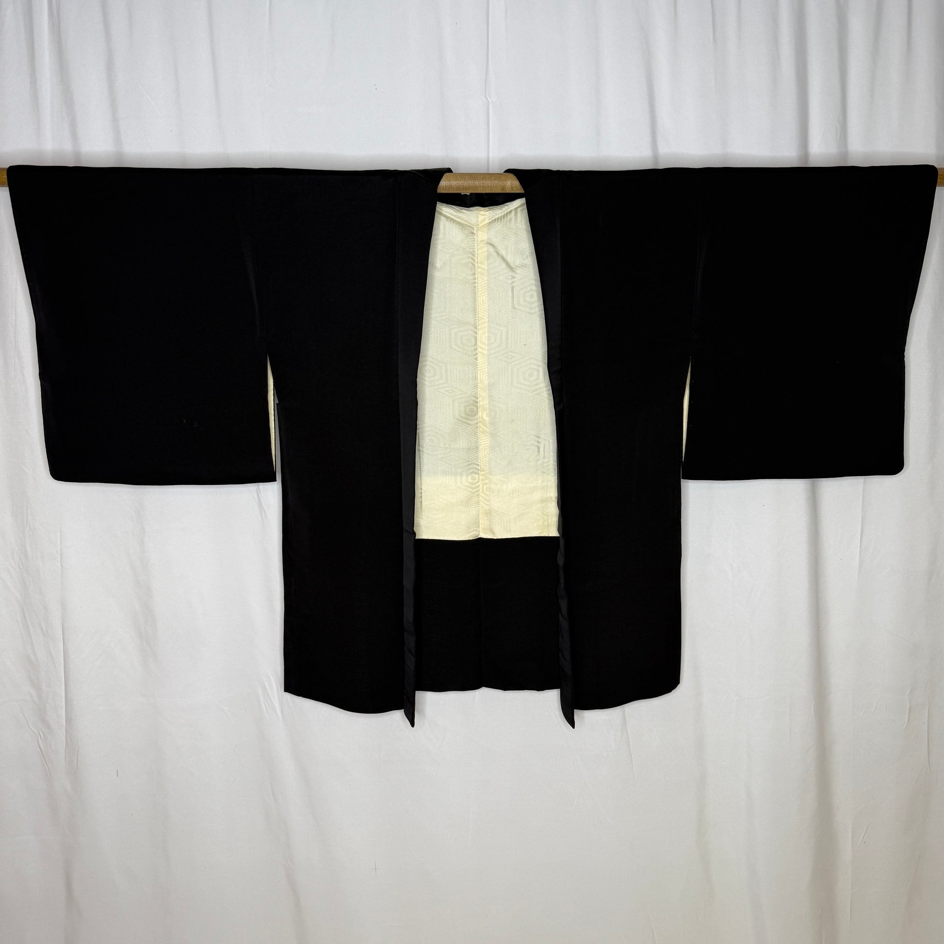 This listing is for a vintage Japanese haori jacket that would have been worn on top of a vintage kimono on a chilly day. Black haori like this are sometimes called "visiting haori" since they were worn for semi-formal occasions, like attending a community gathering.