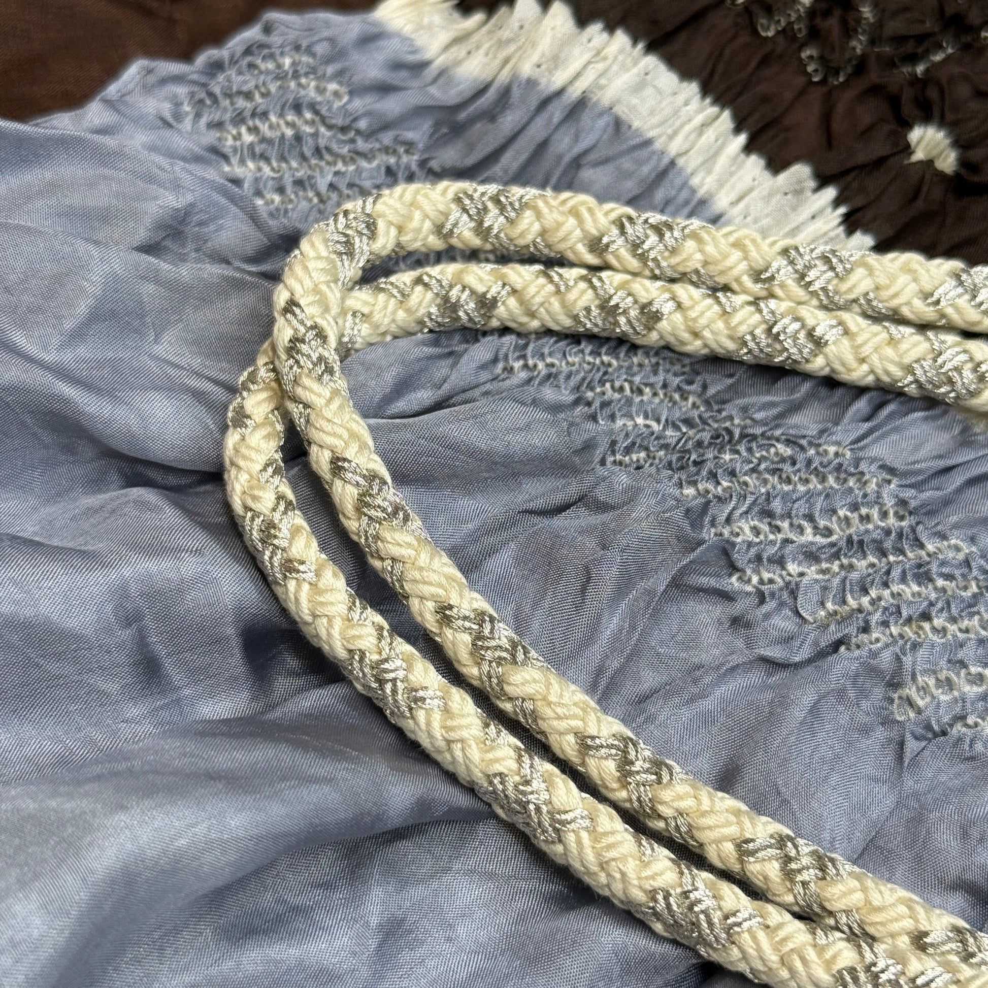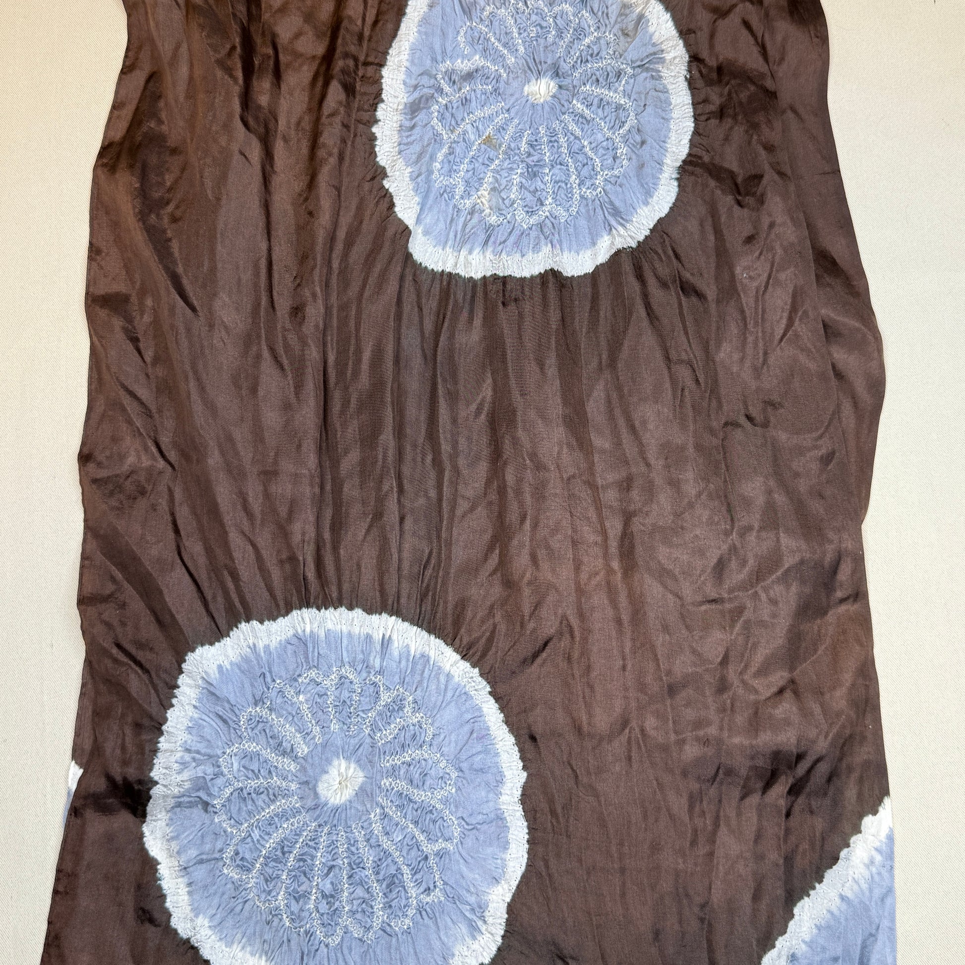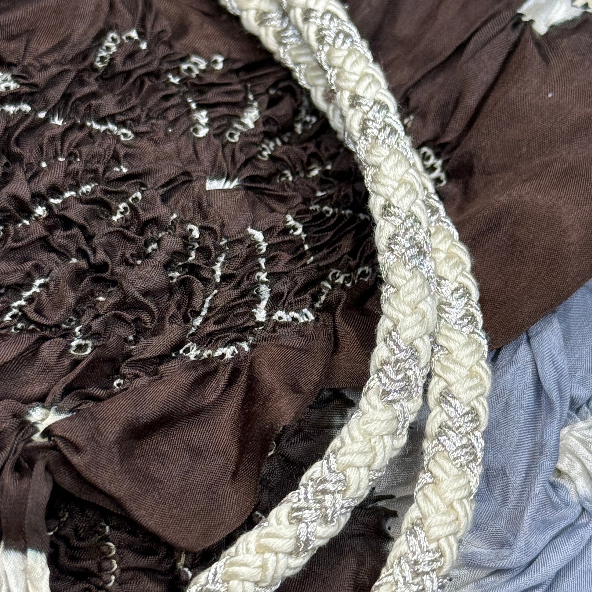 Rich as dark earth after rain, this obiage and obijime set blends deep brown, soft blue, and creamy white in a beautifully textured shibori display. The obiage features puckered floral motifs and spiral bursts that ripple across the fabric, creating dimension and movement with every fold. The earthy brown grounds the airy blue and cream accents, while the round braided obijime in cream and silver adds a refined shimmer that quietly elevates the entire ensemble.