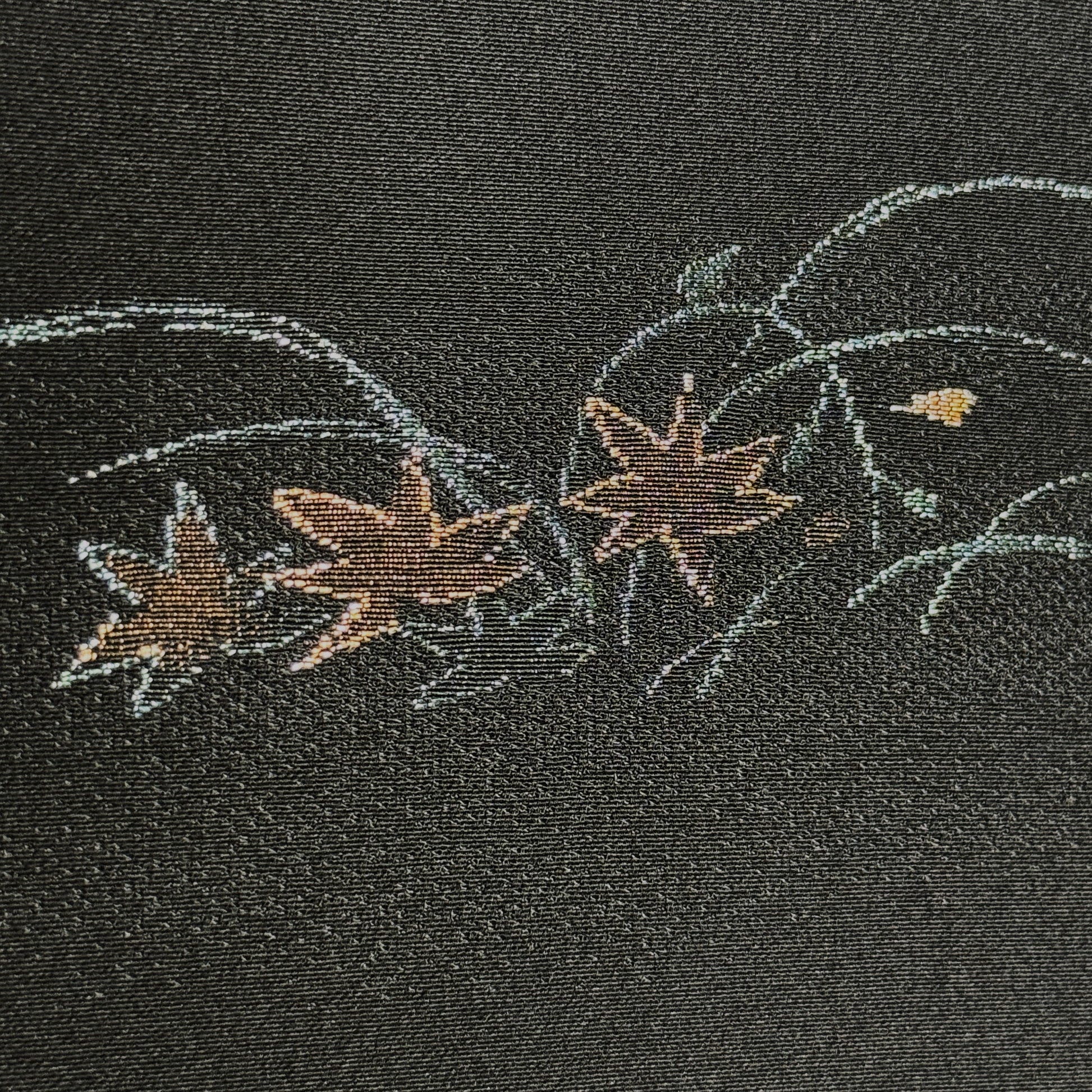 This haori features a metallic weave that creates clusters of momiji (maple leaves) resting among slender branches. The black silk provides a background that makes the woven motifs glow gently as they move in the light. A single butterfly crest below the neck adds a refined, traditional detail.