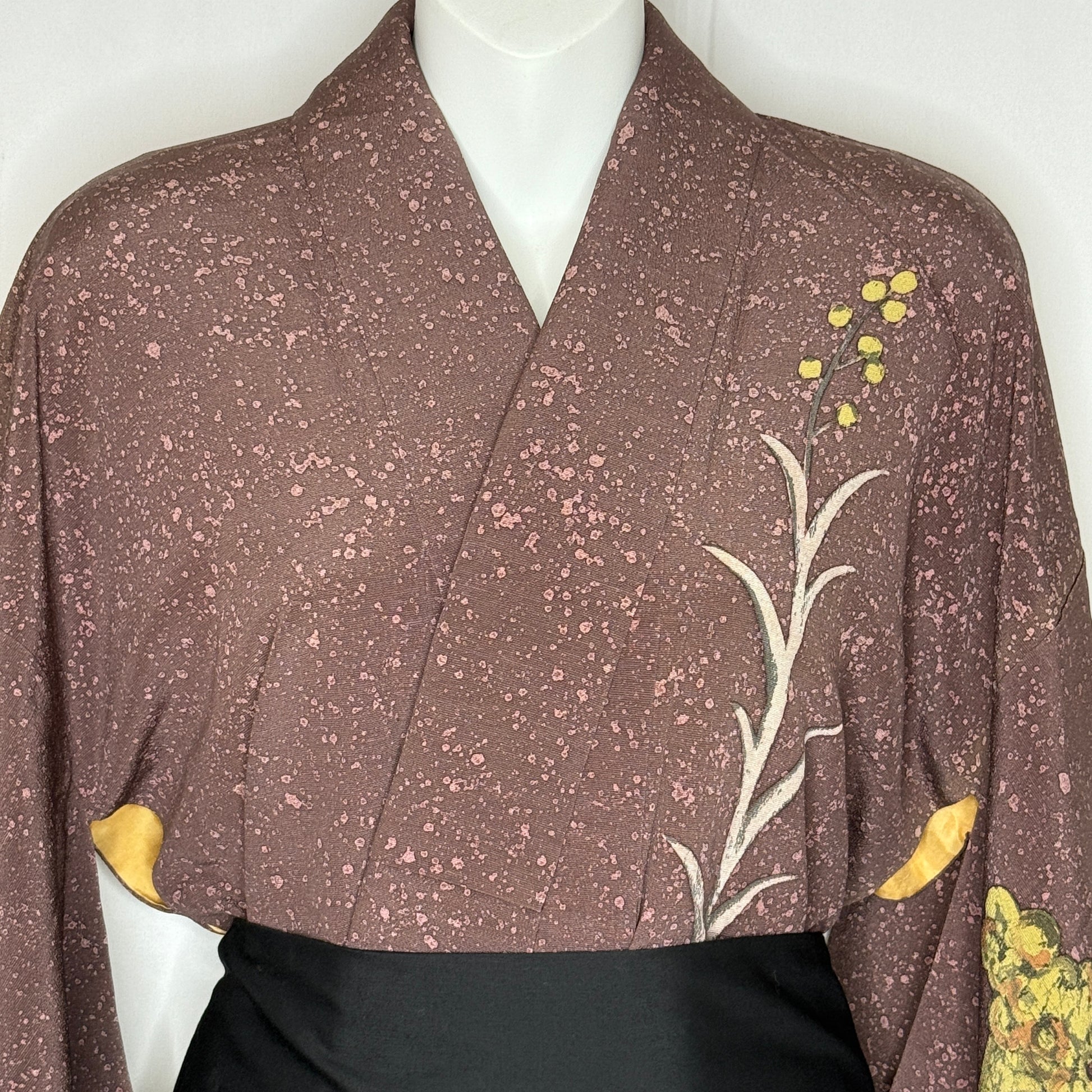 A quietly dramatic vintage kimono robe with a refined, atmospheric presence. The silk features a rich purple-plum background softly speckled with resist-dyed lilac flecks. We suspect that it was wax (though it might have been rice paste) used as the resist.