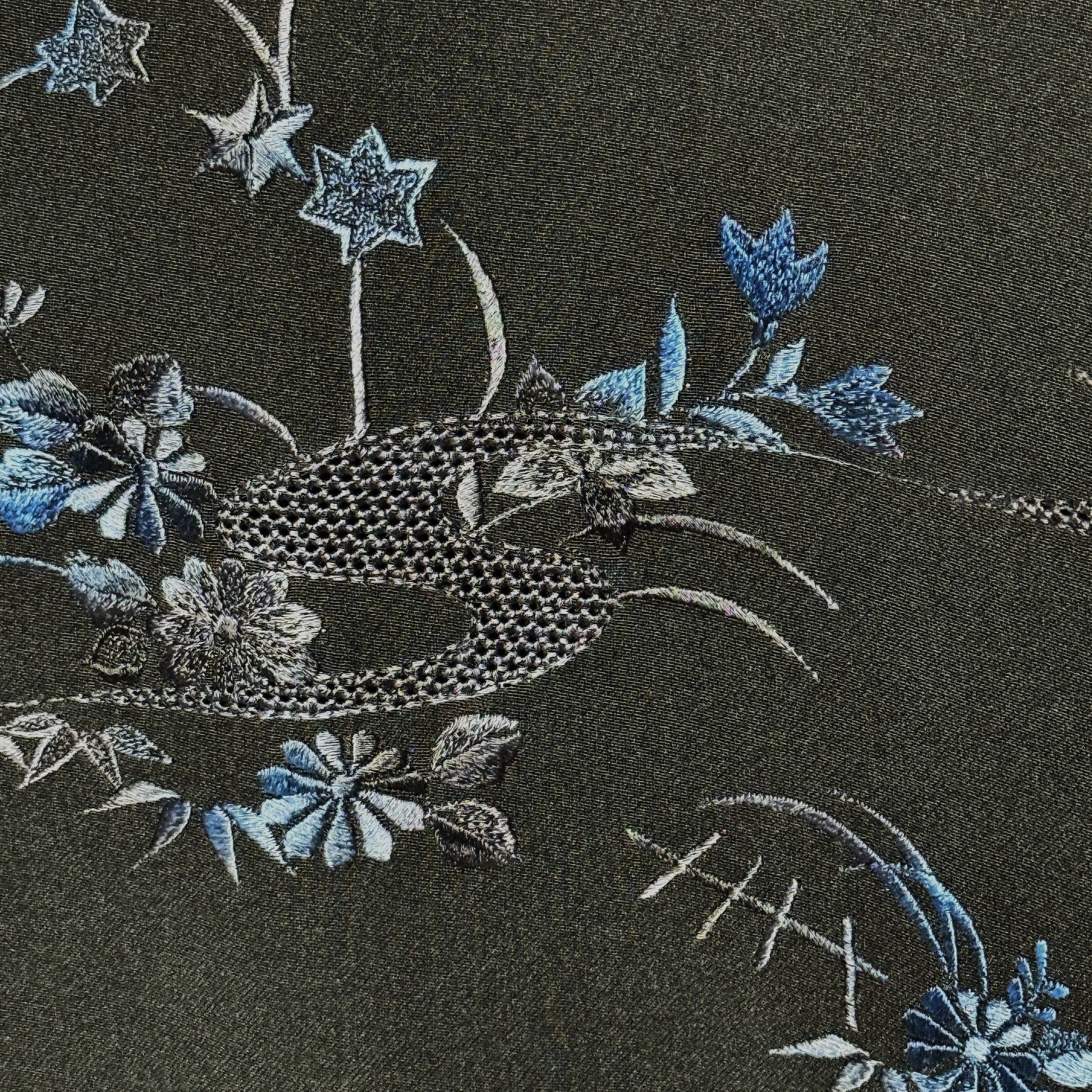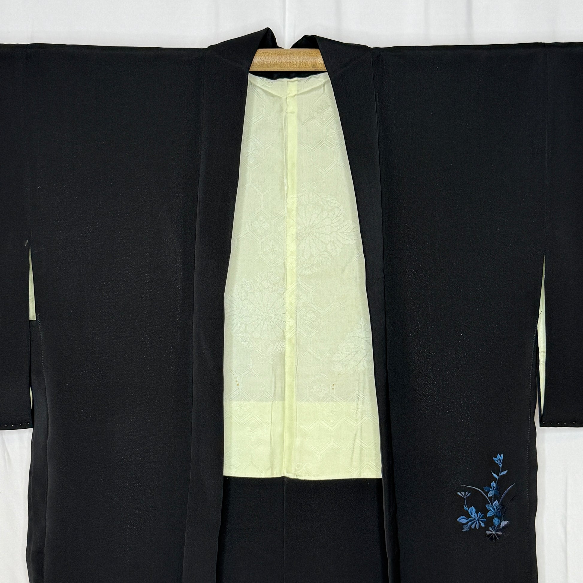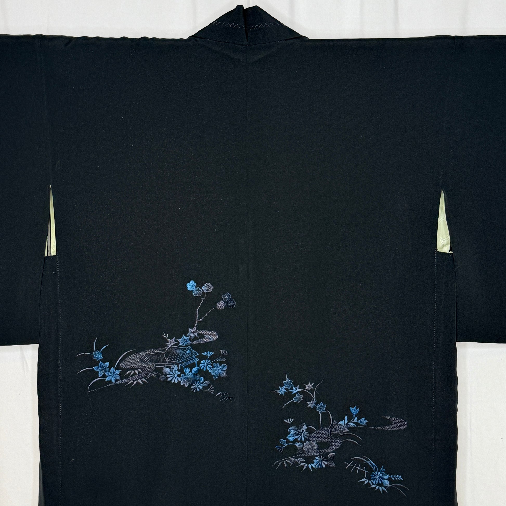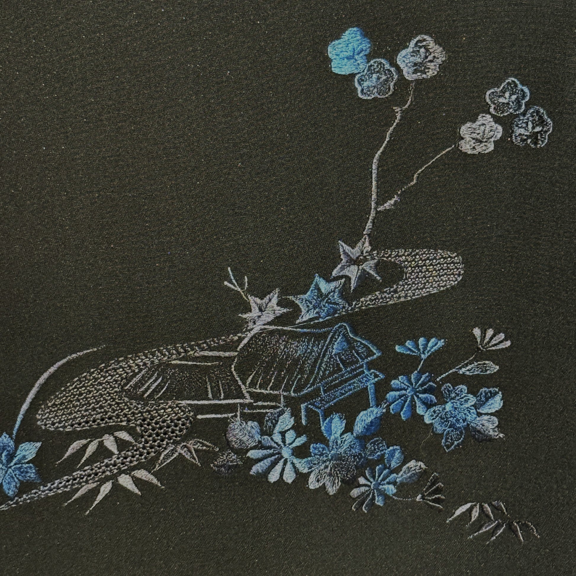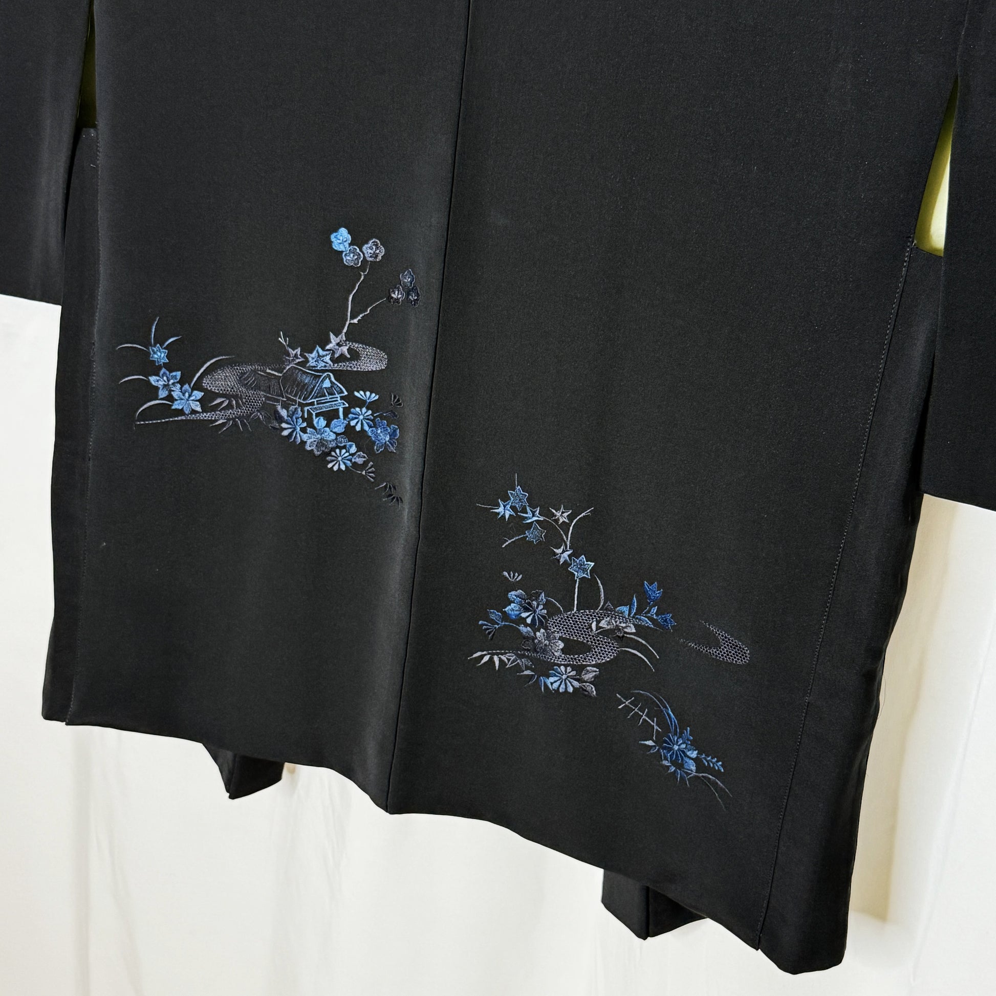This vintage haori has a calm, poetic presence, featuring two beautifully embroidered scenes of blue flowers cascading beside a small, thatched roof hut and flowing water. The black silk creates a night sky backdrop that makes the blue tones glow softly, giving the embroidery a dreamlike quality. Each motif is finely stitched with delicate shading that brings the petals and water lines to life. Look closely to see the water is actually an open weave in the fabric. This jacket drapes smoothly and feels luxurious - perfect for elegant styling.