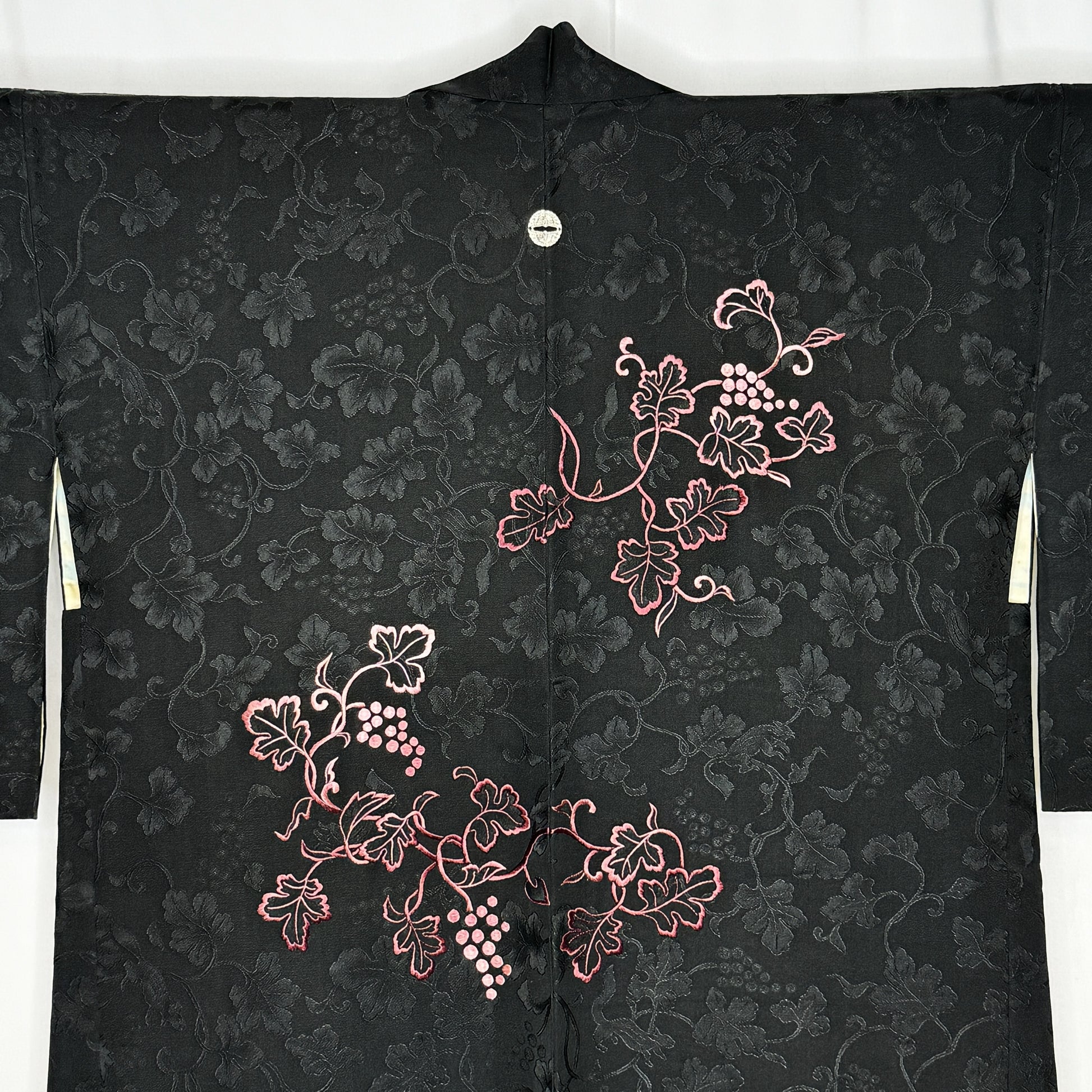 This haori whispers with softness through its layered textures and gentle embroidery. A deep black jacquard sets the stage with woven grapes, vines, and leaves that appear and vanish in the light. Some areas of the pattern are embroidered with a satin stitch on top to create a graceful, dimensional finish. The mirrored butterfly crest adds a refined touch below the neck, completing the balance of elegance and quiet charm.