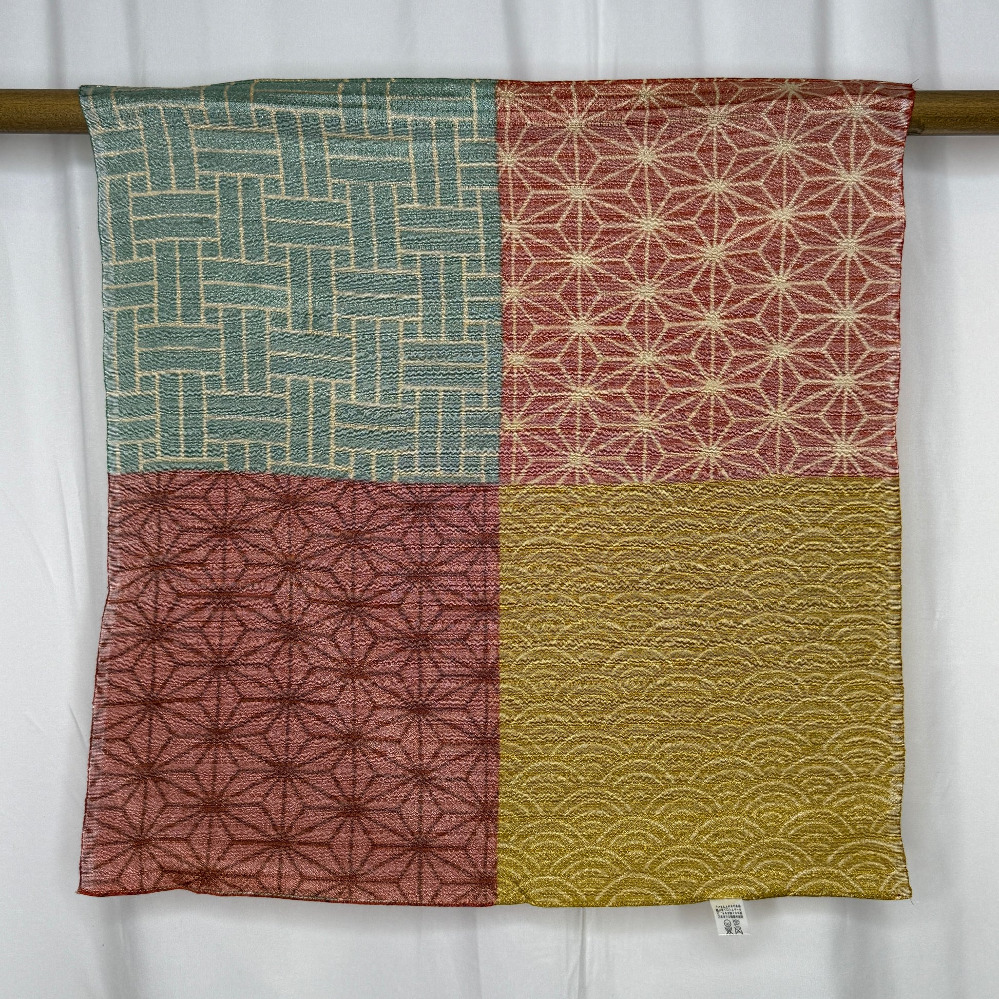 This vibrant furoshiki has a classic feel with four traditional Japanese patterns arranged like a perfectly balanced quilt block. Each quadrant showcases a different motif, including asanoha (star hemp), basketweave, and seigaiha waves. The combination creates a lively textile full of character and nostalgia. Perfect for wrapping gifts, as well as table decor. Soft rayon cloth with a nice drape.