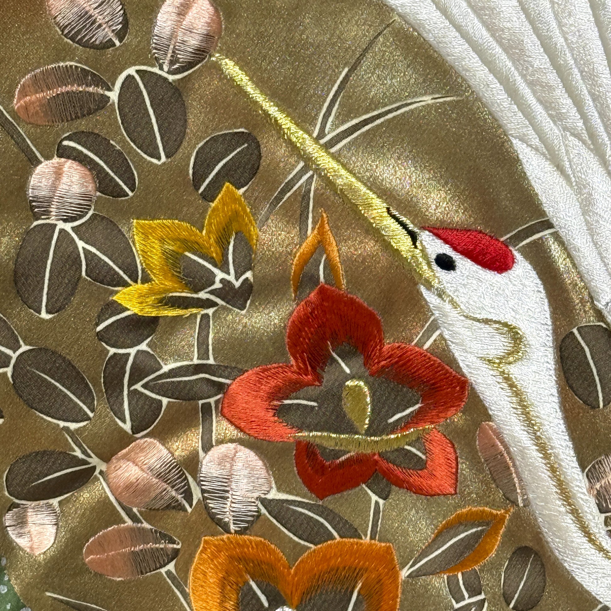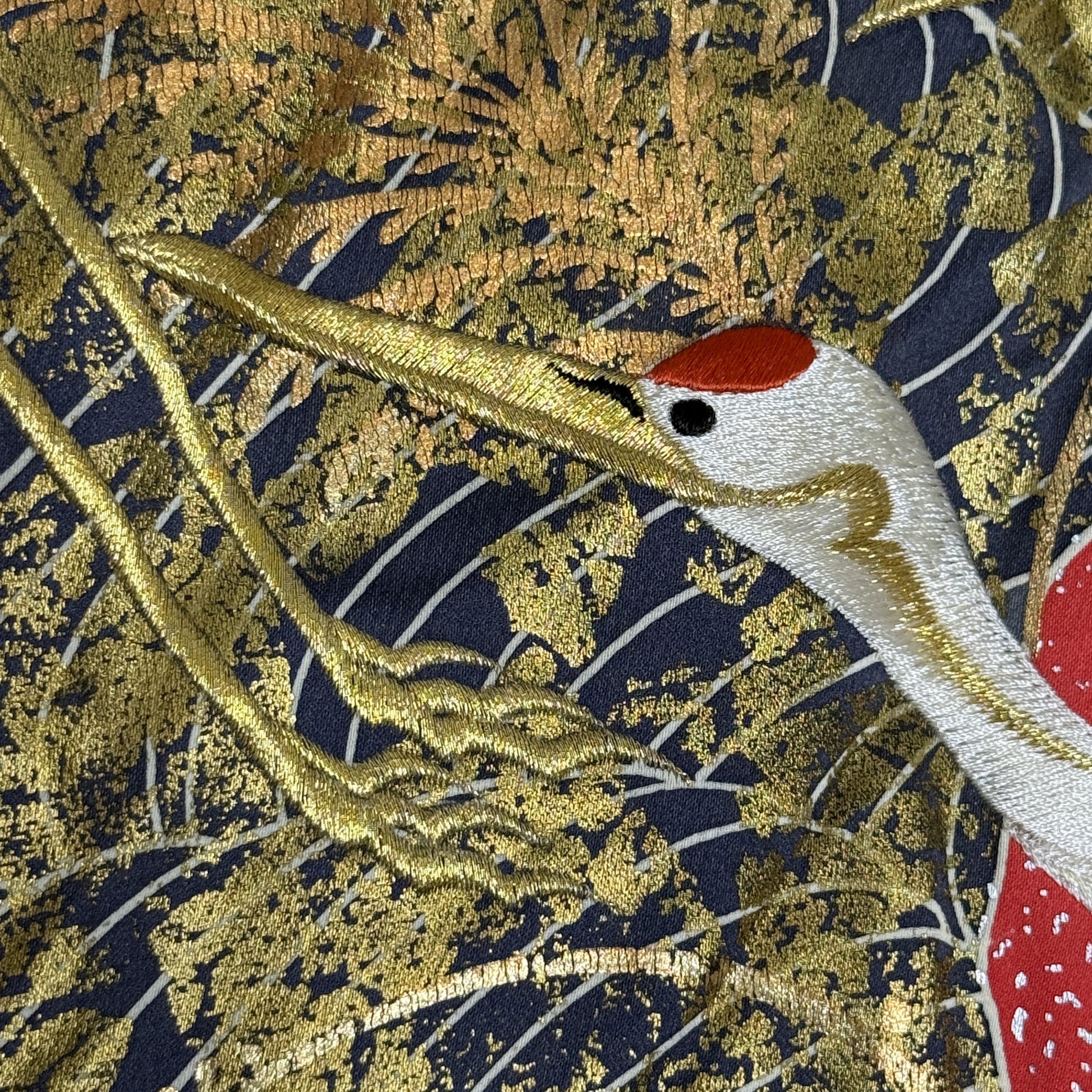 A dramatic celebration of autumn beauty and ceremonial elegance, this wedding kimono unfolds like a moving landscape beneath soaring white cranes. Richly embroidered mums and autumn field florals bloom across a luminous gold background, their warm rust, saffron, blush, and soft pink tones drifting between sweeping bands of stylized waves. The cranes glide gracefully through the composition, symbols of longevity and harmony, while pine and seasonal botanicals anchor the design with a sense of endurance and abundance.