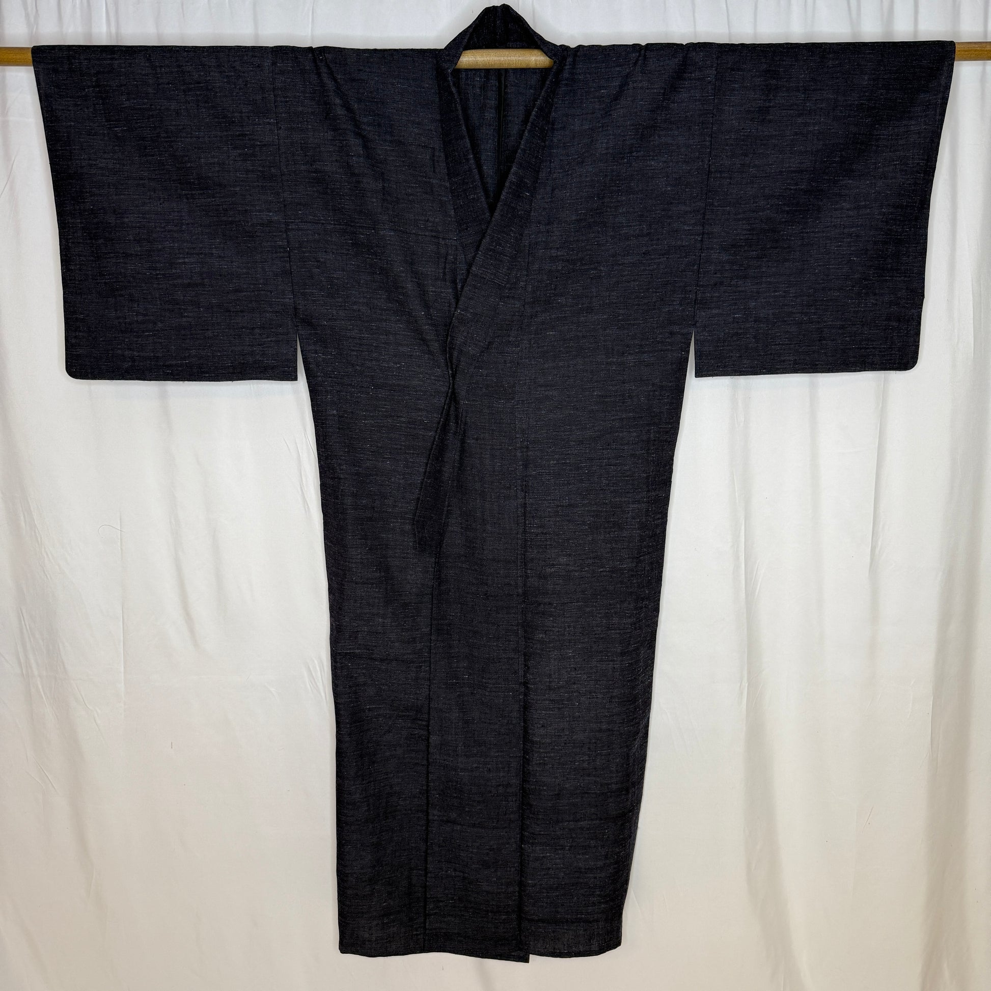 This dark indigo blue men's kimono carries the calm strength of simplicity, woven with a subtle nubby texture that gives the surface a natural, tactile depth. The fabric's deep charcoal-blue tone shifts gently in the light, creating an impression of weathered stone. Lightweight and unlined, it's ideal for warmer days when you may want a garment that allows more air to pass through.