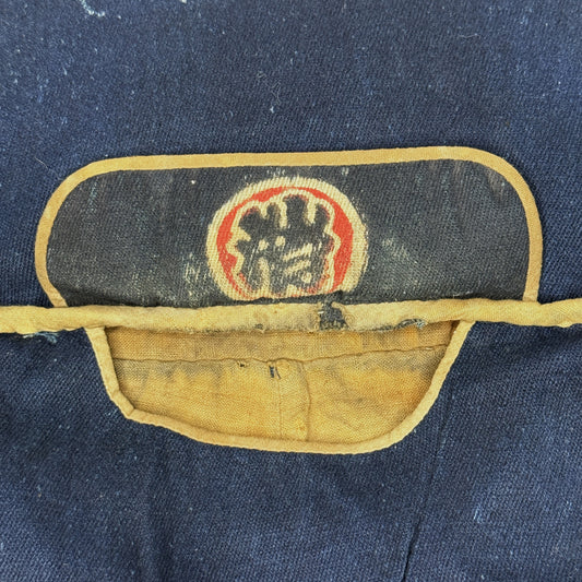 We think the characters on the front of this jacket spell out the name of a company sponsor, but we cannot translate it. There is a small crest-like element - perhaps the company logo? - on the back of the neck, which is quite unusual. The shape that surrounds the kanji is a weight motif, used for measuring rice and other items.