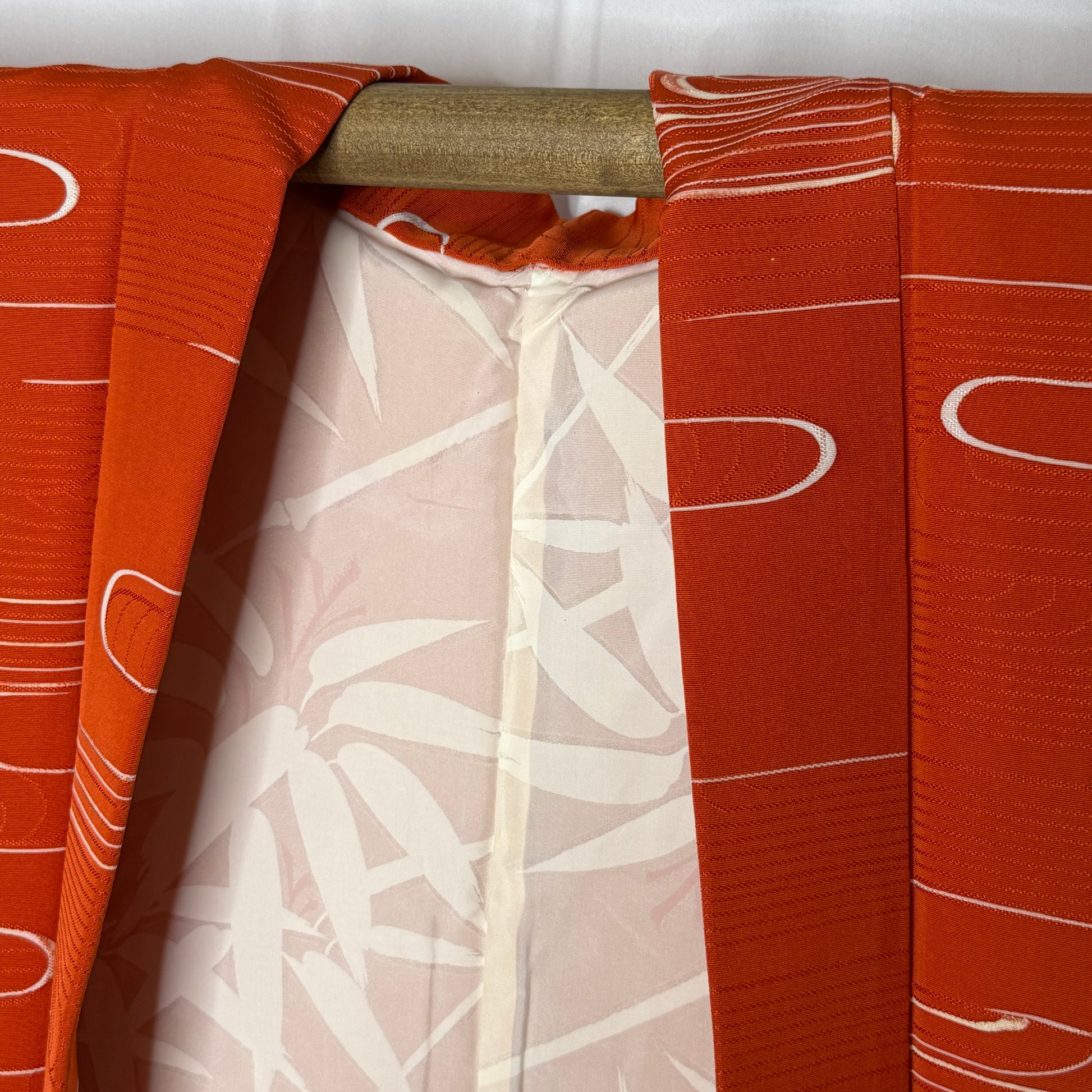 This lively haori jacket shines in a rich shade of deep orange - its surface animated by graceful, curved lines that drift like clouds or flow like a quick moving stream. The silk is woven with lines that create a horizontal shimmer that catches the light, and the white ripples were created with a brushed-on resist paste and offer a natural sense of motion. Up close the fine craftsmanship shows in each smooth arc and tiny ridge, while from a distance the design forms a rhythmic, modern graphic.