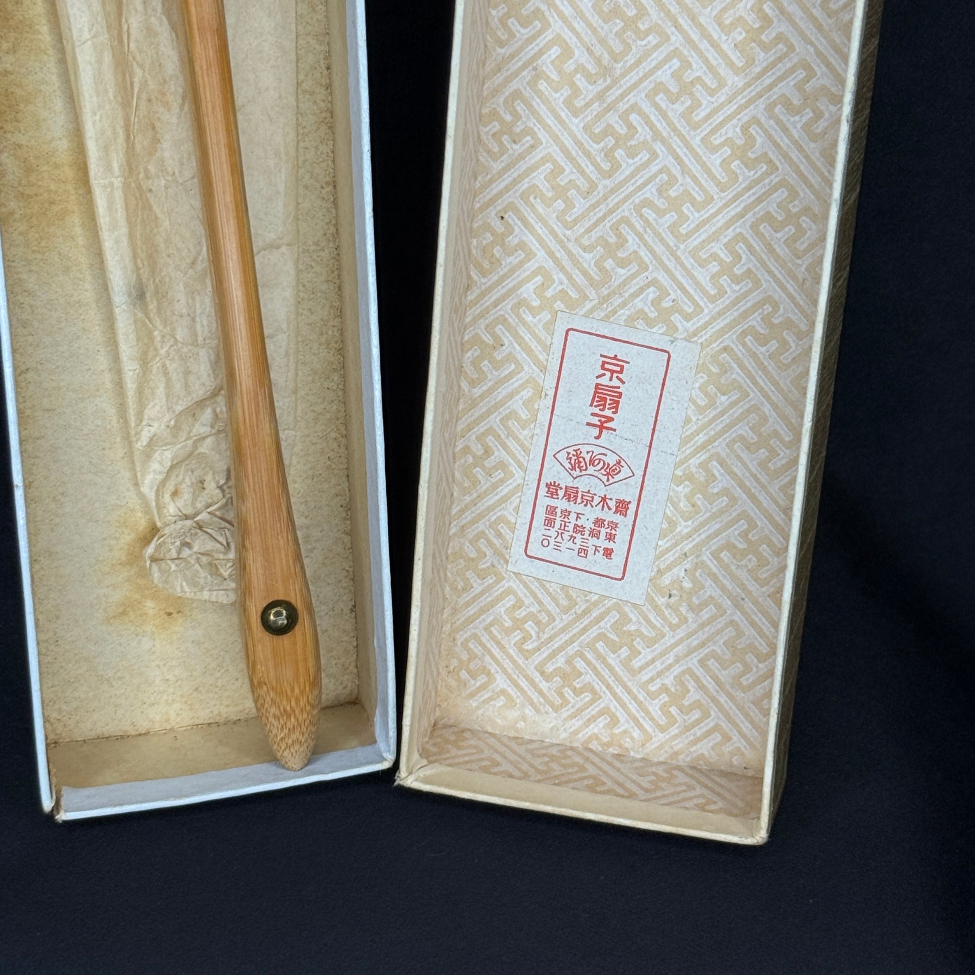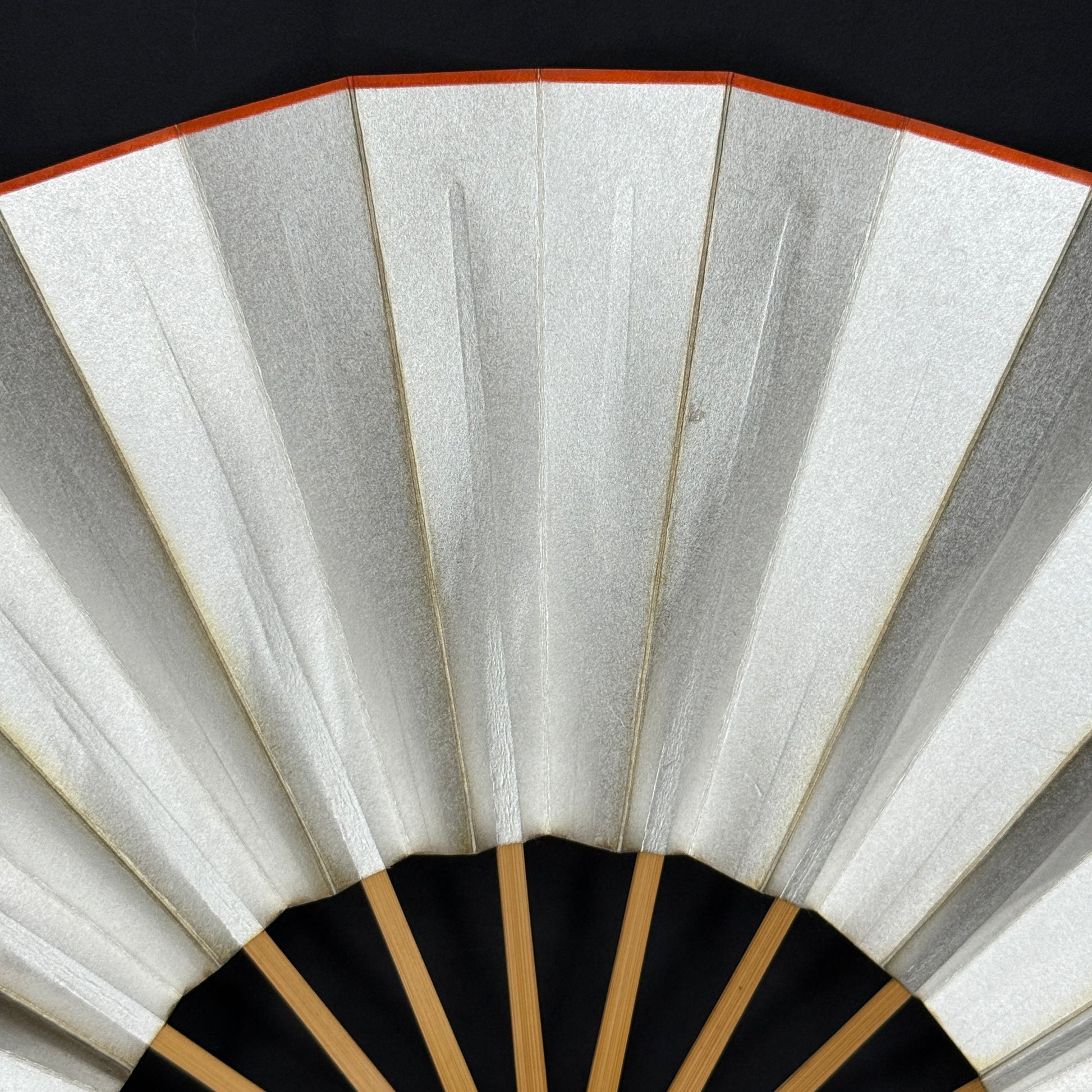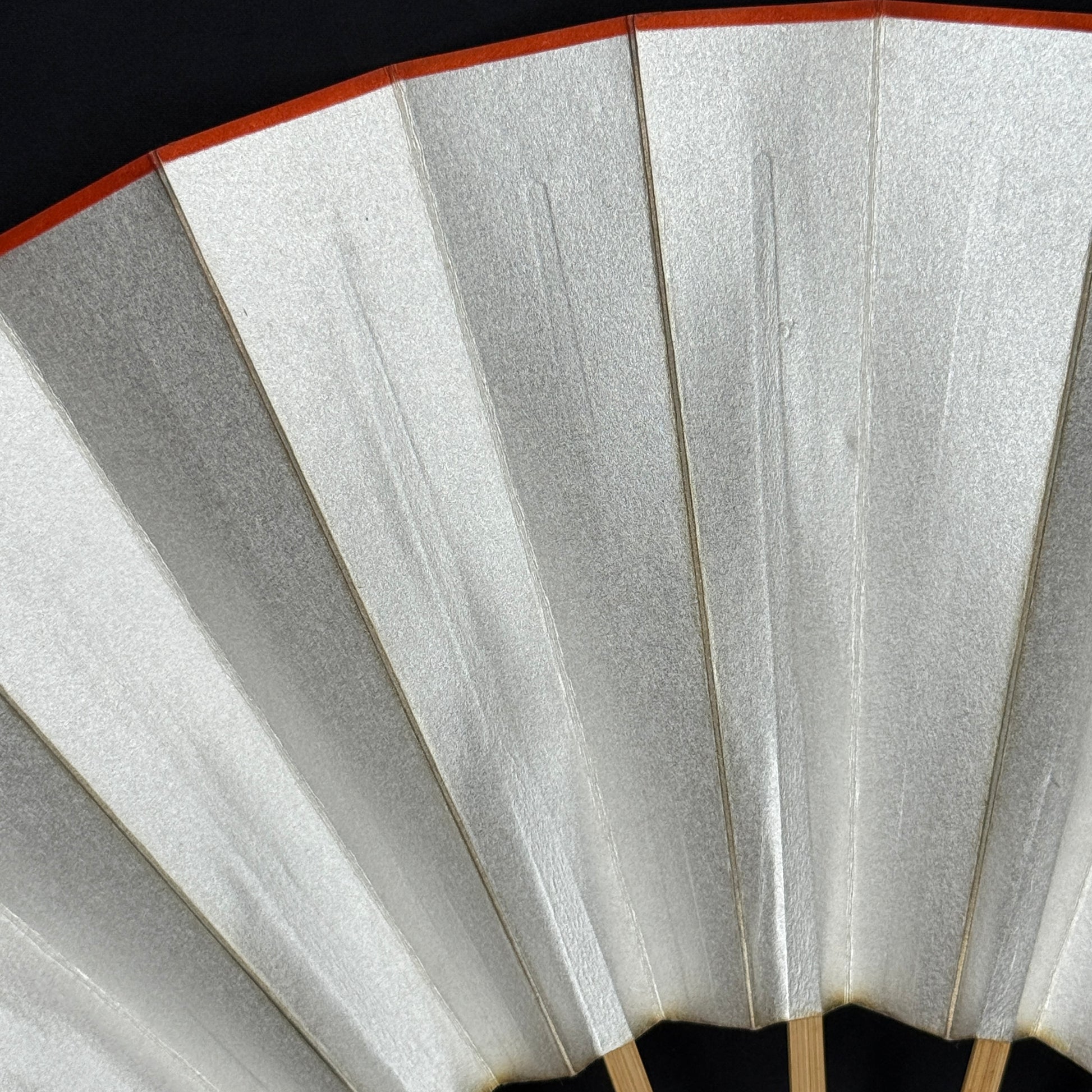 This refined Kyoto-style folding fan (Kyo-Sensu) captures a sense of balance and grace in its minimalist design. The paper shimmers with a soft silver sheen, bordered by a fine orange trim for a touch of warmth. Crafted by Iwasa Mokubei, a well-known Kyoto fan maker, it comes in its original box marked with the maker's seal and kanji meaning "dance fan". The design is the same on both sides.