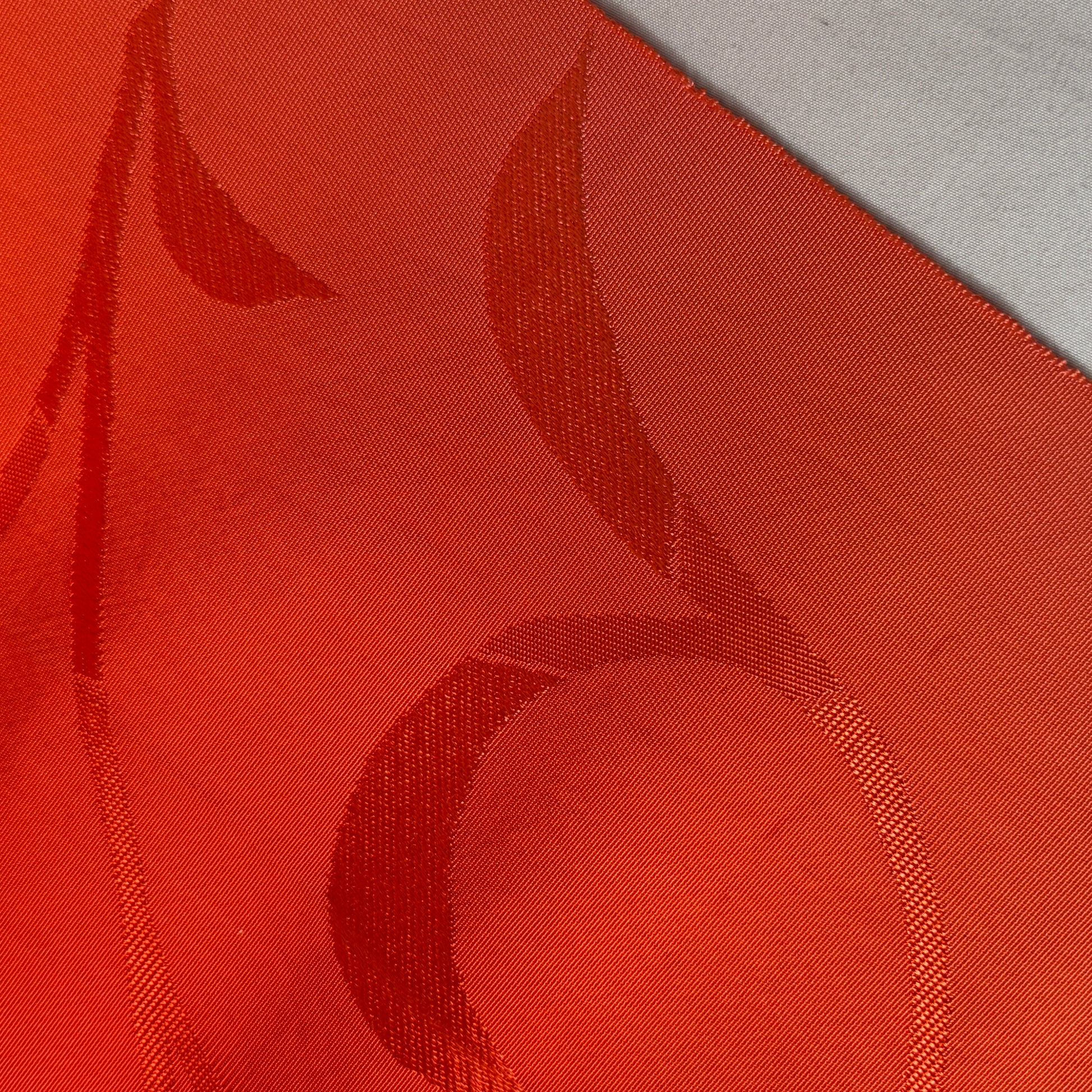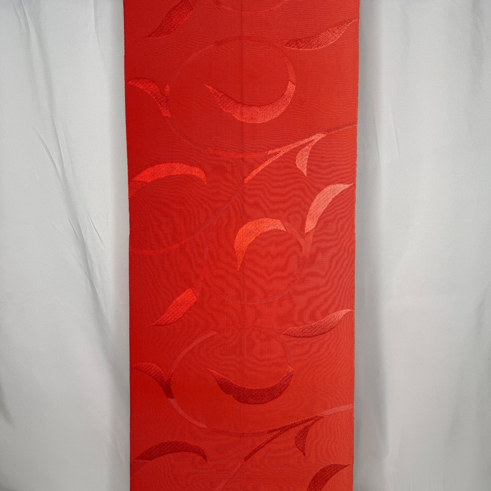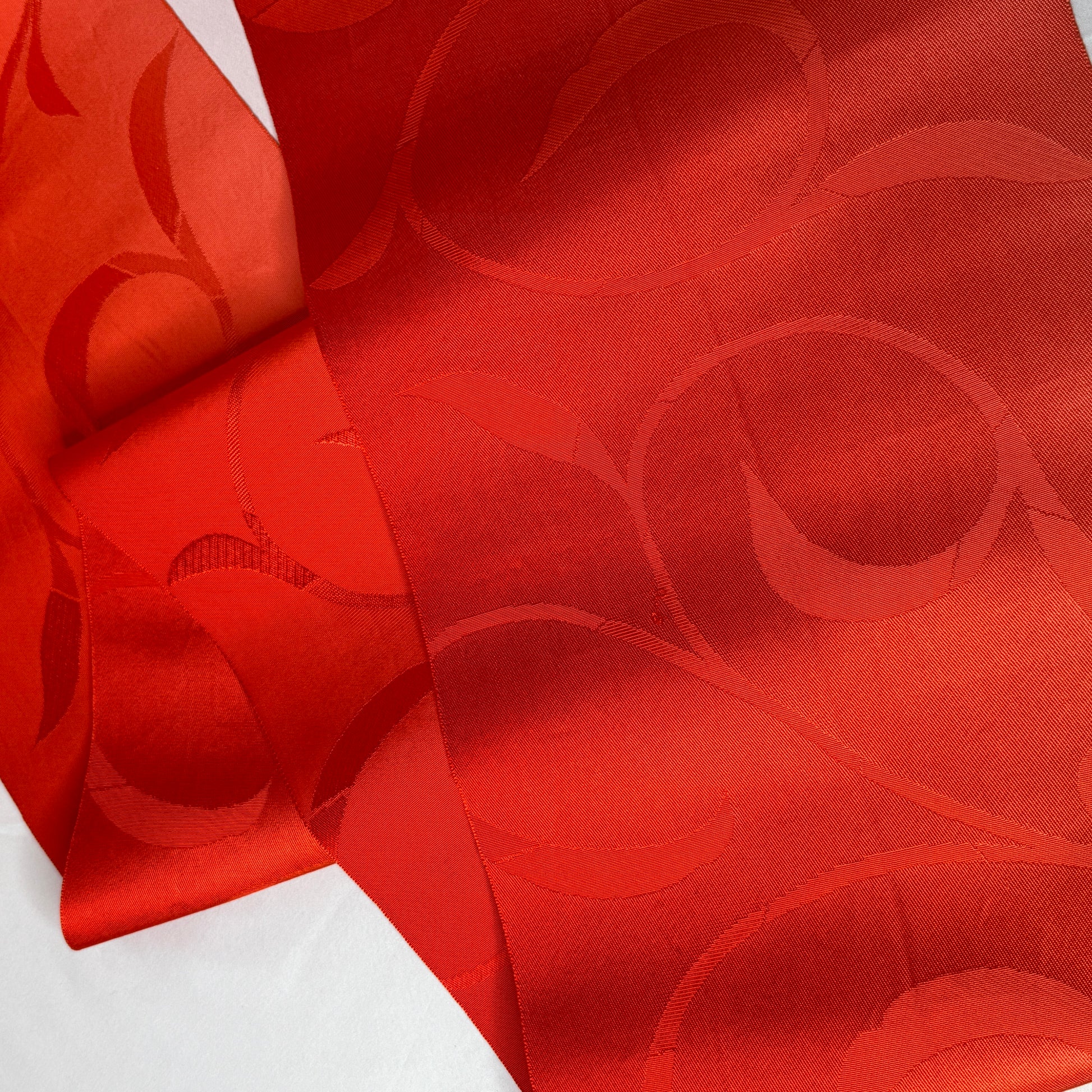 A warm glow of orange silk opens this vintage obi fabric bolt, immediately drawing the eye with its elegant tone-on-tone jacquard of flowing vines and leaves. The design runs the full length of the bolt, allowing the subtle botanical pattern to emerge and recede as the light moves across the surface.