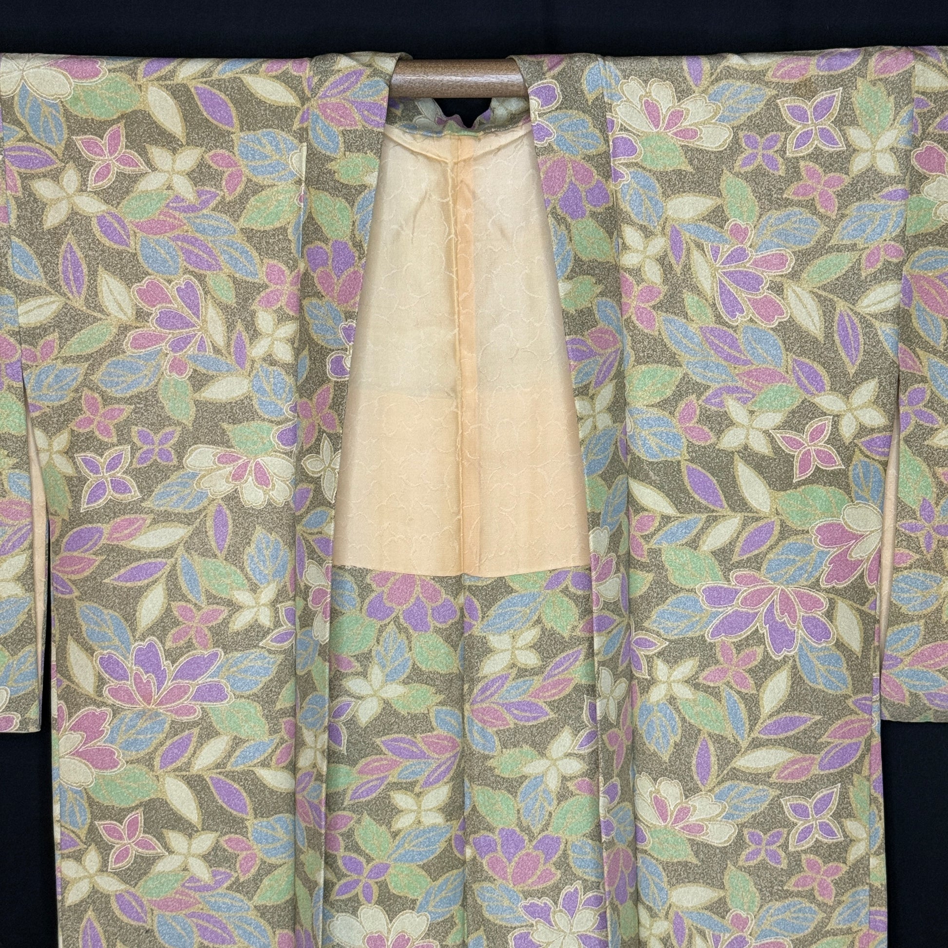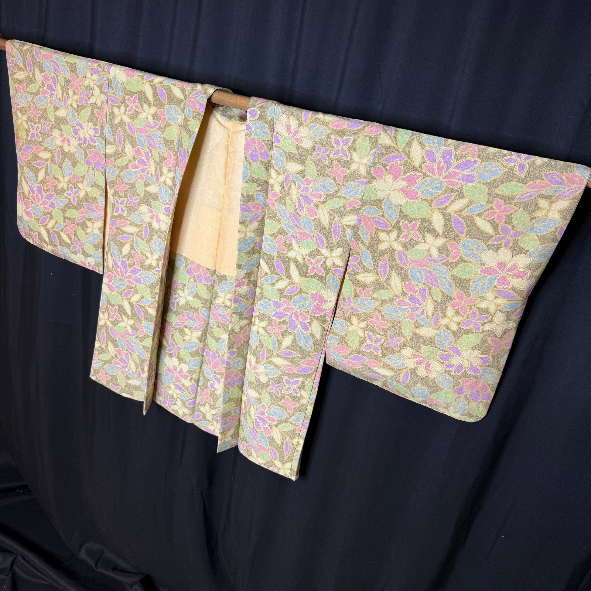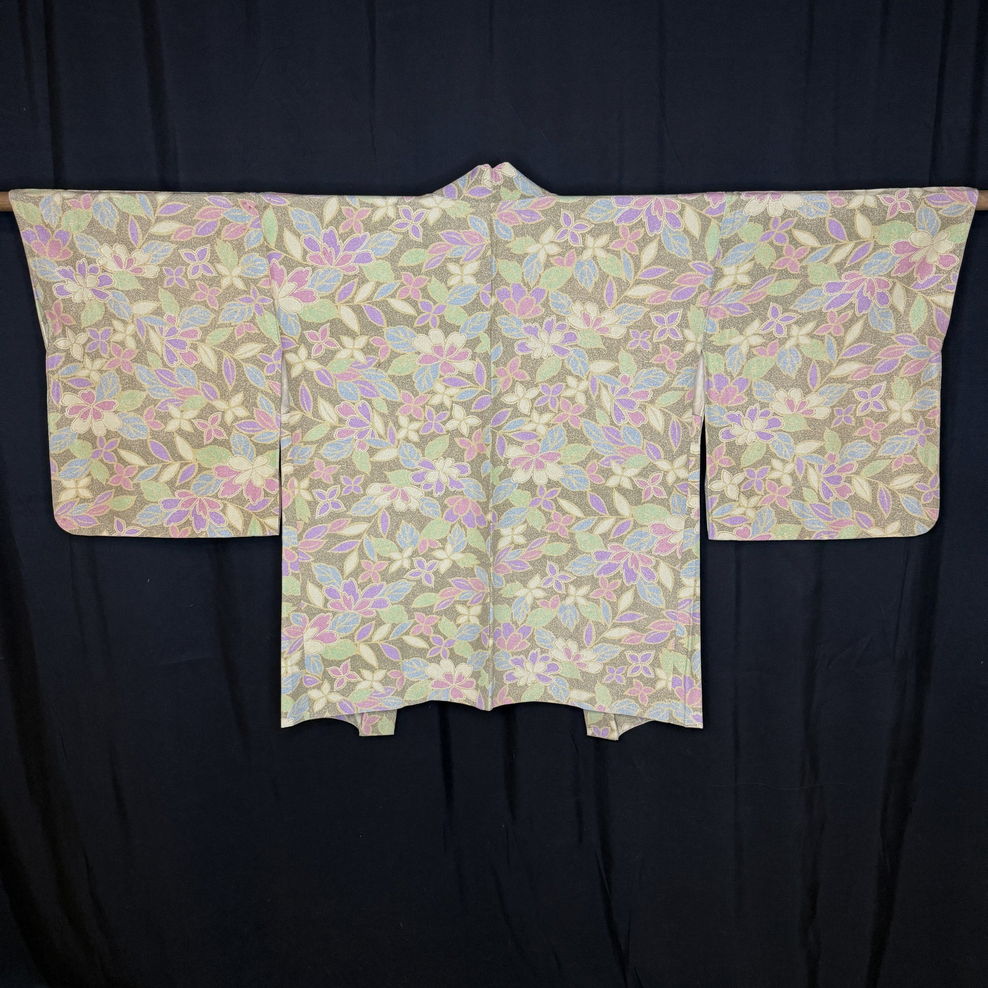 This graceful woman's haori jacket features an all-over floral pattern in a soothing palette of lavender, mint, blush pink, cream, and soft blue against an olive brown-green background. Look closely to see the overall speckling in the dye work that seems to suggest a light rain or misty morning. The design feels like a spring garden, rendered in gentle pastels that create a warmth and refinement.