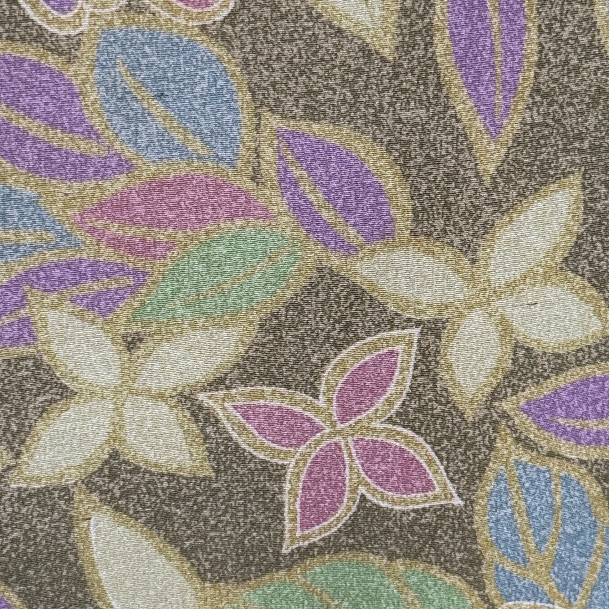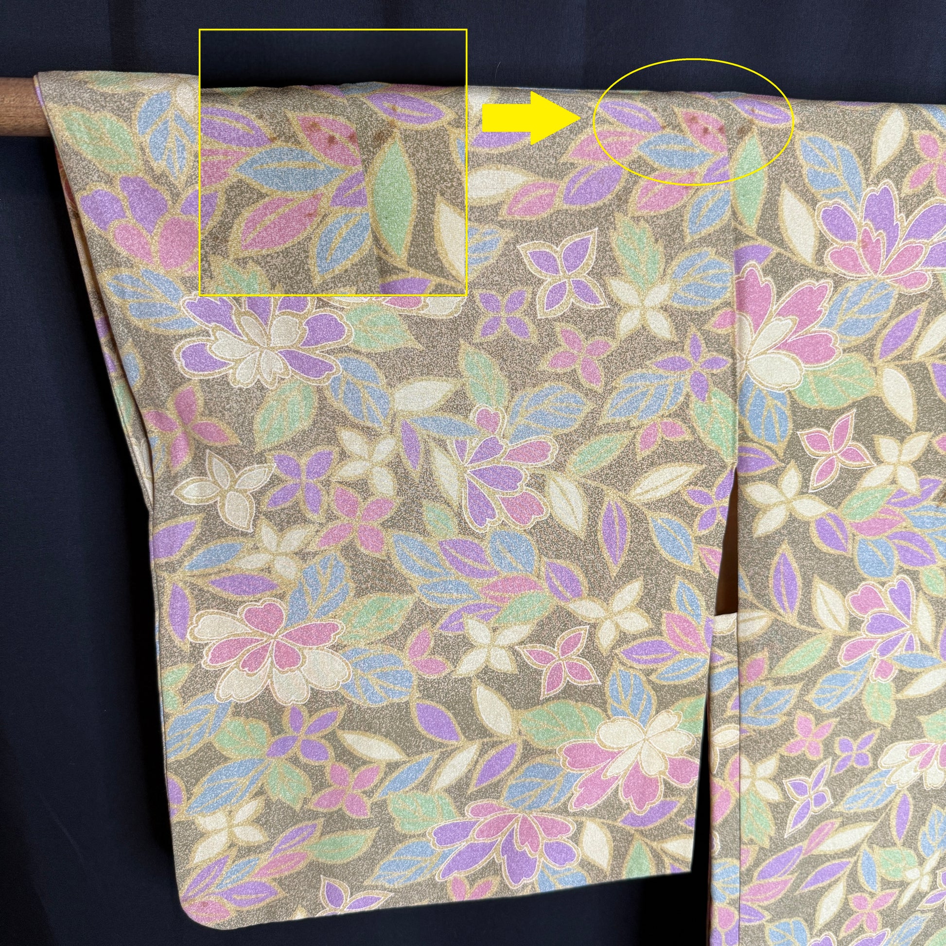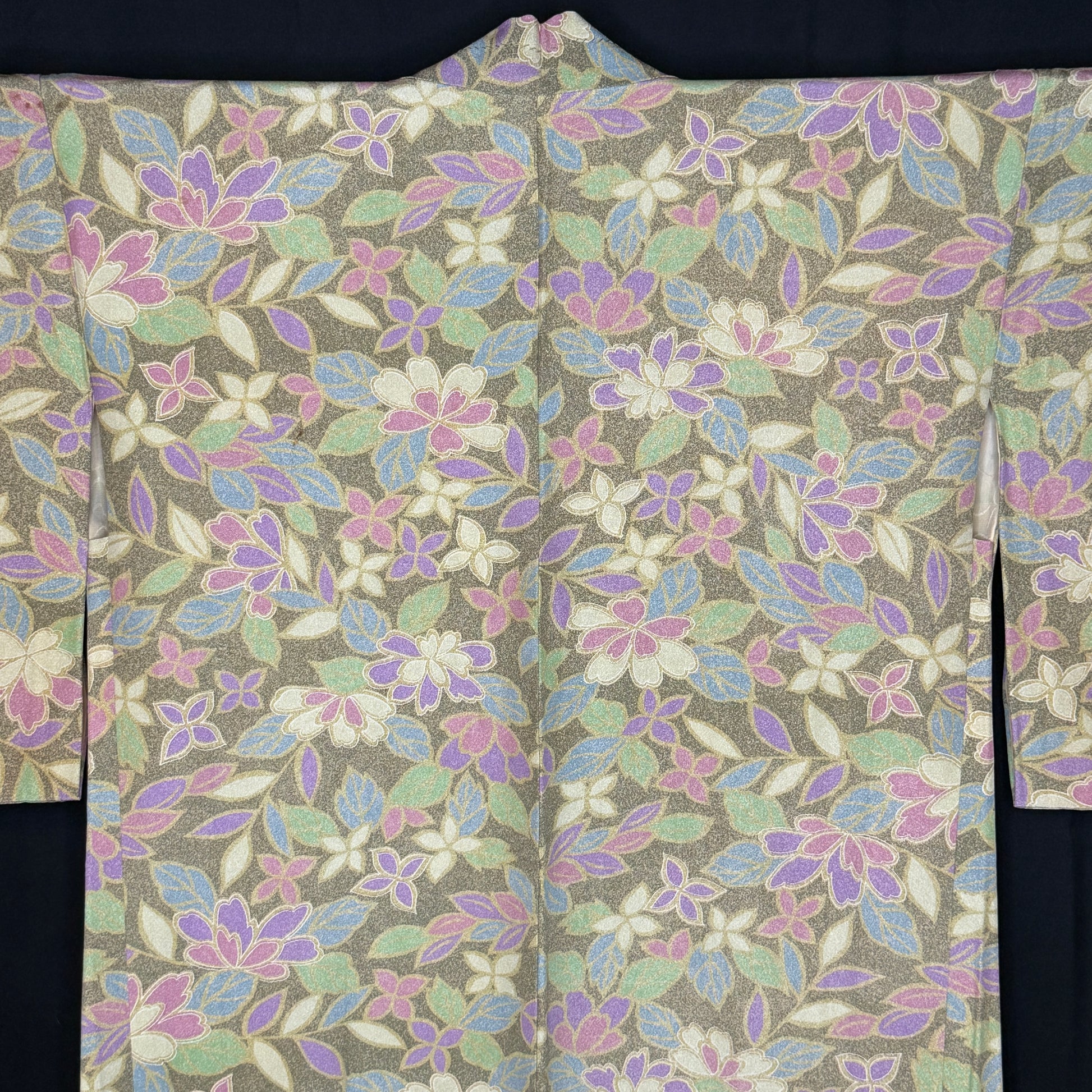 This graceful woman's haori jacket features an all-over floral pattern in a soothing palette of lavender, mint, blush pink, cream, and soft blue against an olive brown-green background. Look closely to see the overall speckling in the dye work that seems to suggest a light rain or misty morning. The design feels like a spring garden, rendered in gentle pastels that create a warmth and refinement.