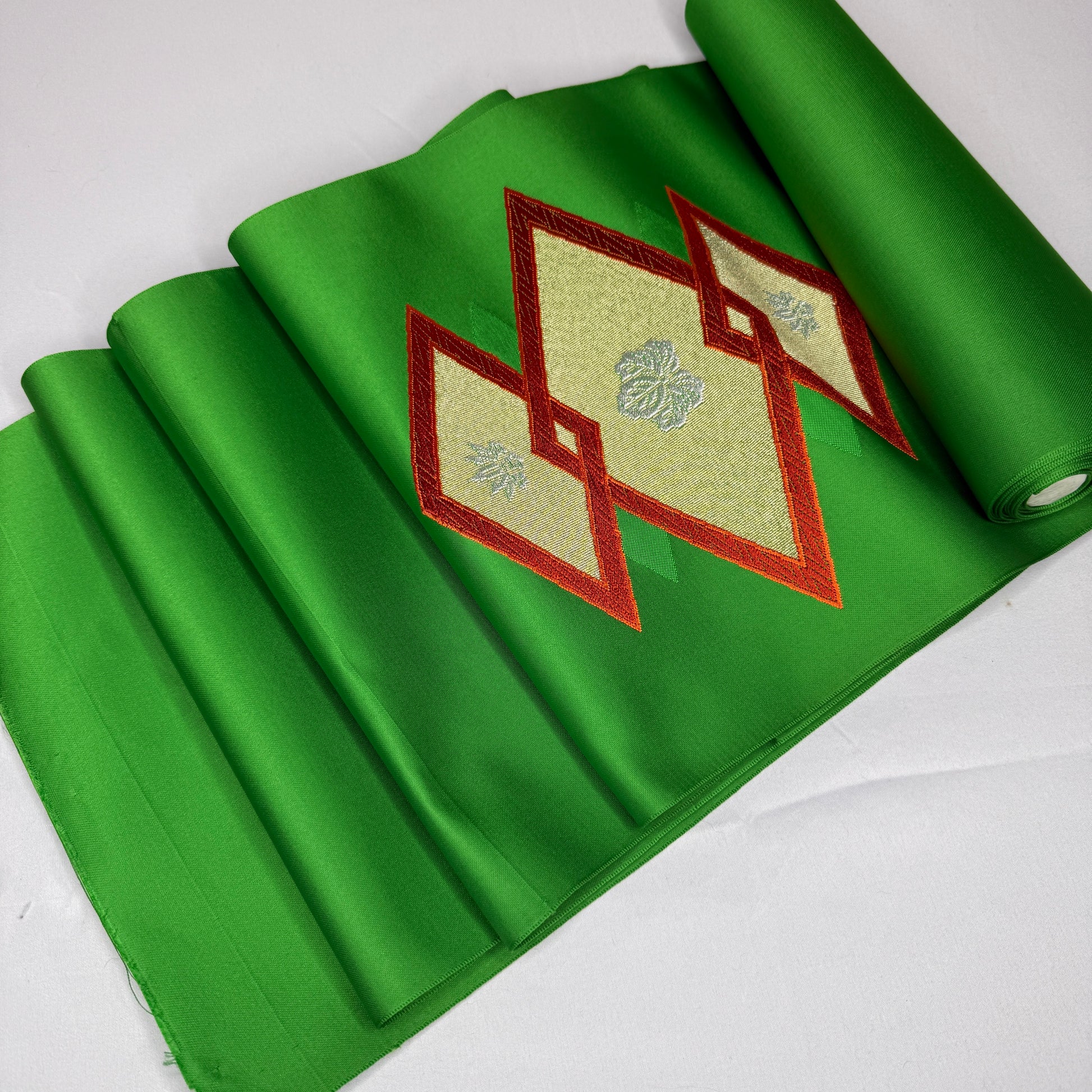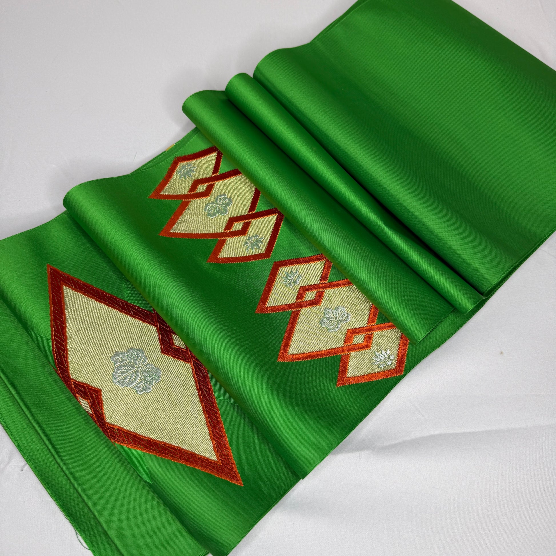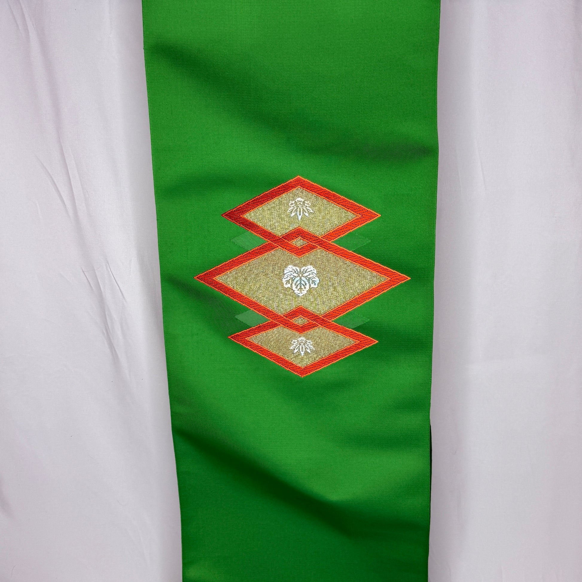 A saturated, jewel-toned green sets a luxurious foundation for this vintage nagoya obi bolt, immediately drawing the eye with its bold color and refined sheen. The decorative sections feature woven interlocking diamond shapes framing elegant paulownia motifs, a design long associated with prosperity and prestige. The motifs are rendered in soft metallic tones that contrast beautifully with the green background.