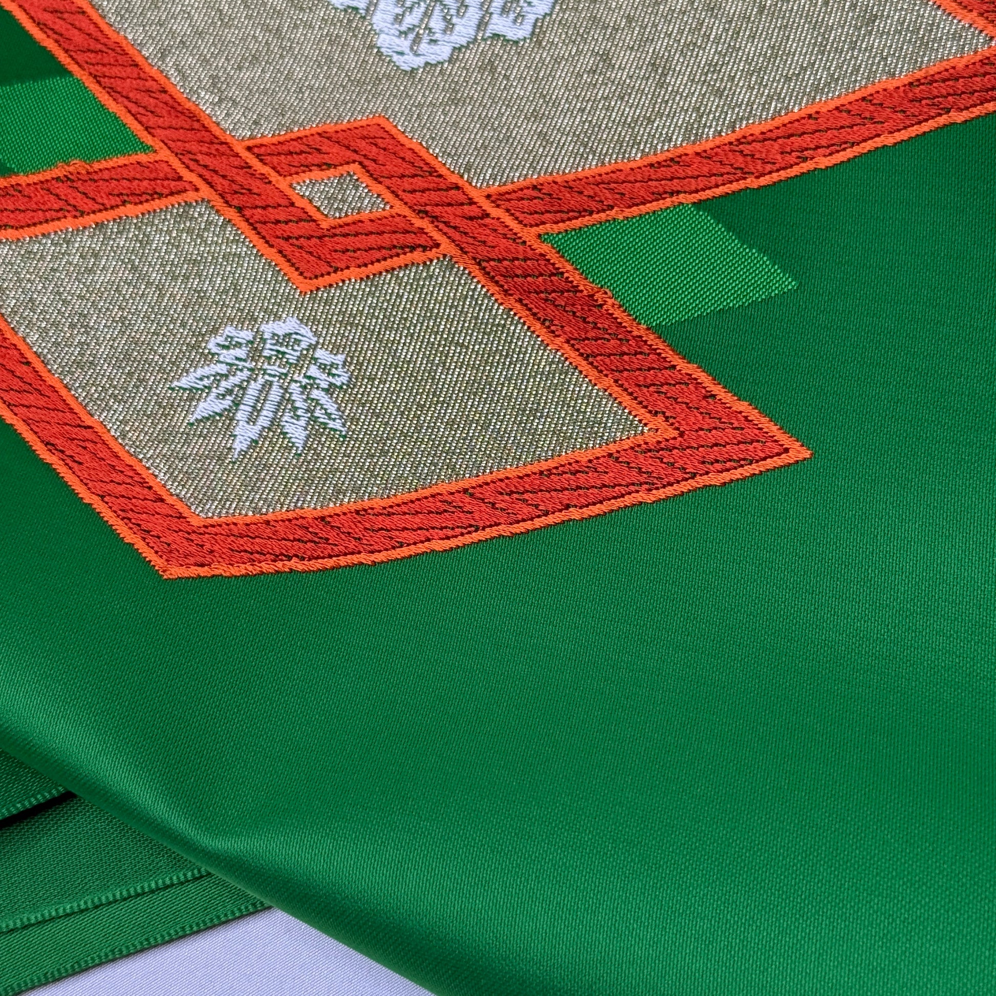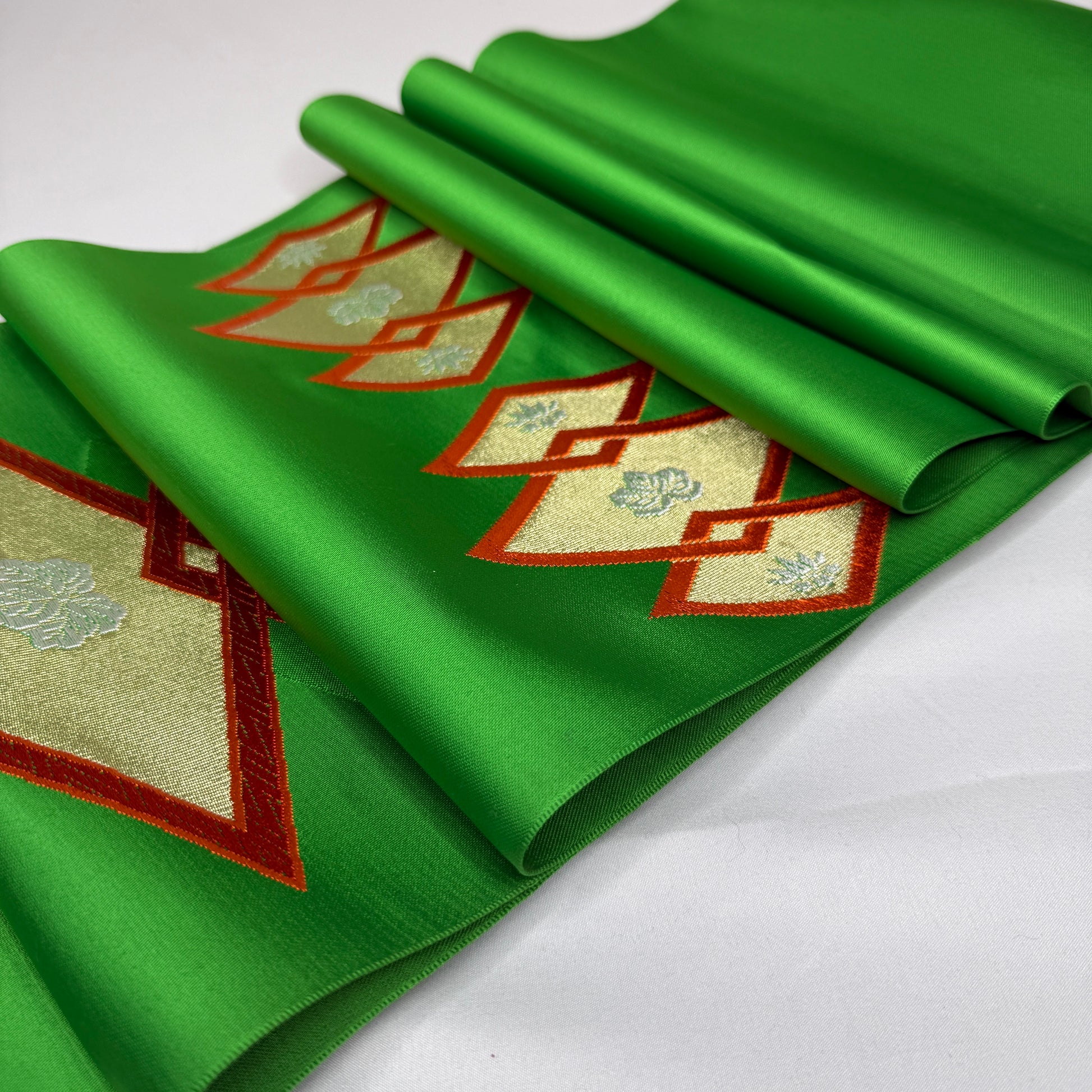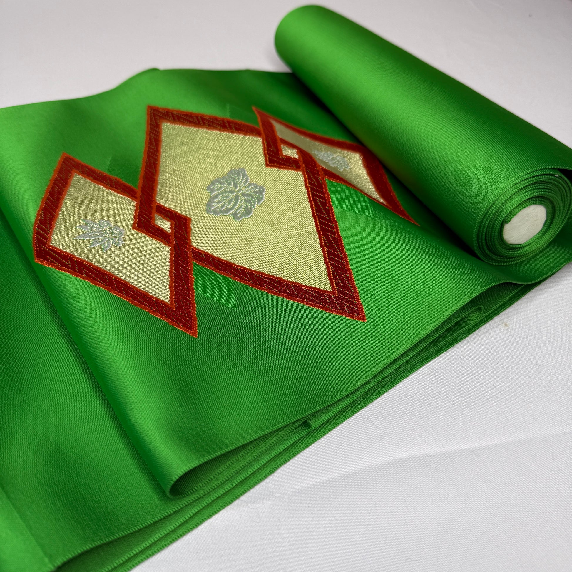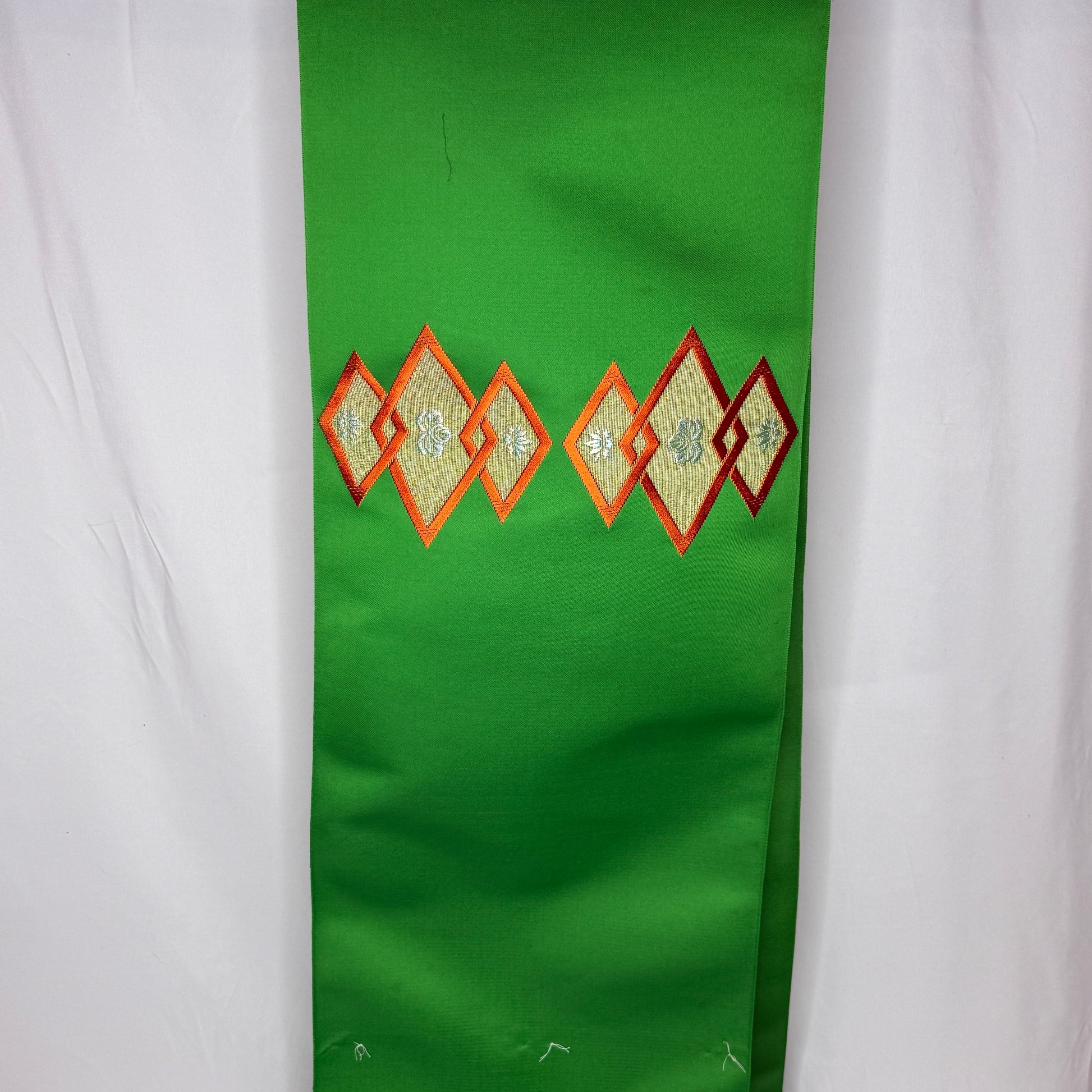 A saturated, jewel-toned green sets a luxurious foundation for this vintage nagoya obi bolt, immediately drawing the eye with its bold color and refined sheen. The decorative sections feature woven interlocking diamond shapes framing elegant paulownia motifs, a design long associated with prosperity and prestige. The motifs are rendered in soft metallic tones that contrast beautifully with the green background.