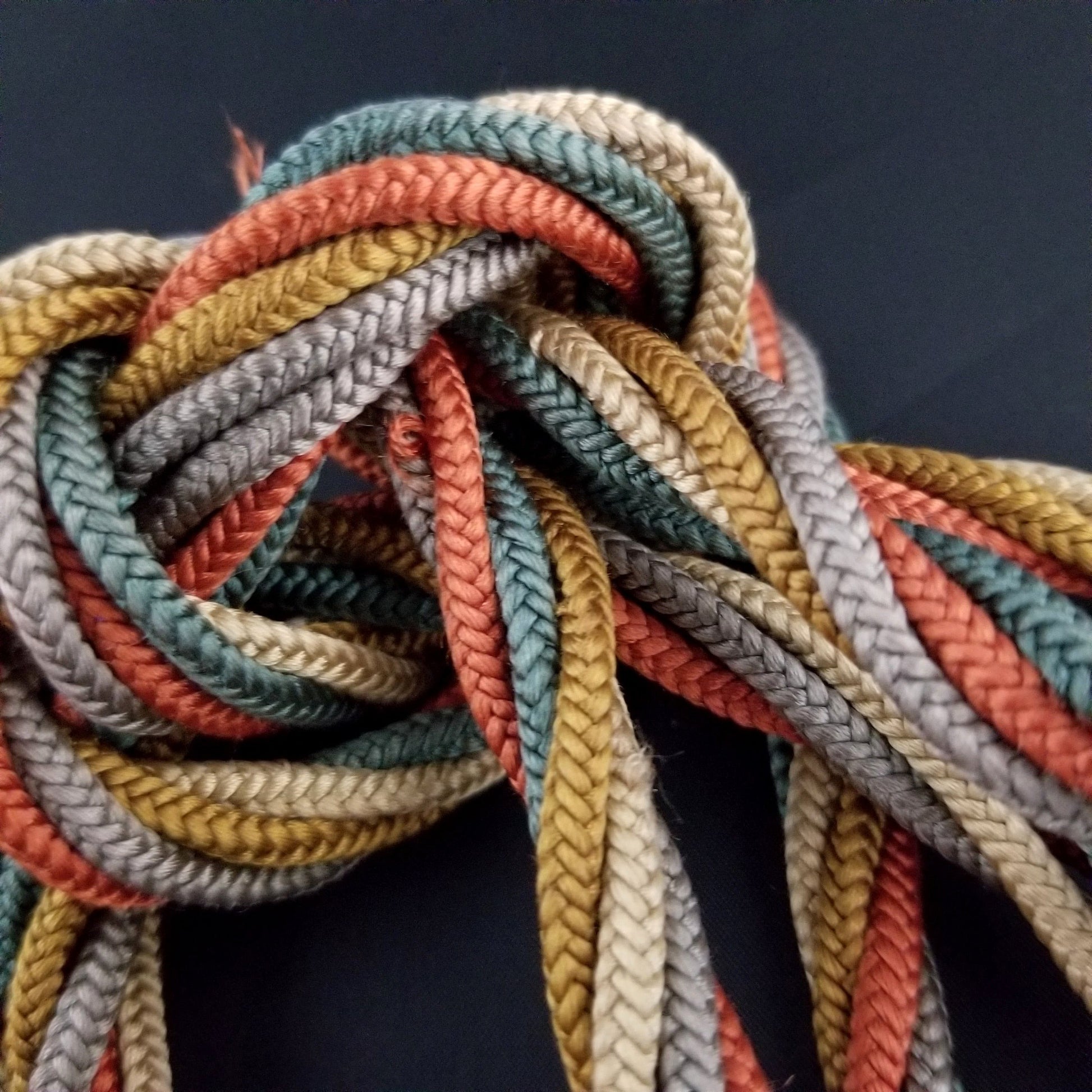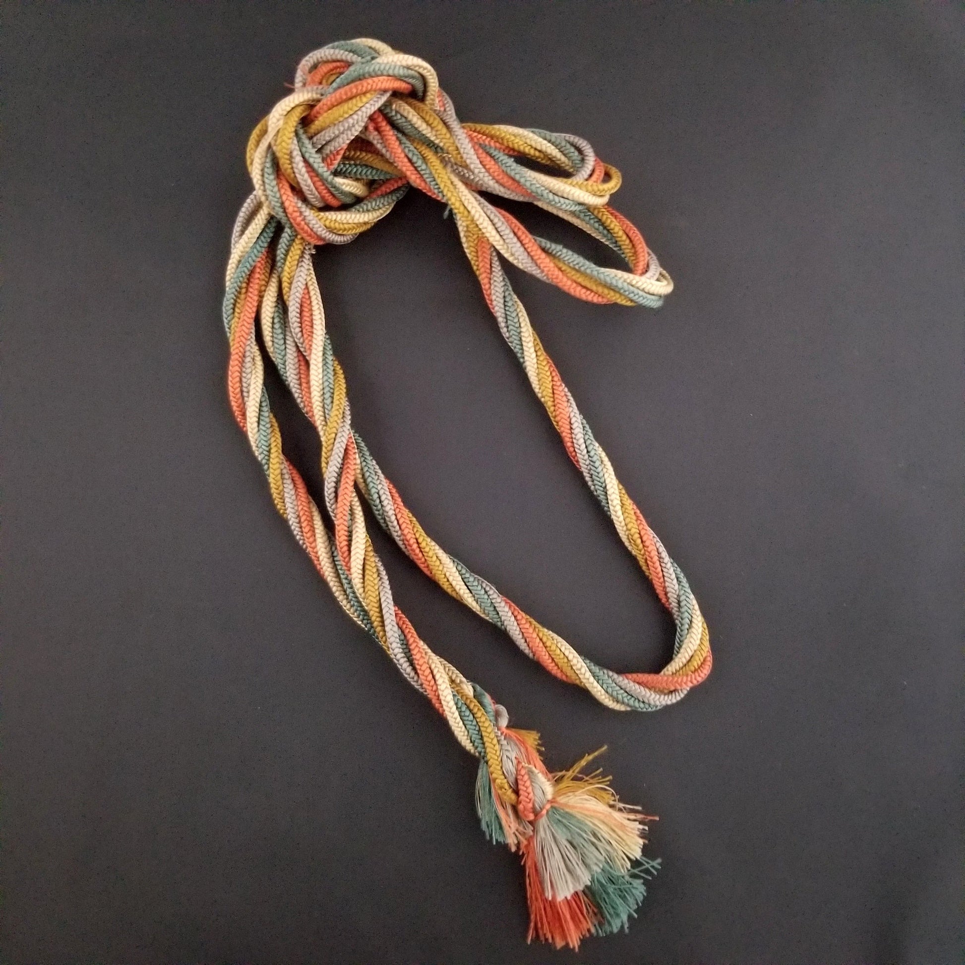 The obijime in this set is a twisted braid of 5 different colored cords that goes well with the obiage.
