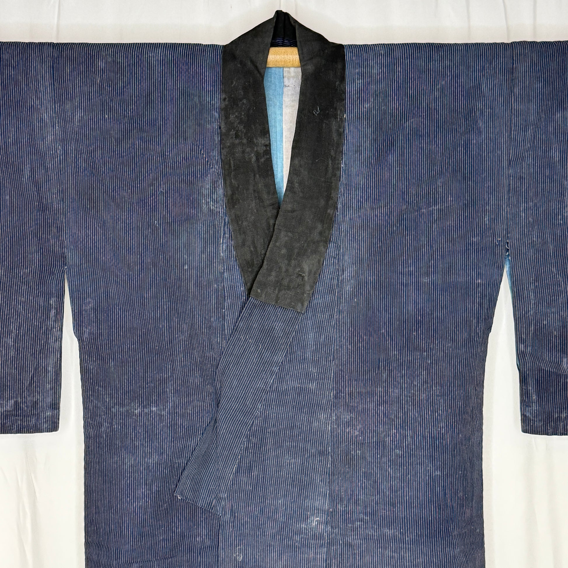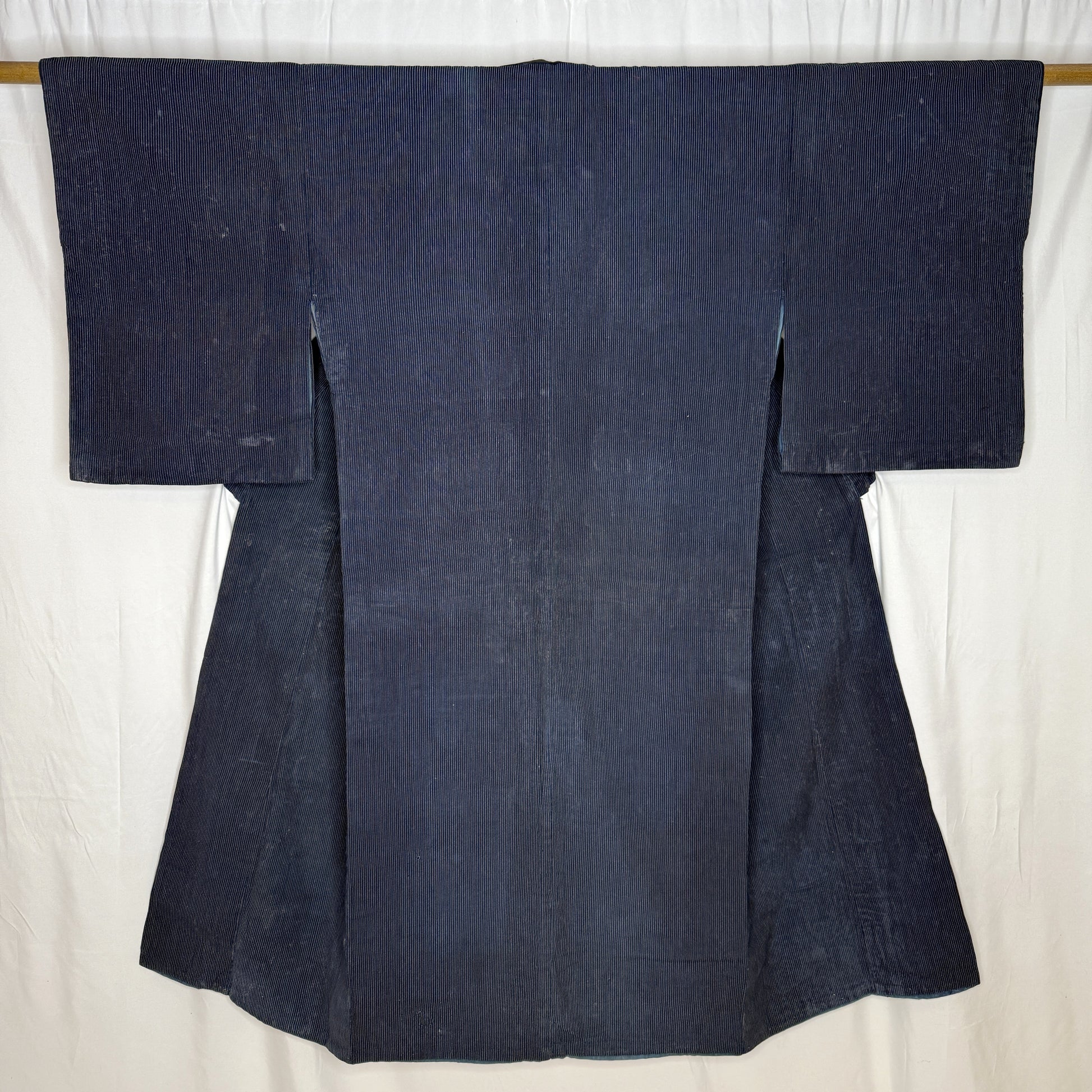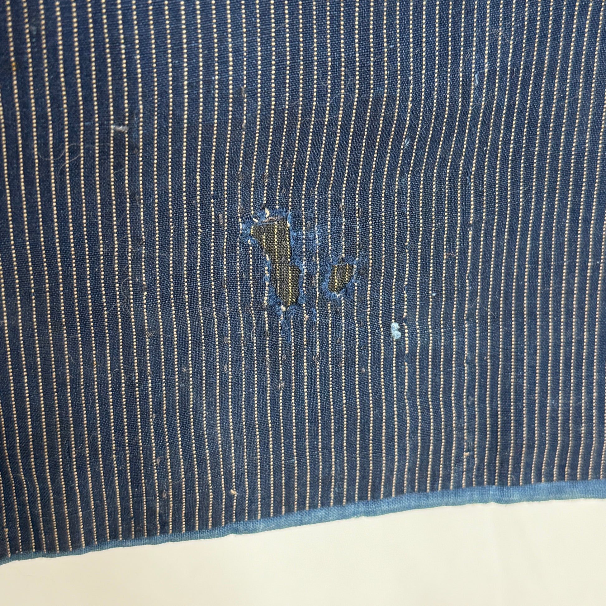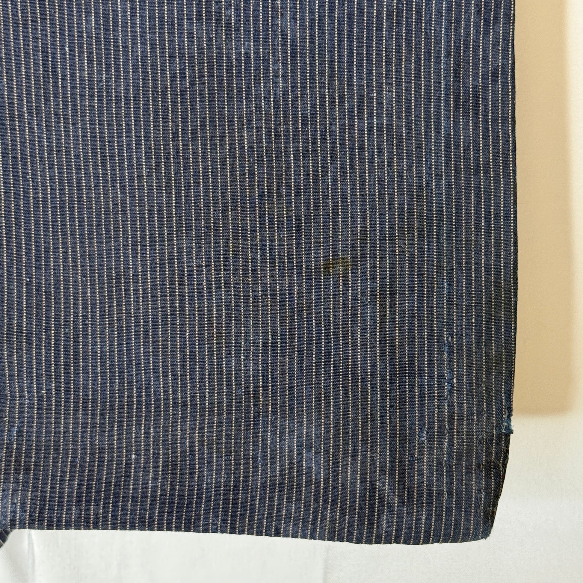 The heavy cotton fabric features a narrow vertical pinstripe pattern and yes, there are signs of age, natural fading, soft wear, and blemishes that could possibly be lightened with a gentle washing if desired. However, we think these qualities add warmth and authenticity rather than detract from its beauty.