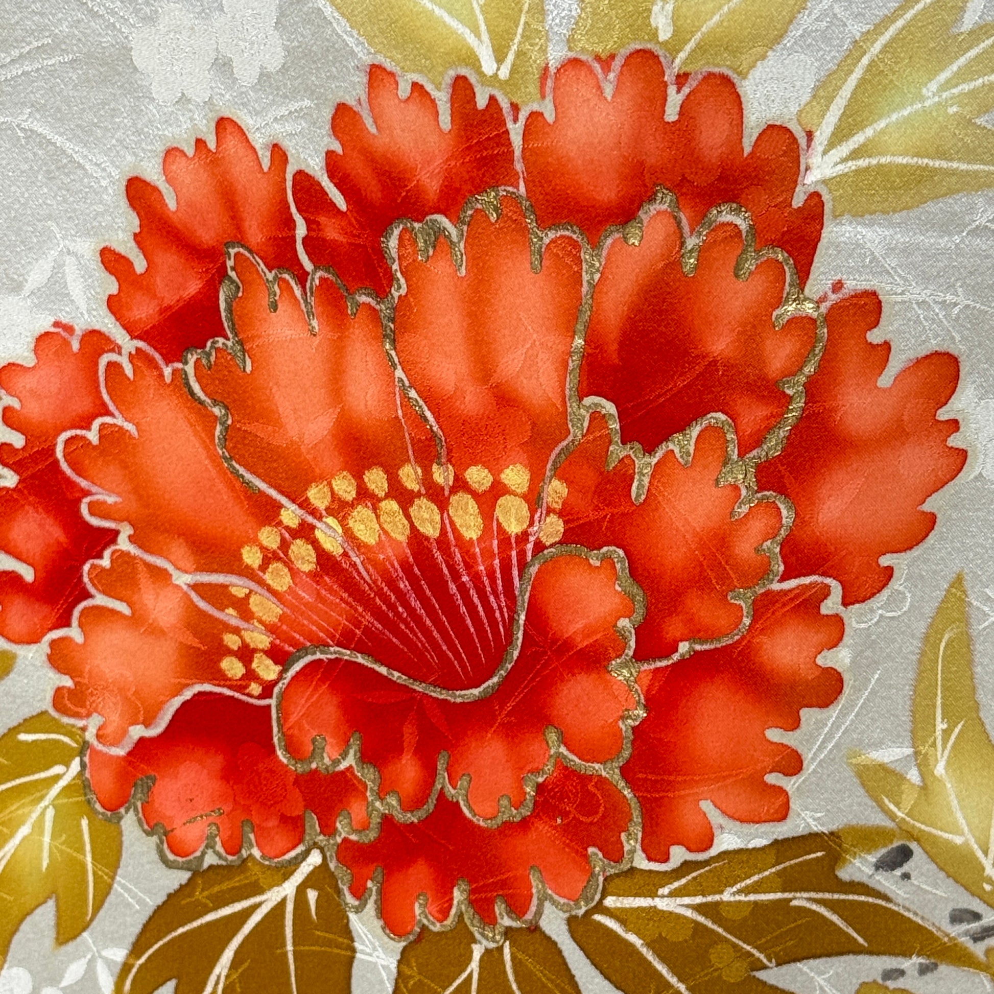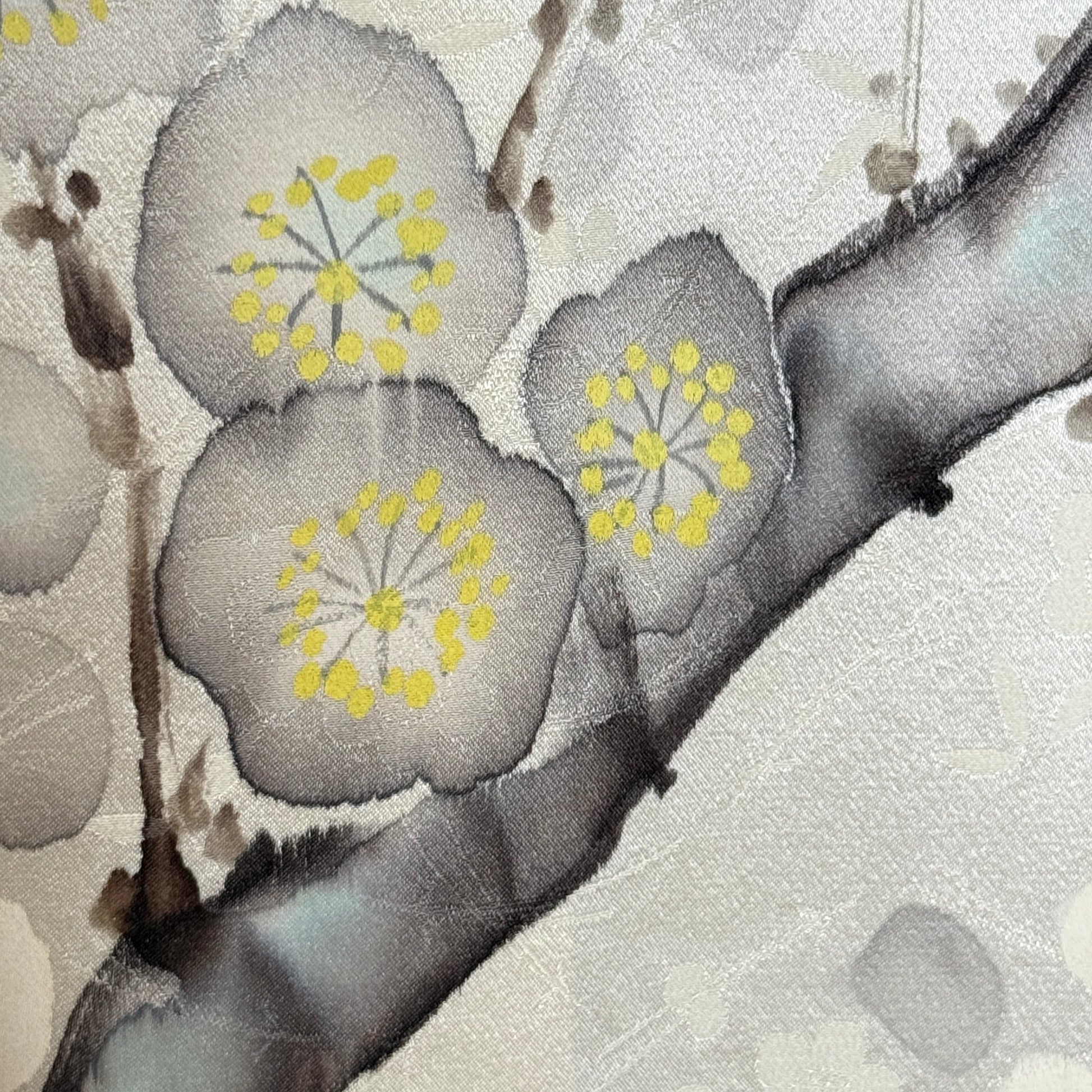 Soft gray branches sweep across a silvery background, dotted with delicate plum blossoms and anchored by bold orange peonies that bring warmth and contrast to the scene. This tapestry balances quiet winter tones with bursts of color, creating a composition about to burst forth. Plum blossoms represent resilience and renewal, blooming in late winter, while peonies are associated with beauty, prosperity, and good fortune. Together, they tell a story of strength and abundance emerging from stillness.