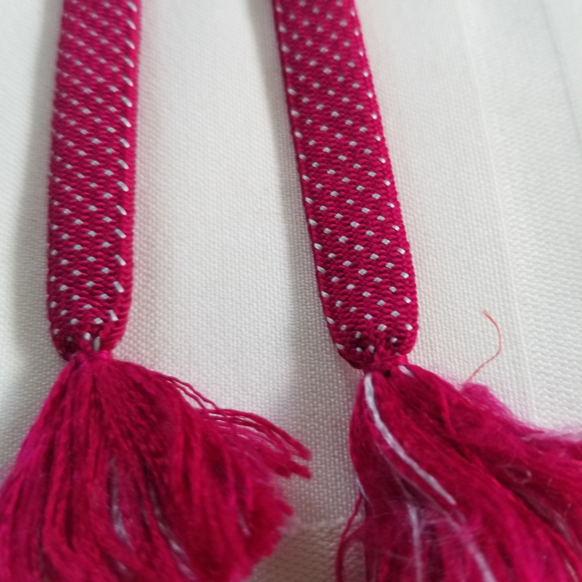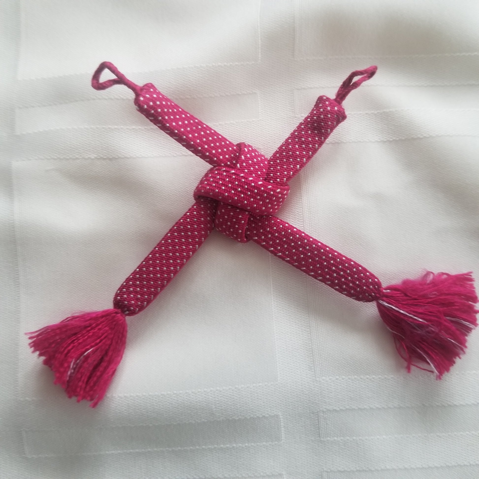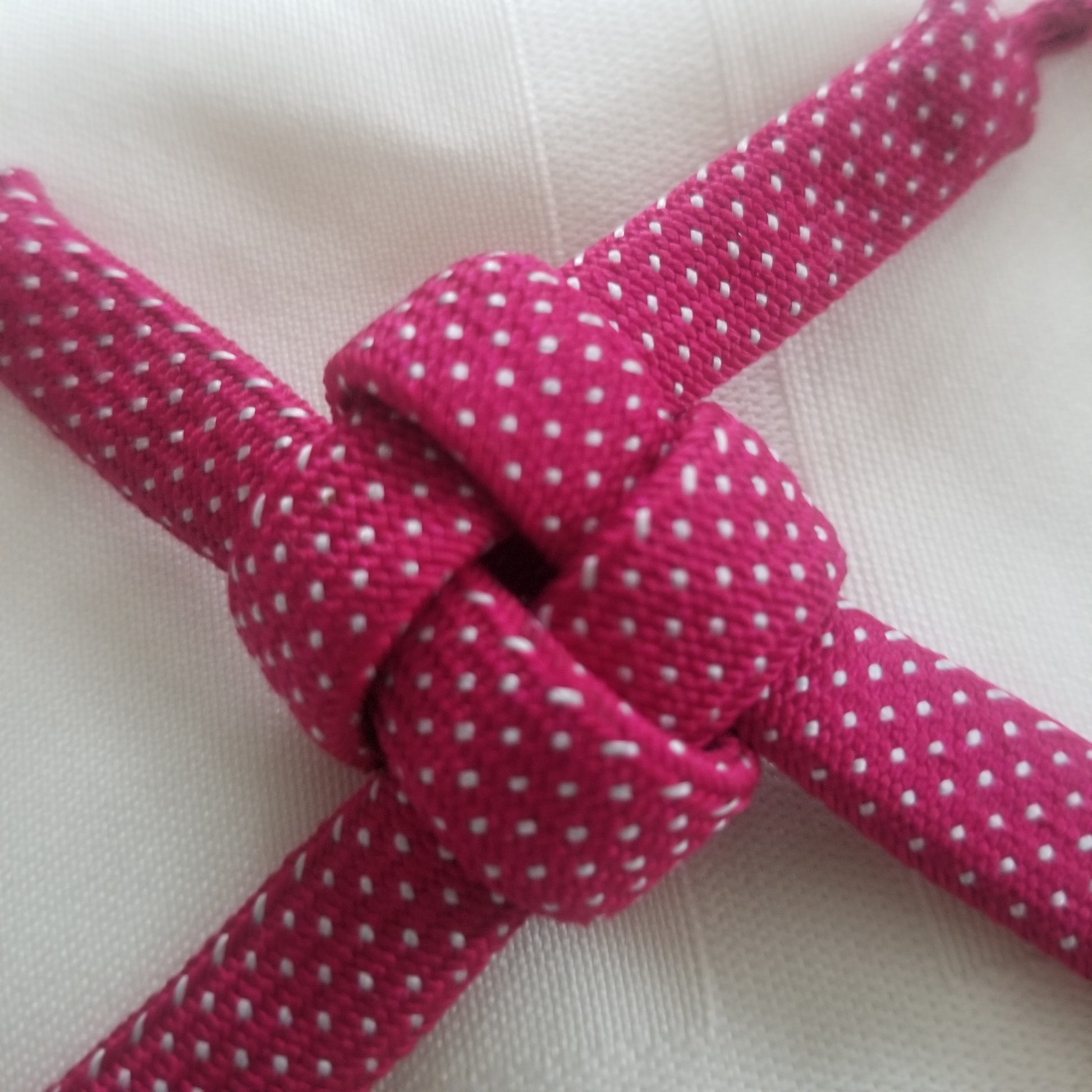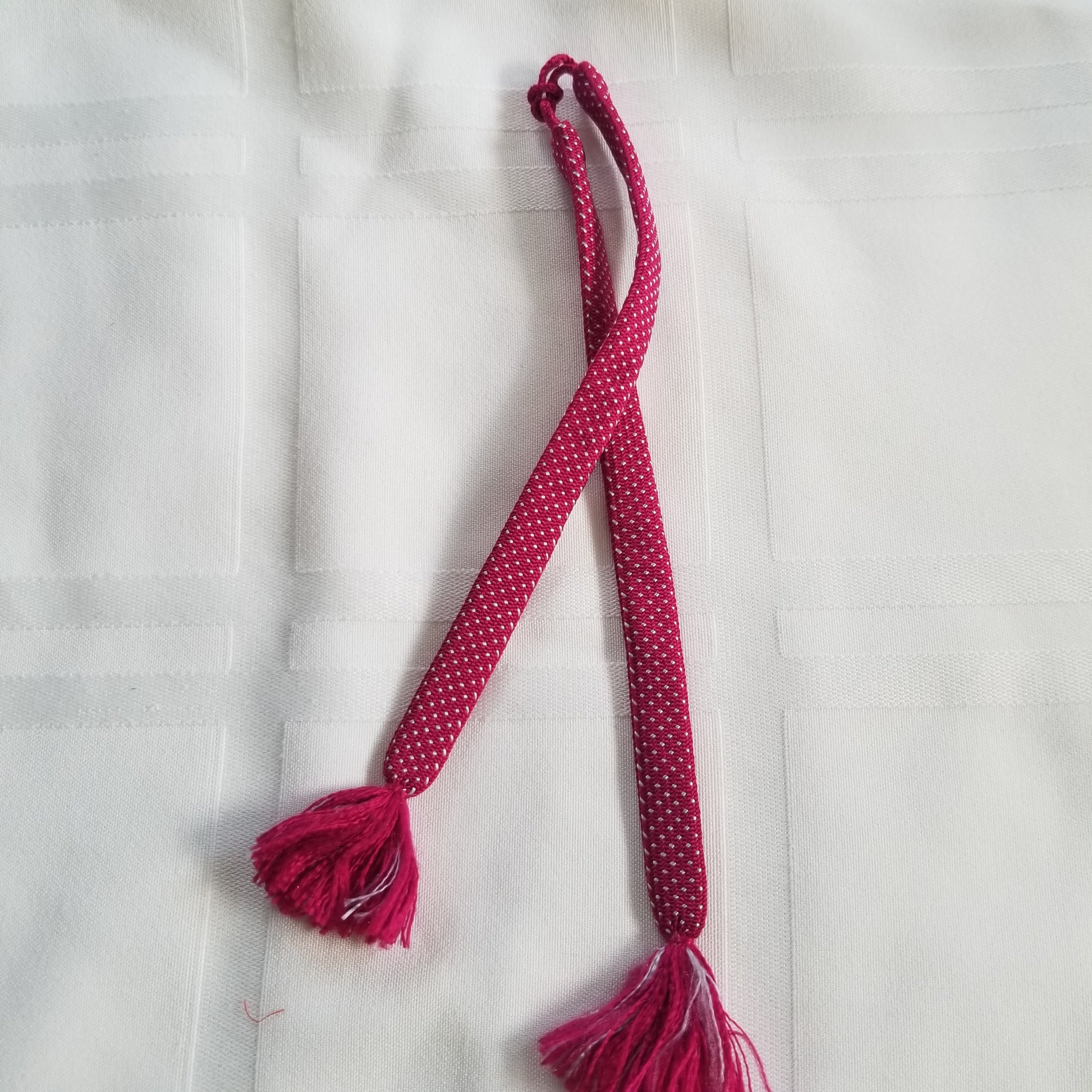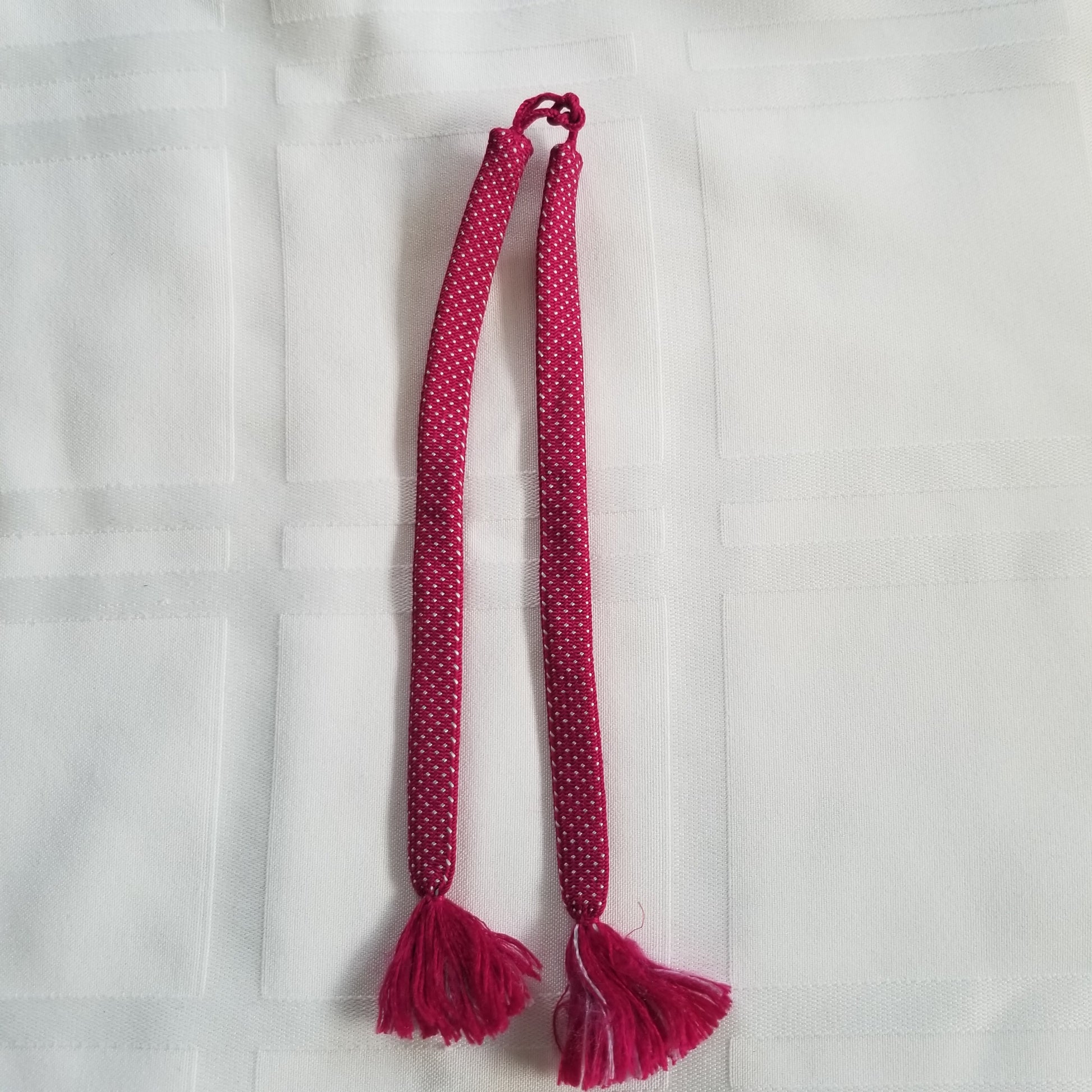 This listing is for a pair of vintage himo ties in a bright berry pink with a pattern of tiny white dots throughout. Simple but fun!