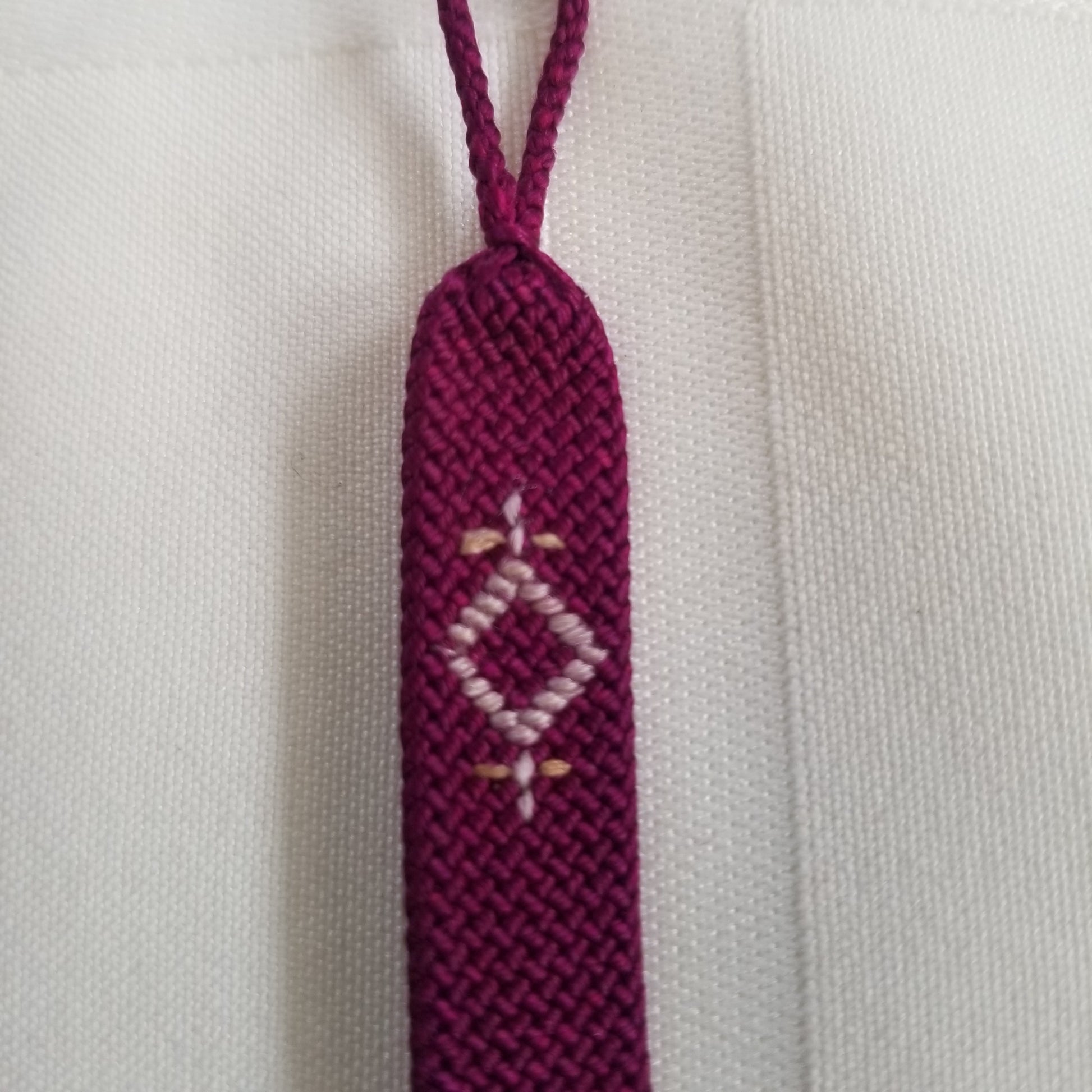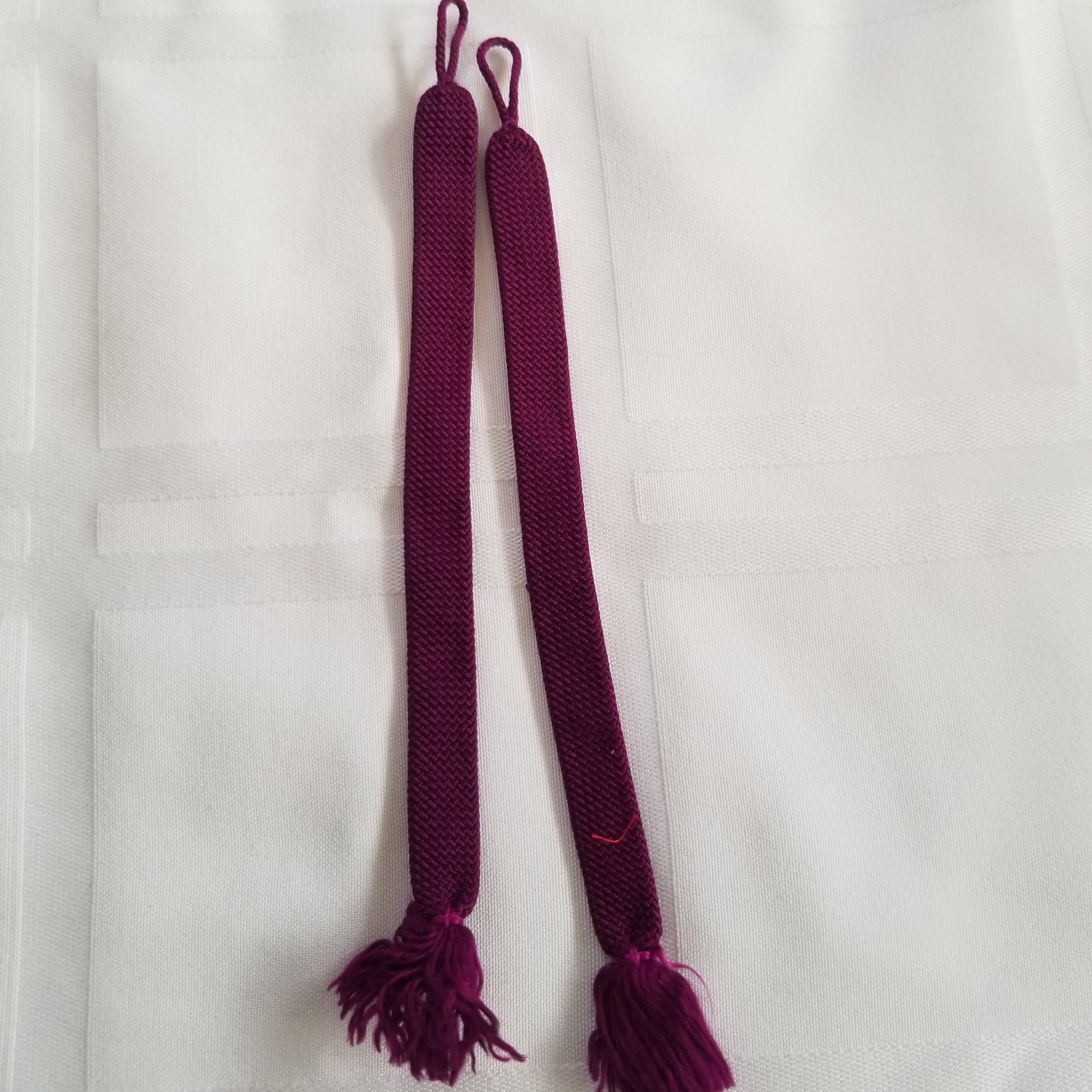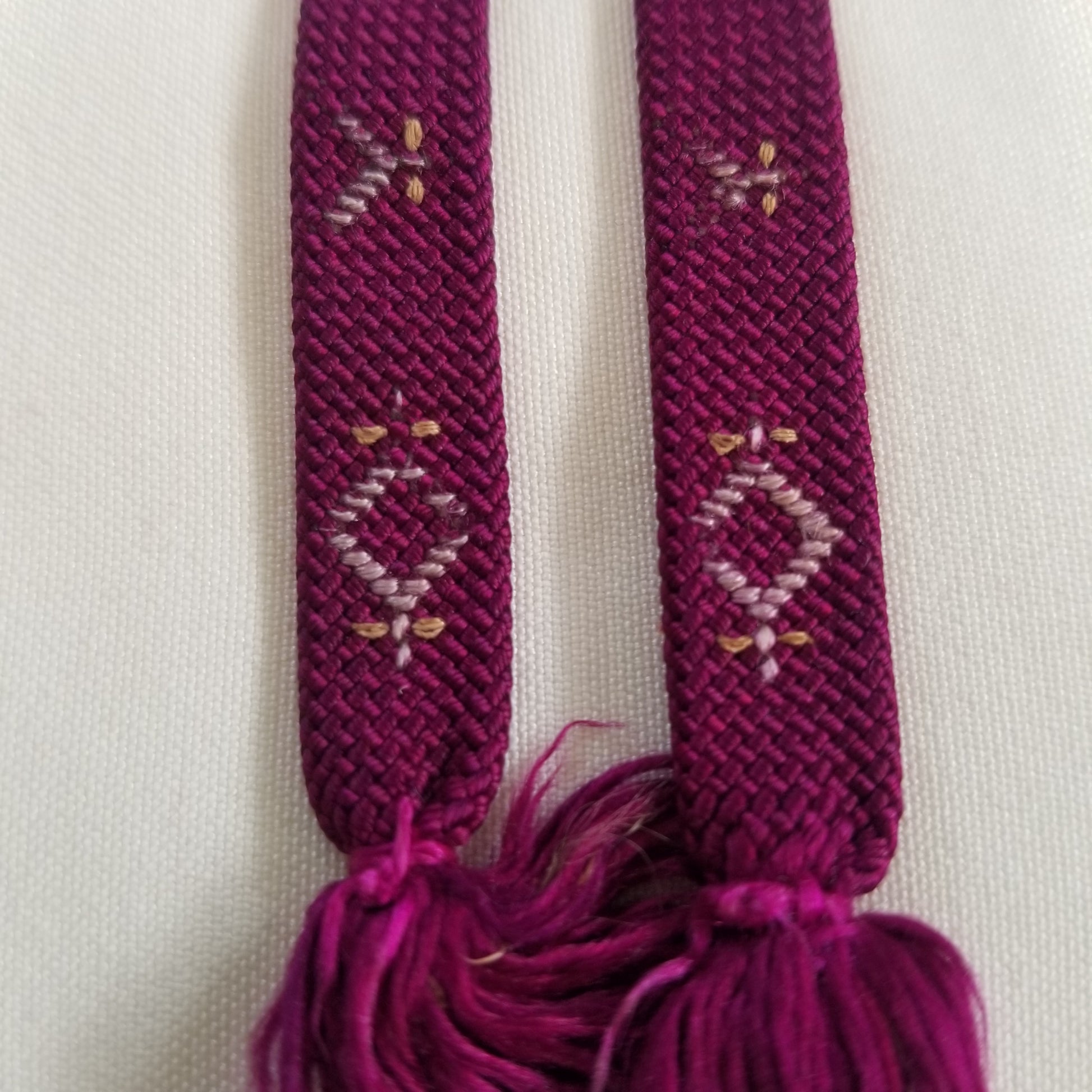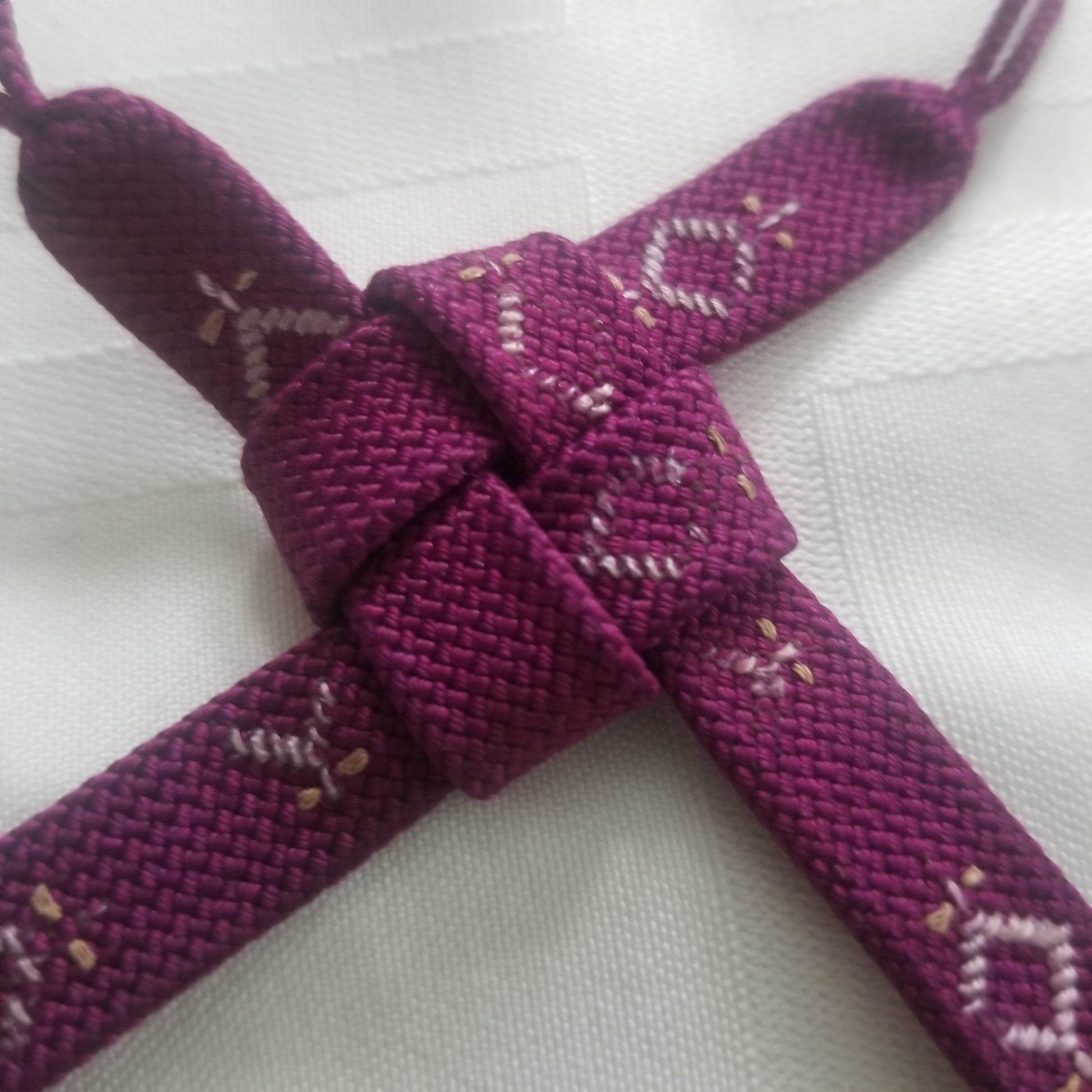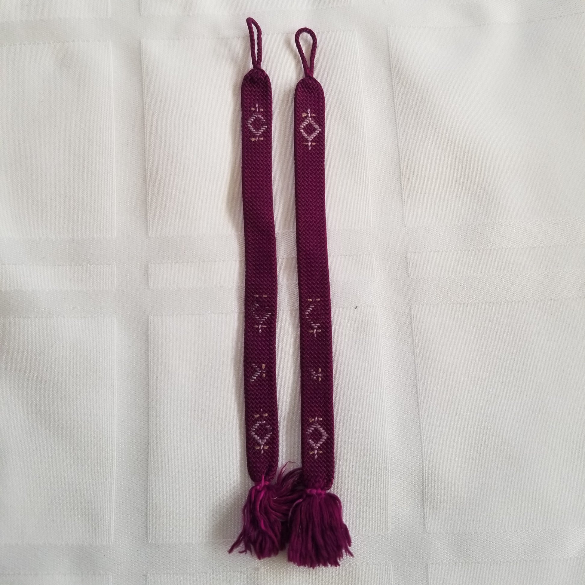 This listing is for a pair of vintage himo ties in a dark purple with an abstract geometric pattern of a diamond shape with a cross attached woven in what might have been gold at one point. Age may have faded the sheen but it design is still strong.