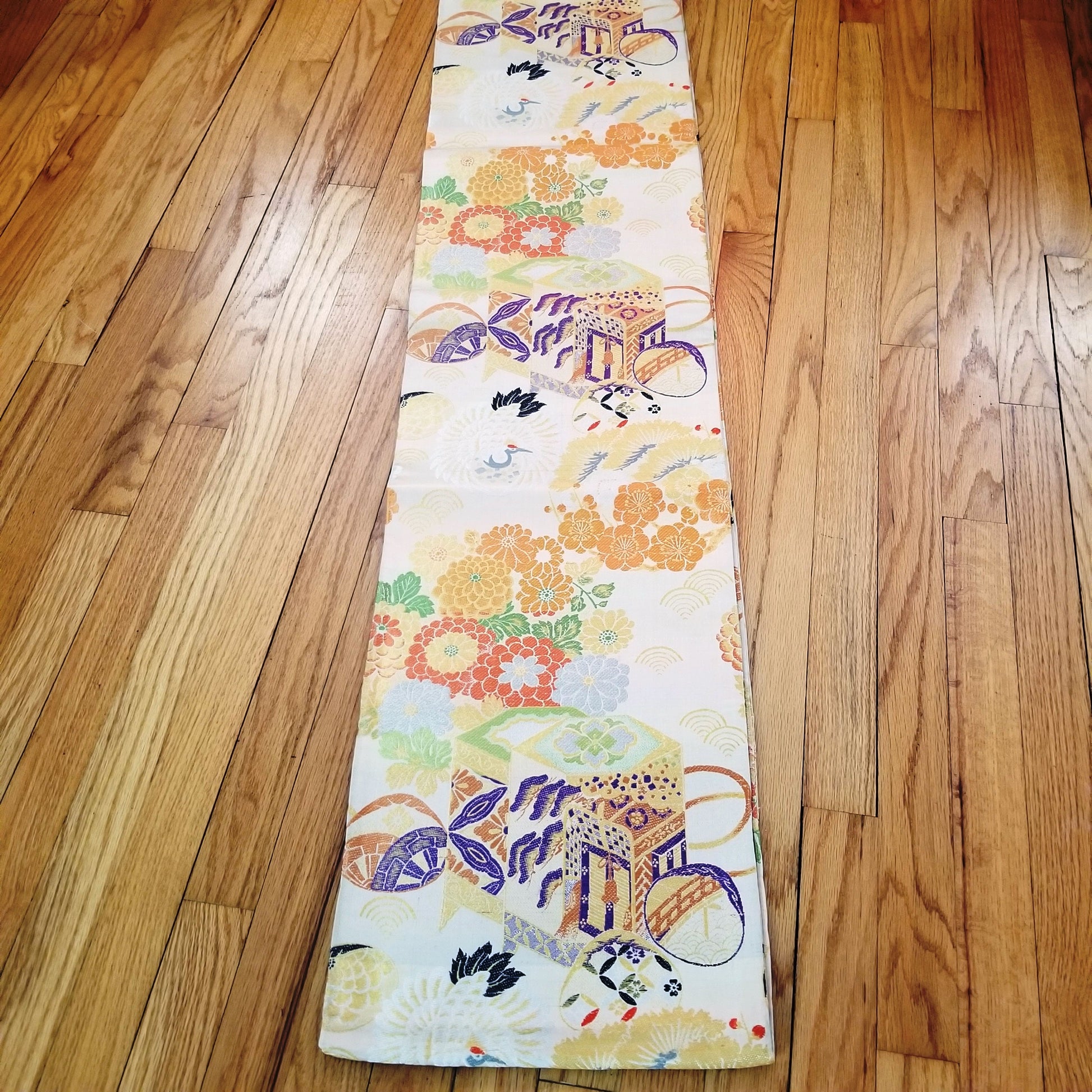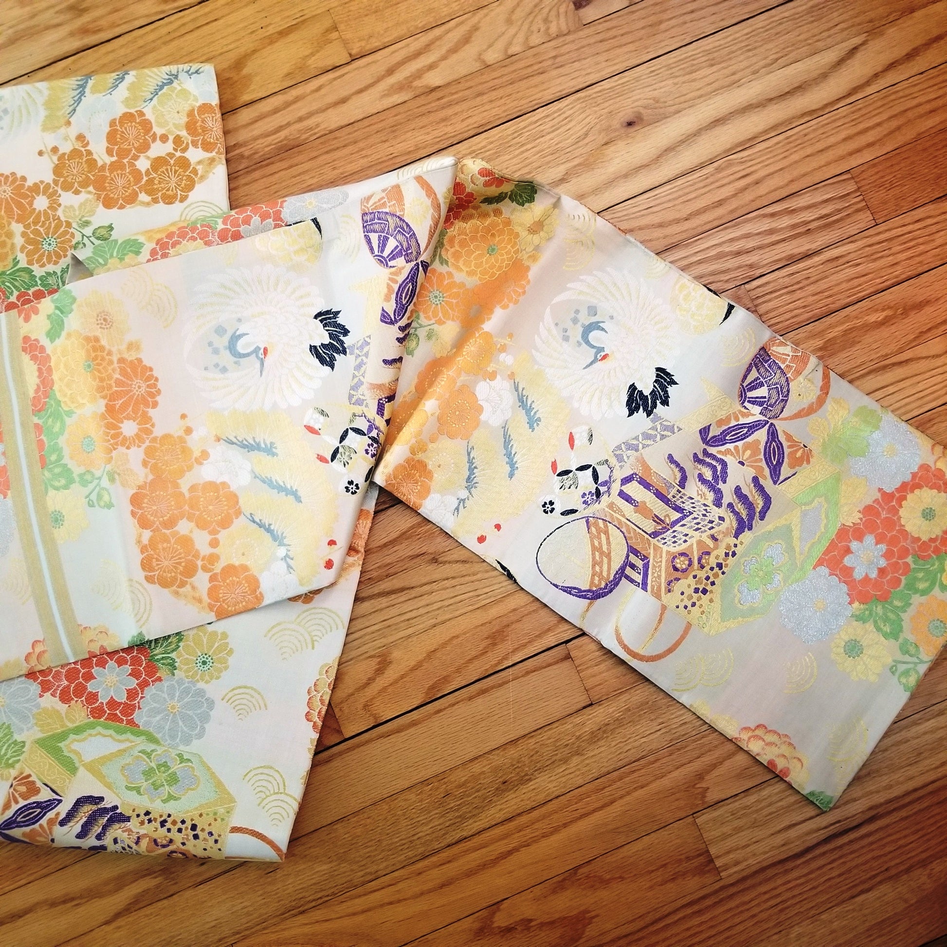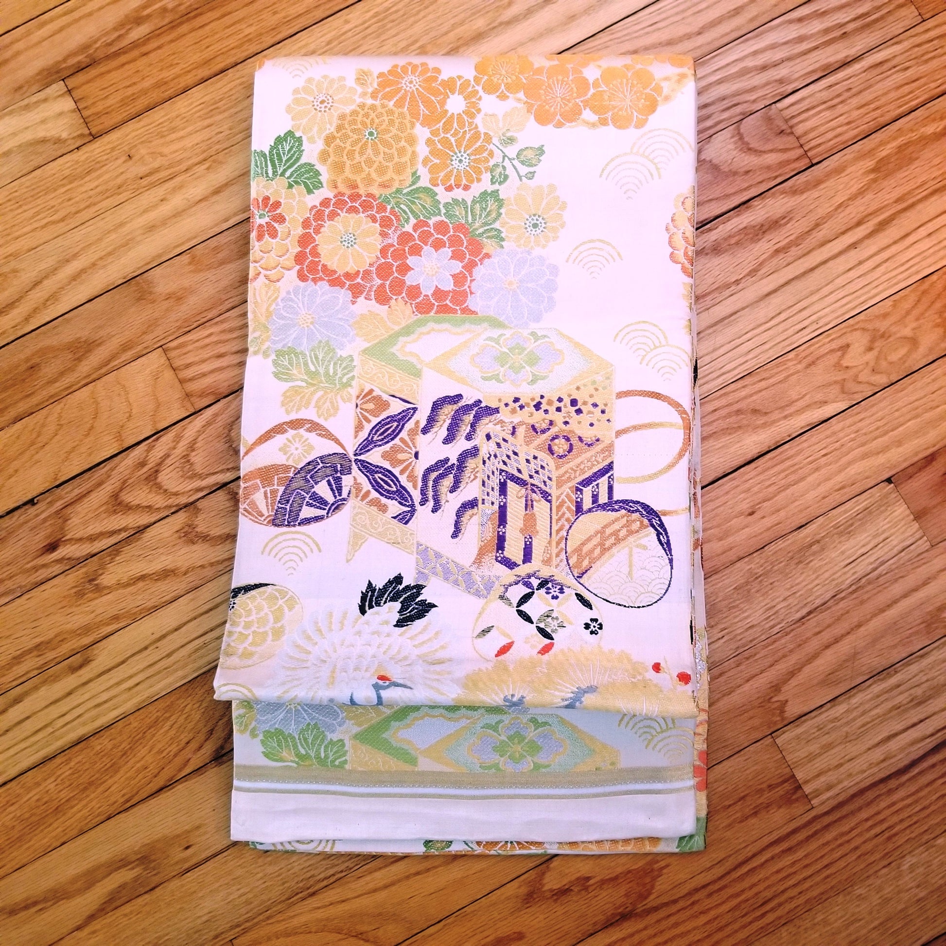 This obi features a traditional pattern of cranes and imperial carts - both auspicious elements - but look more closely to see that the cart is just decoration on a kai awase game box. Kai awase is a matching shell game and is stored in a multi-sided container similar to the one featured in this obi design. See the half shells at the obi edges, each decorated with a different image to match.