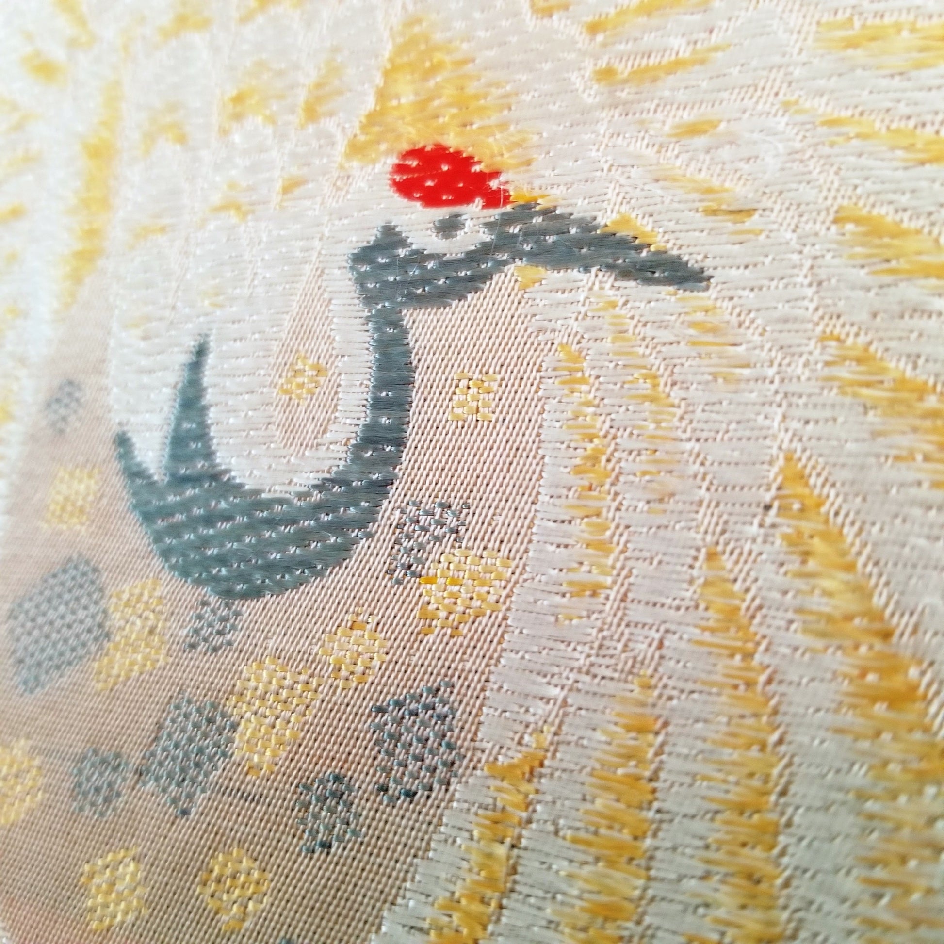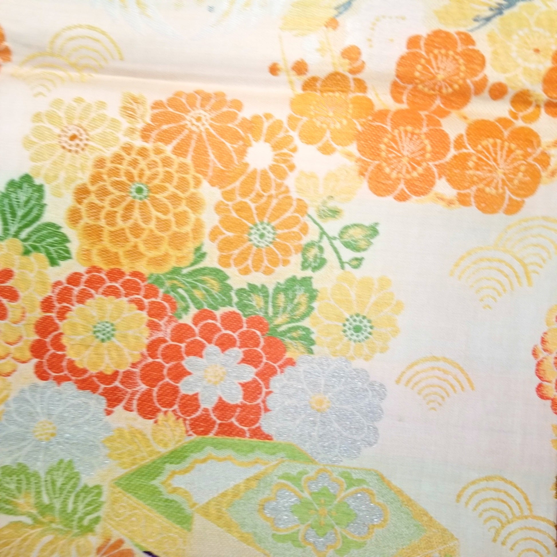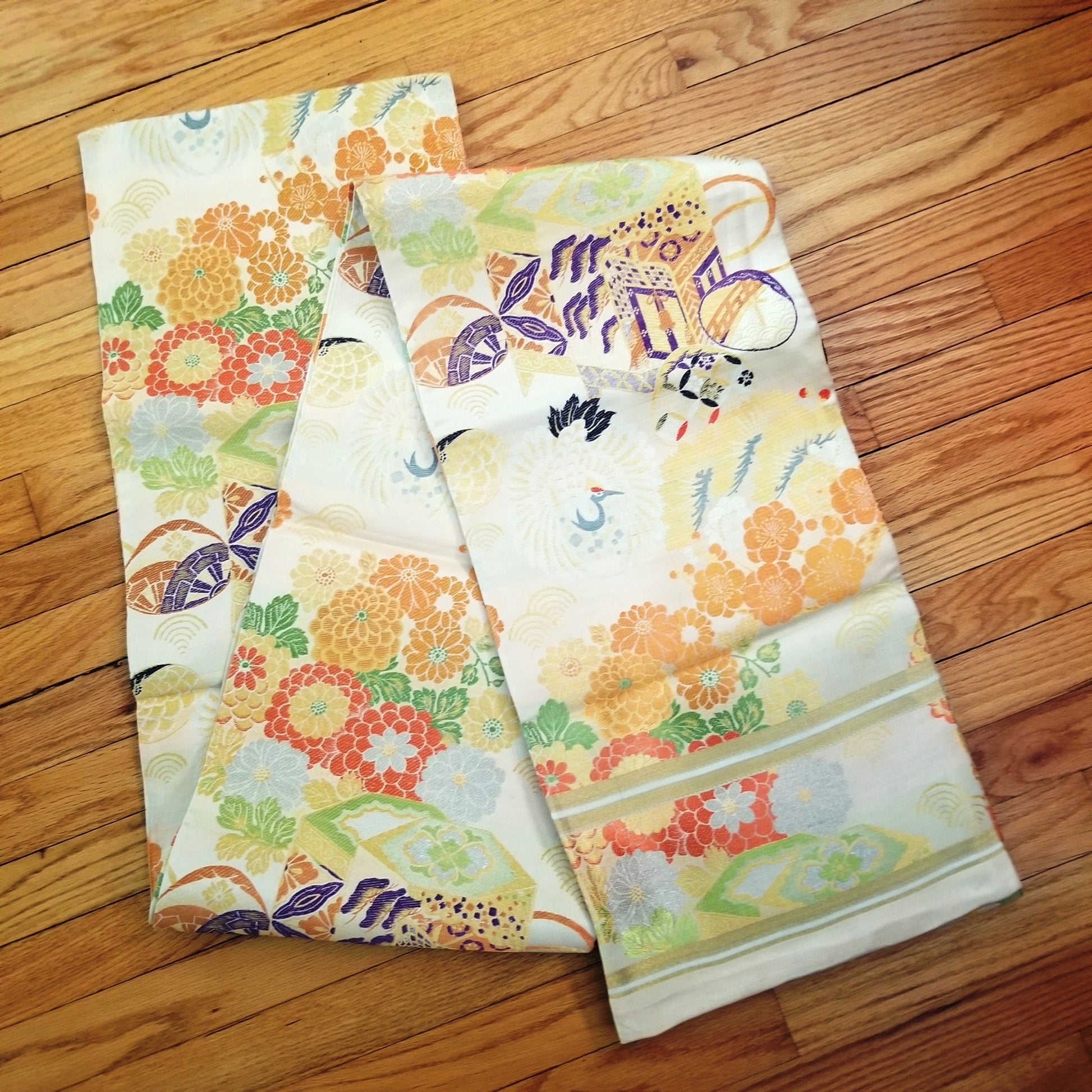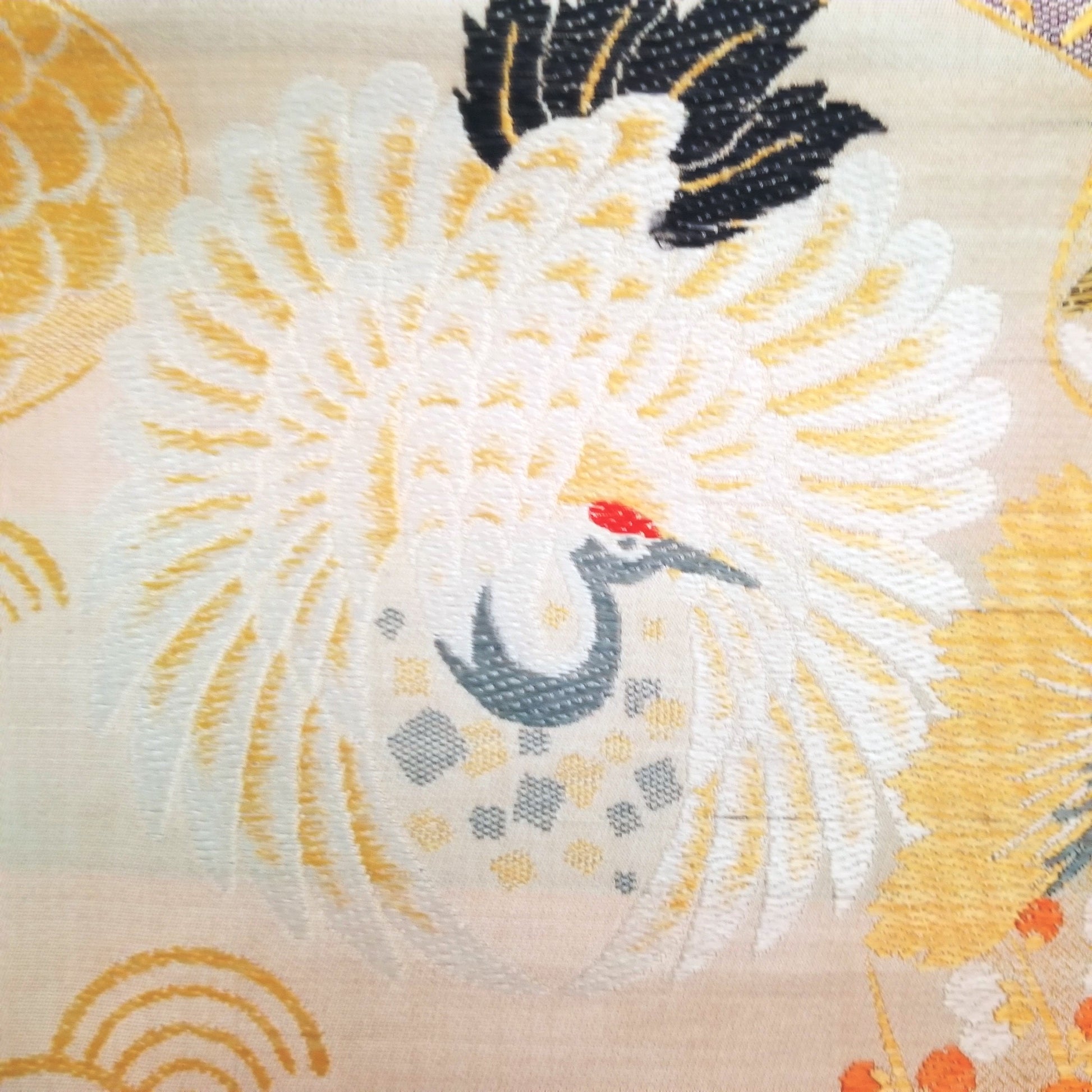 This obi features a traditional pattern of cranes and imperial carts - both auspicious elements - but look more closely to see that the cart is just decoration on a kai awase game box. Kai awase is a matching shell game and is stored in a multi-sided container similar to the one featured in this obi design. See the half shells at the obi edges, each decorated with a different image to match.