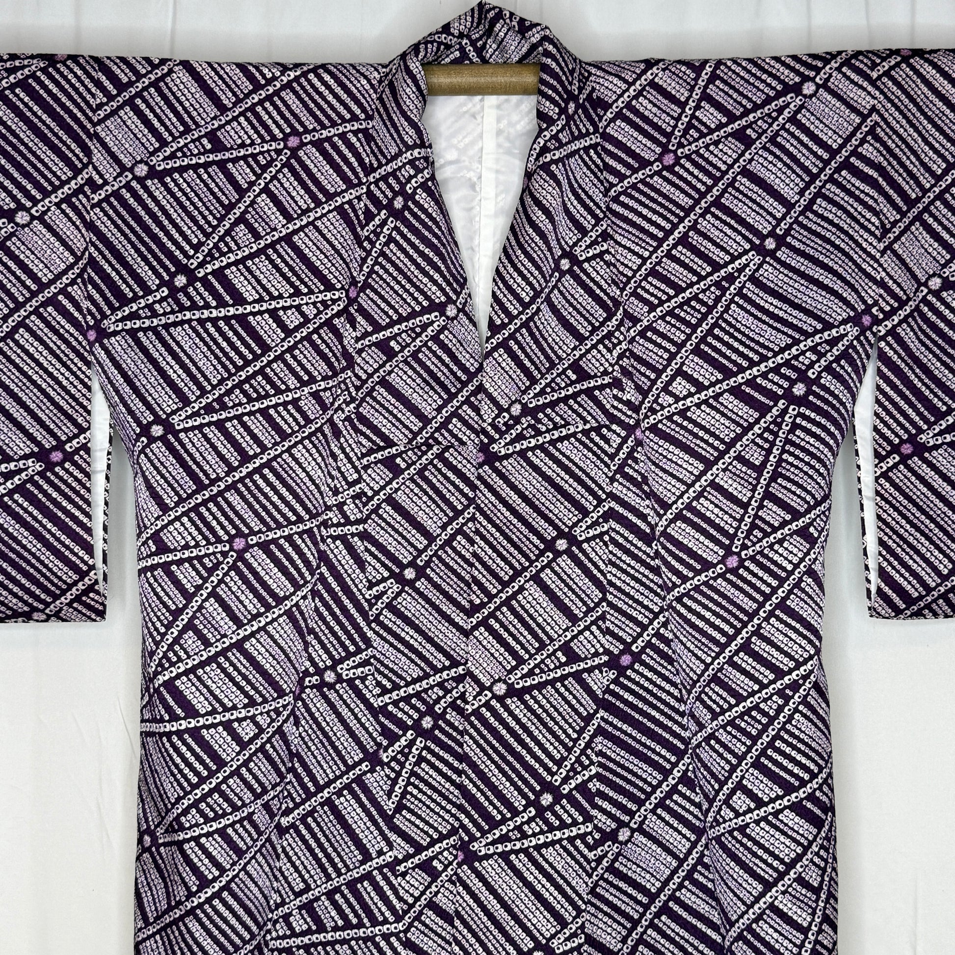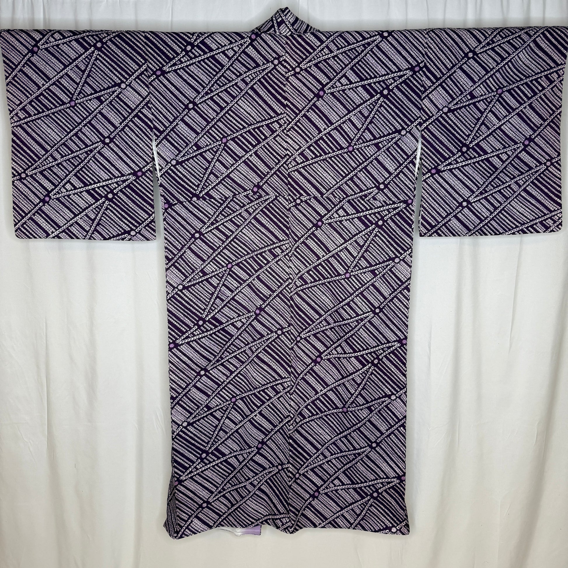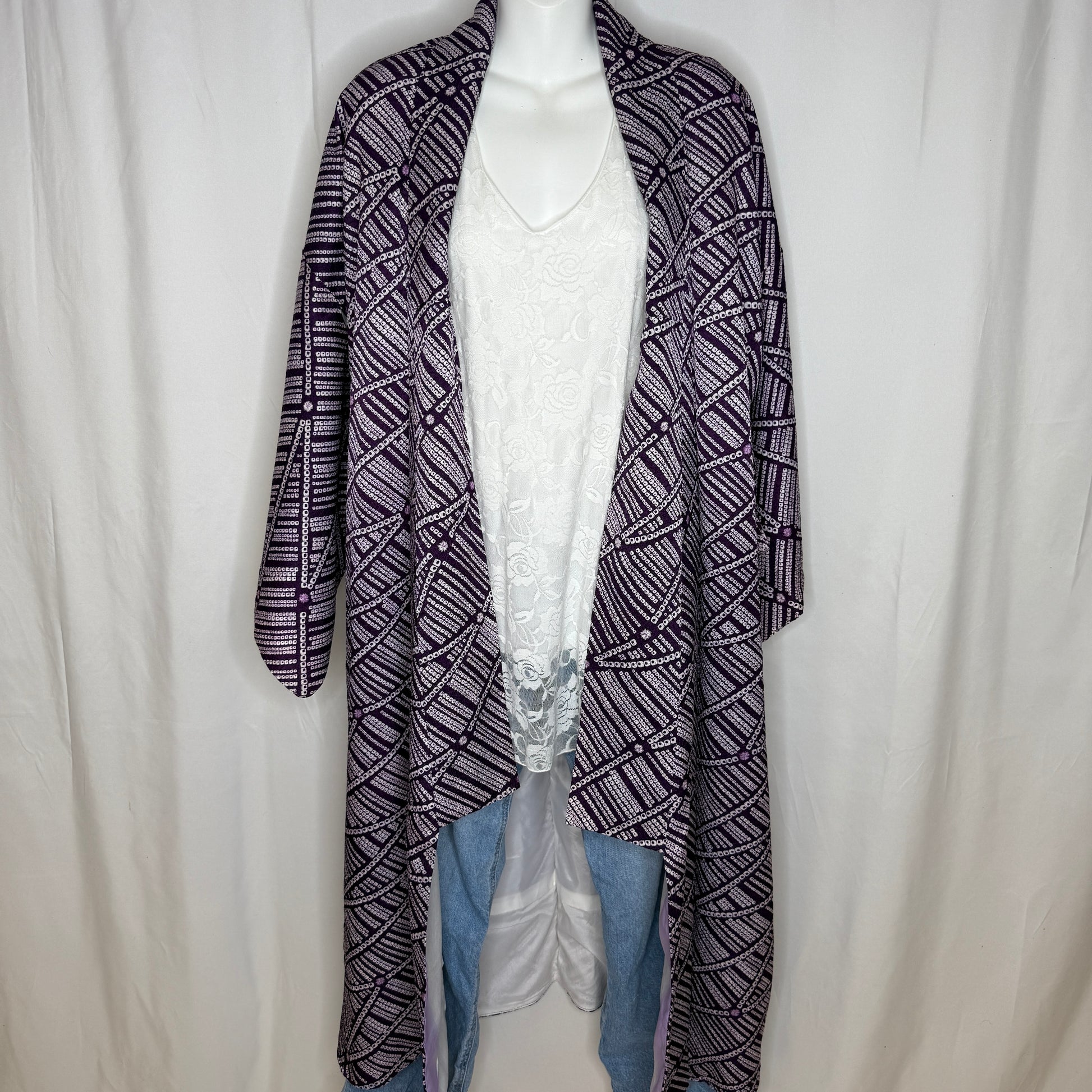 Graphic rhythm meets traditional craft in this striking kimono robe. Rendered in deep purple and crisp white, the surface is alive with flowing linear patterns inspired by classic shibori design, reinterpreted here through stenciling for a bold, modern look. The synthetic blend fabric has a subtle crinkle texture intentionally created to echo the tactile pucker of hand-tied shibori, giving the garment visual depth and movement without added weight.