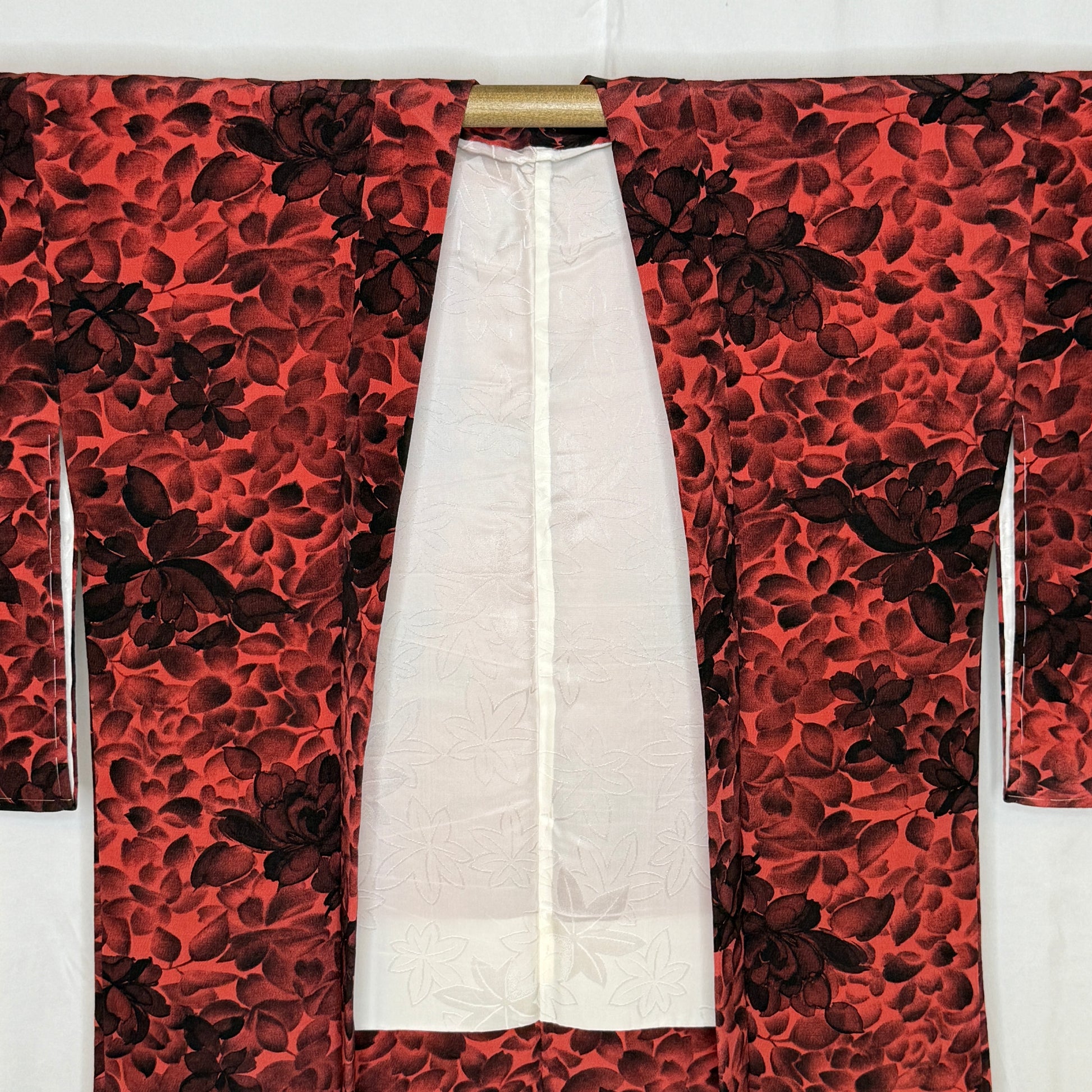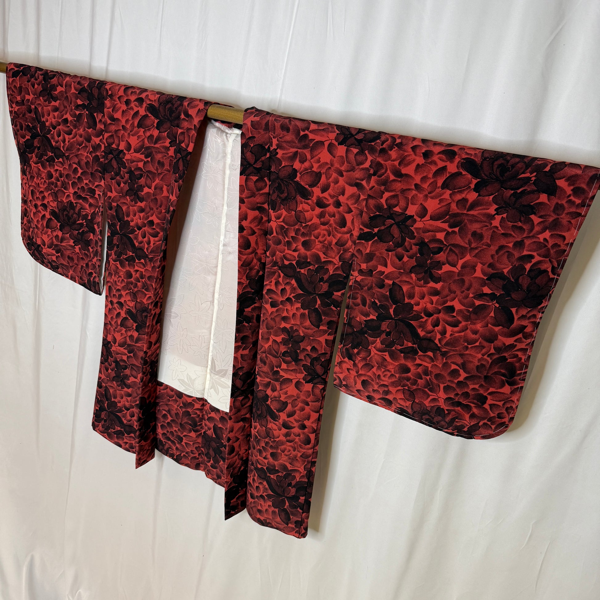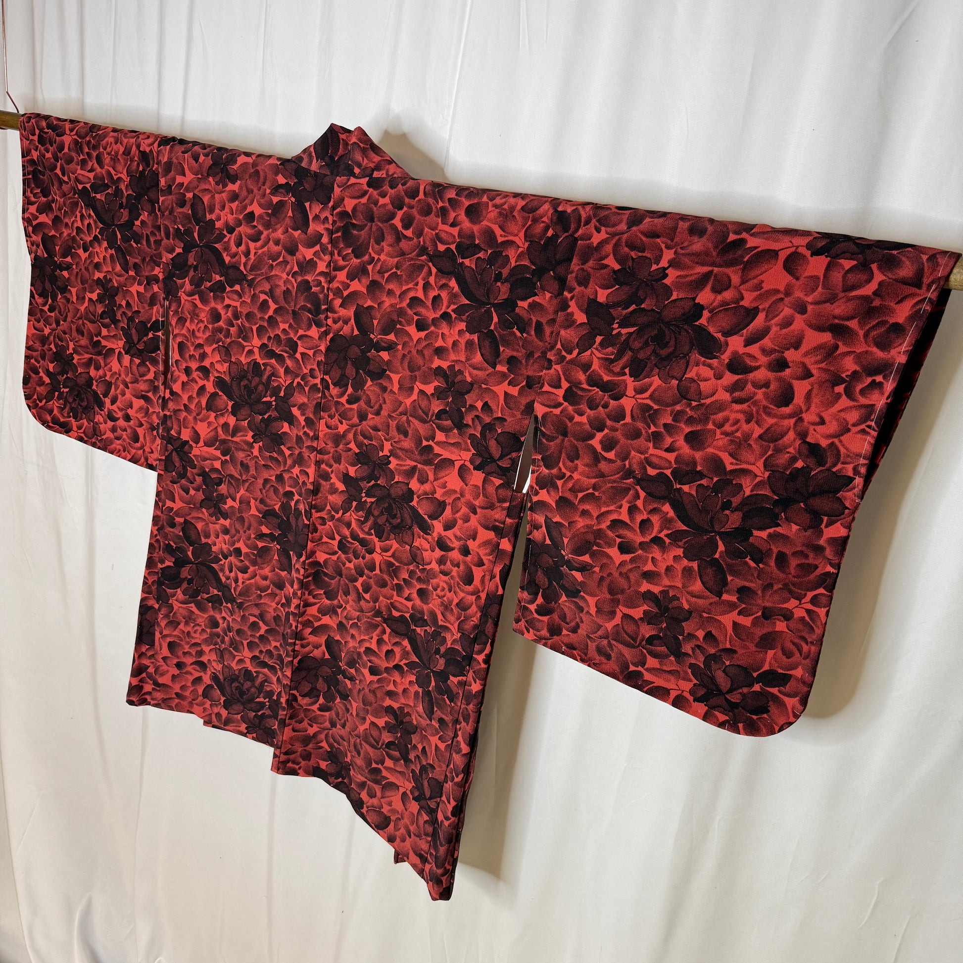 This woman's haori jacket has a deep coral background patterned with lush, shadowed peonies that seem to bloom in clusters like a field of blossoms at sunset. The petals are expertly shaded, creating both depth and drama. The peony or botan is known as the "King of Flowers" in Japan, representing prosperity, bravery, and honor, as well as beauty. A bold statement piece displayed or worn!