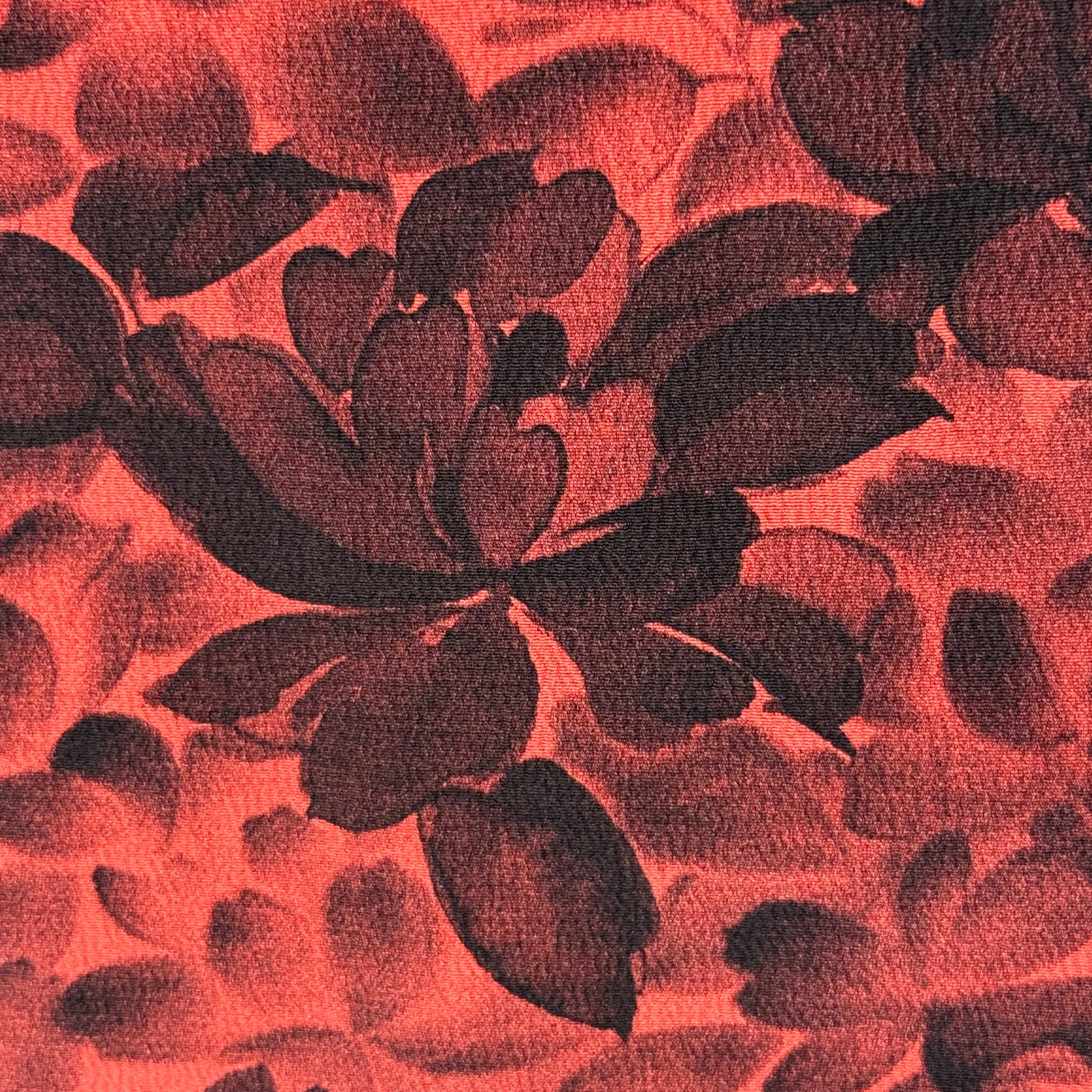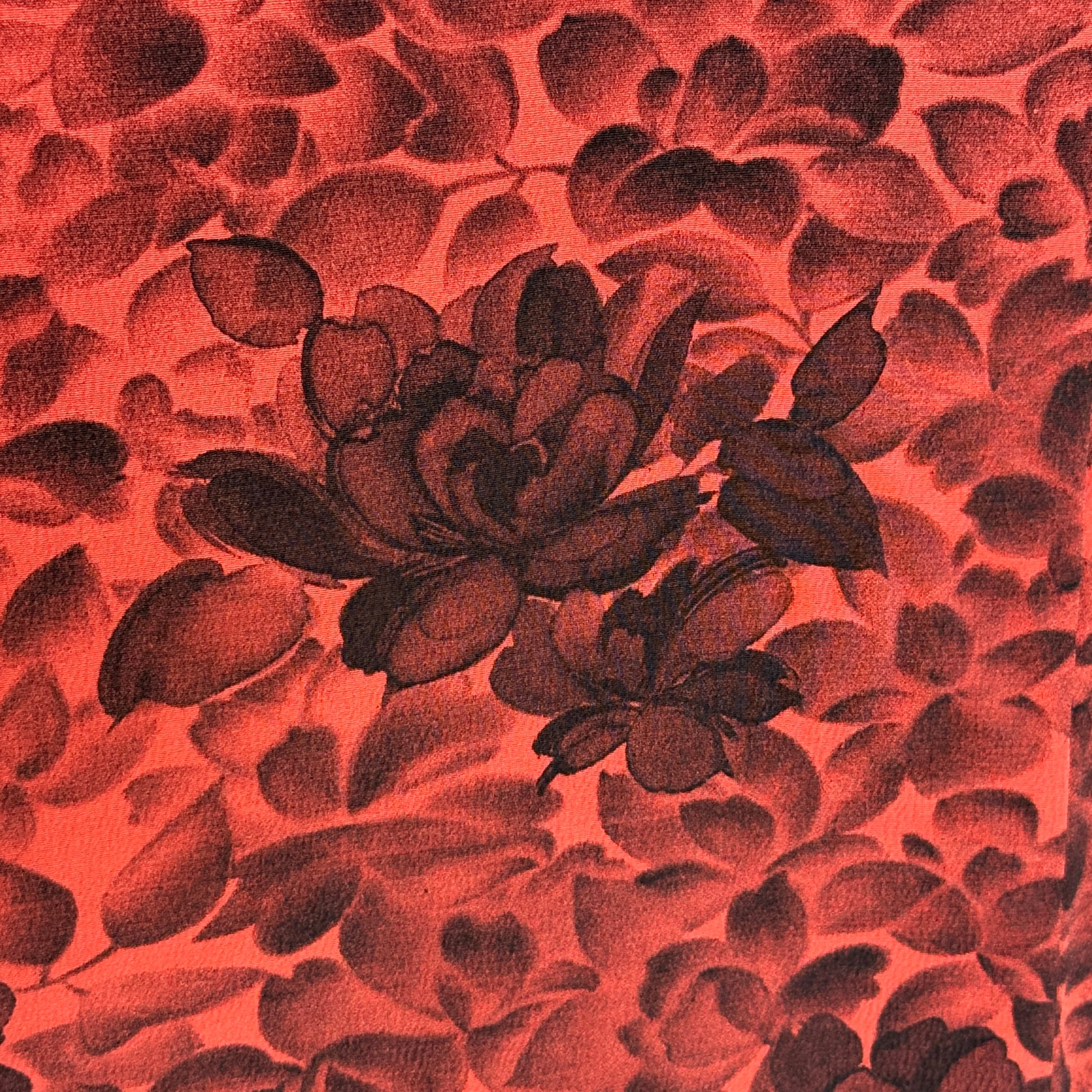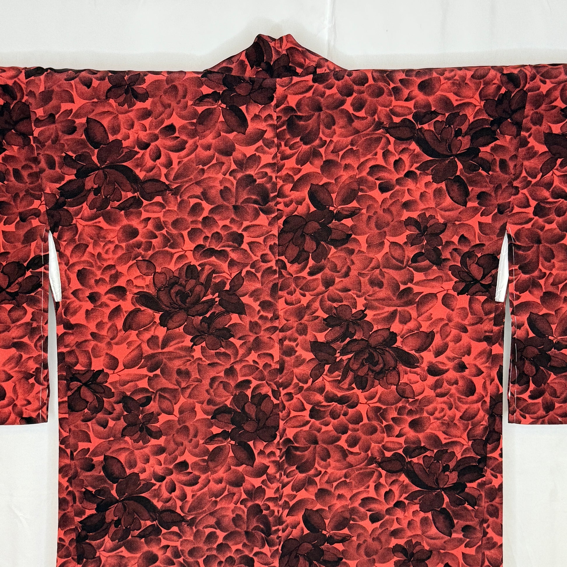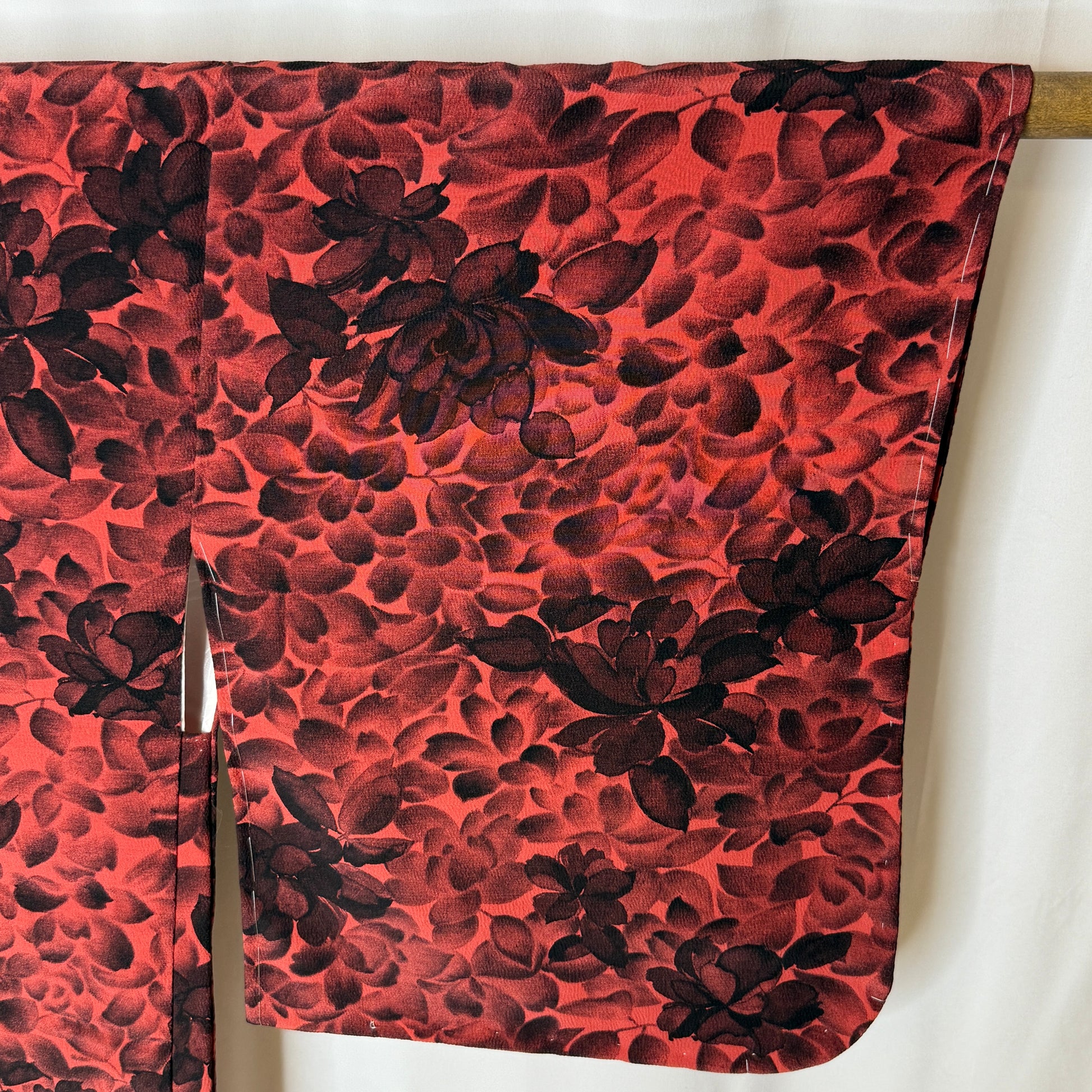 This woman's haori jacket has a deep coral background patterned with lush, shadowed peonies that seem to bloom in clusters like a field of blossoms at sunset. The petals are expertly shaded, creating both depth and drama. The peony or botan is known as the "King of Flowers" in Japan, representing prosperity, bravery, and honor, as well as beauty. A bold statement piece displayed or worn!