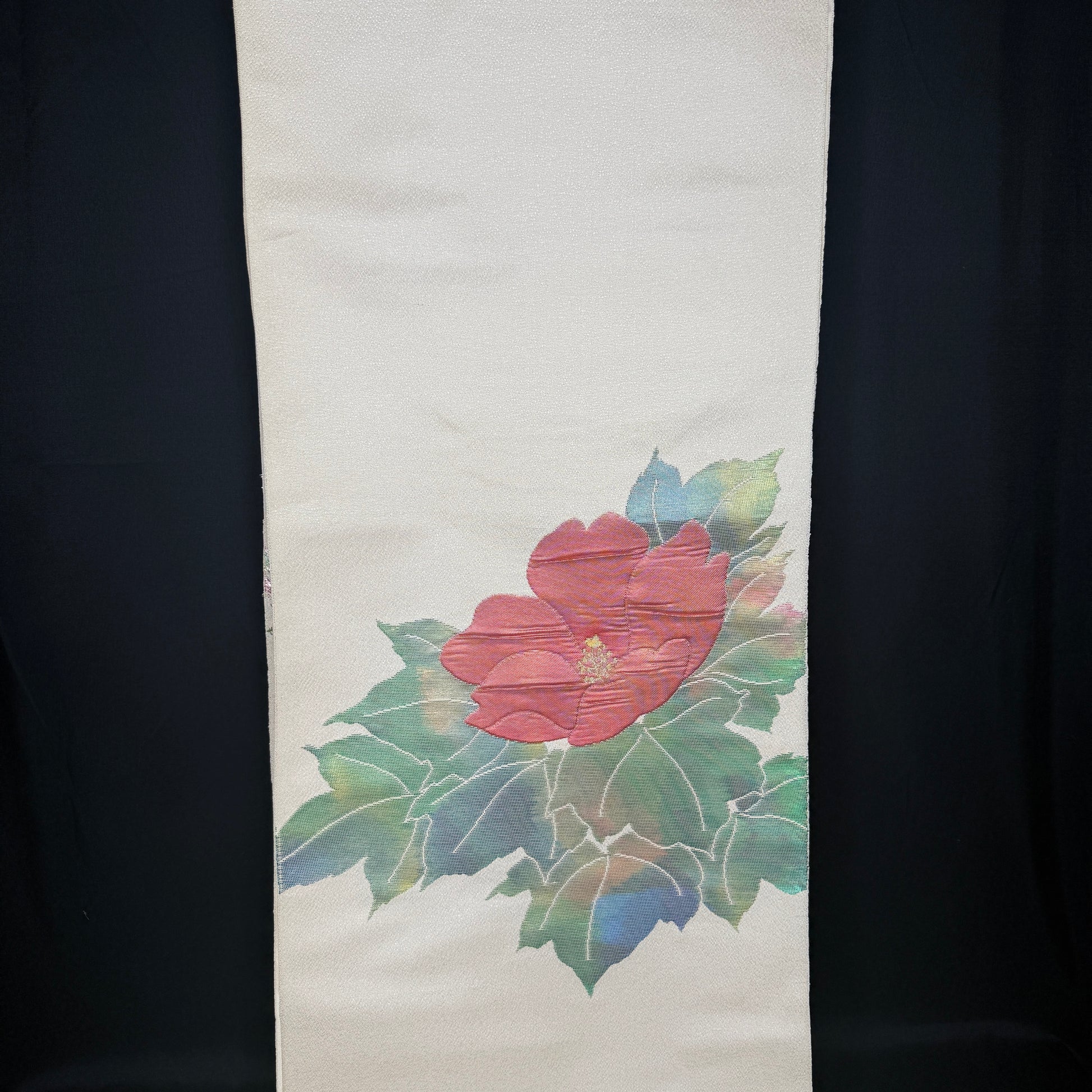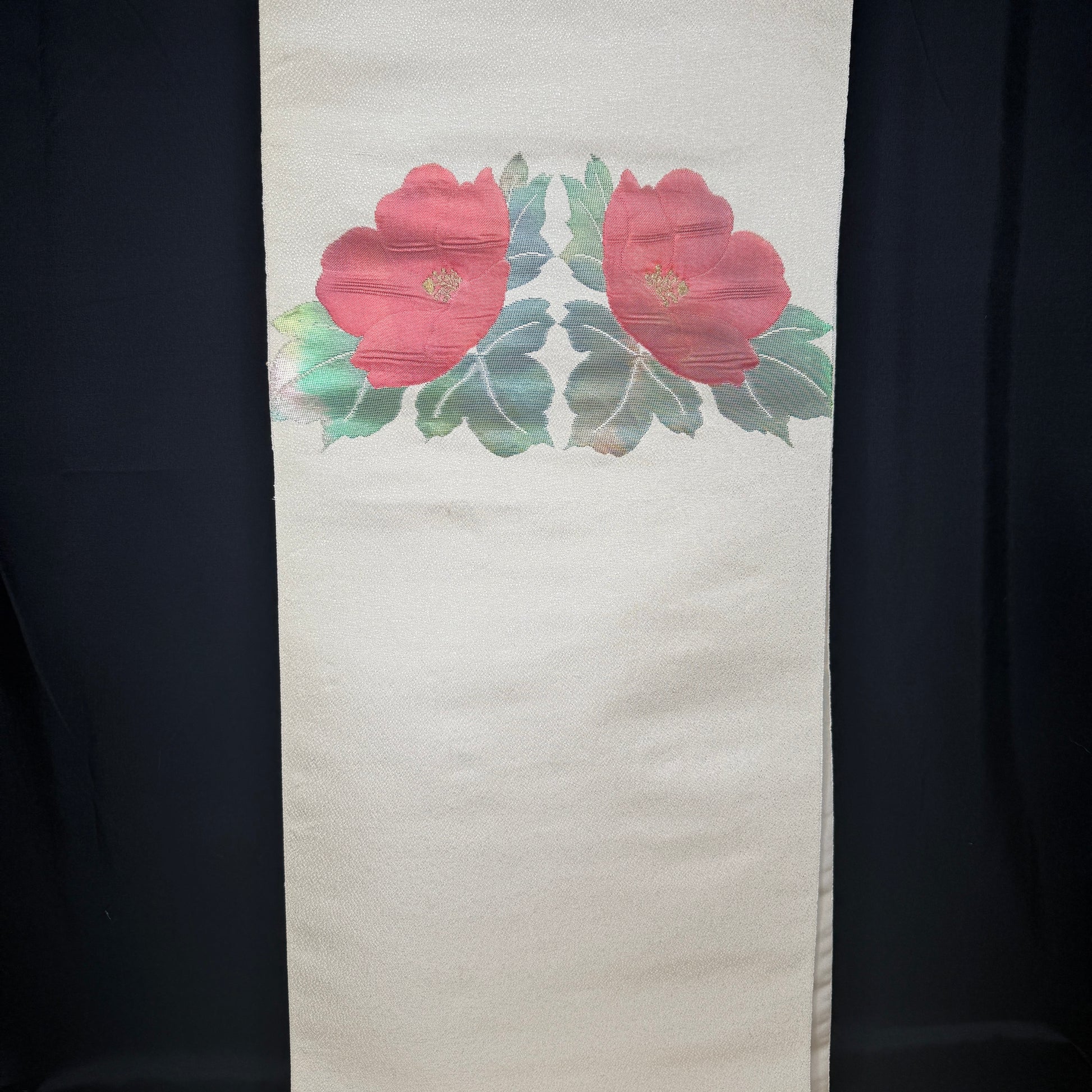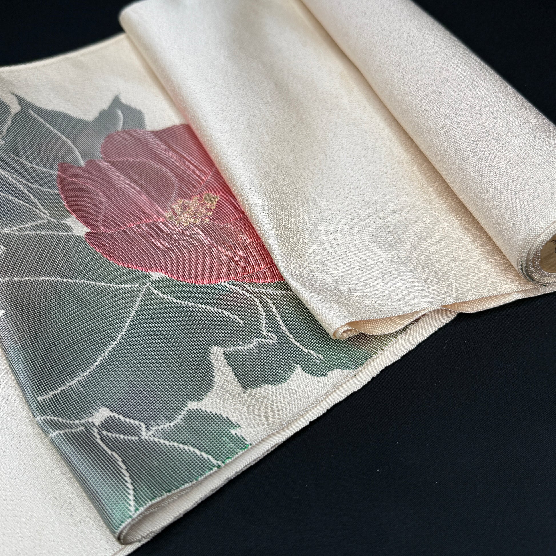 Softly understated, this vintage nagoya obi bolt features a cream-toned, subtly speckled jacquard background that allows the woven camellia motif to emerge with quiet grace. The bloom appears in muted rose and leafy green tones. Elegant and restrained!