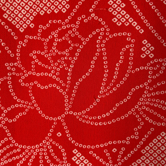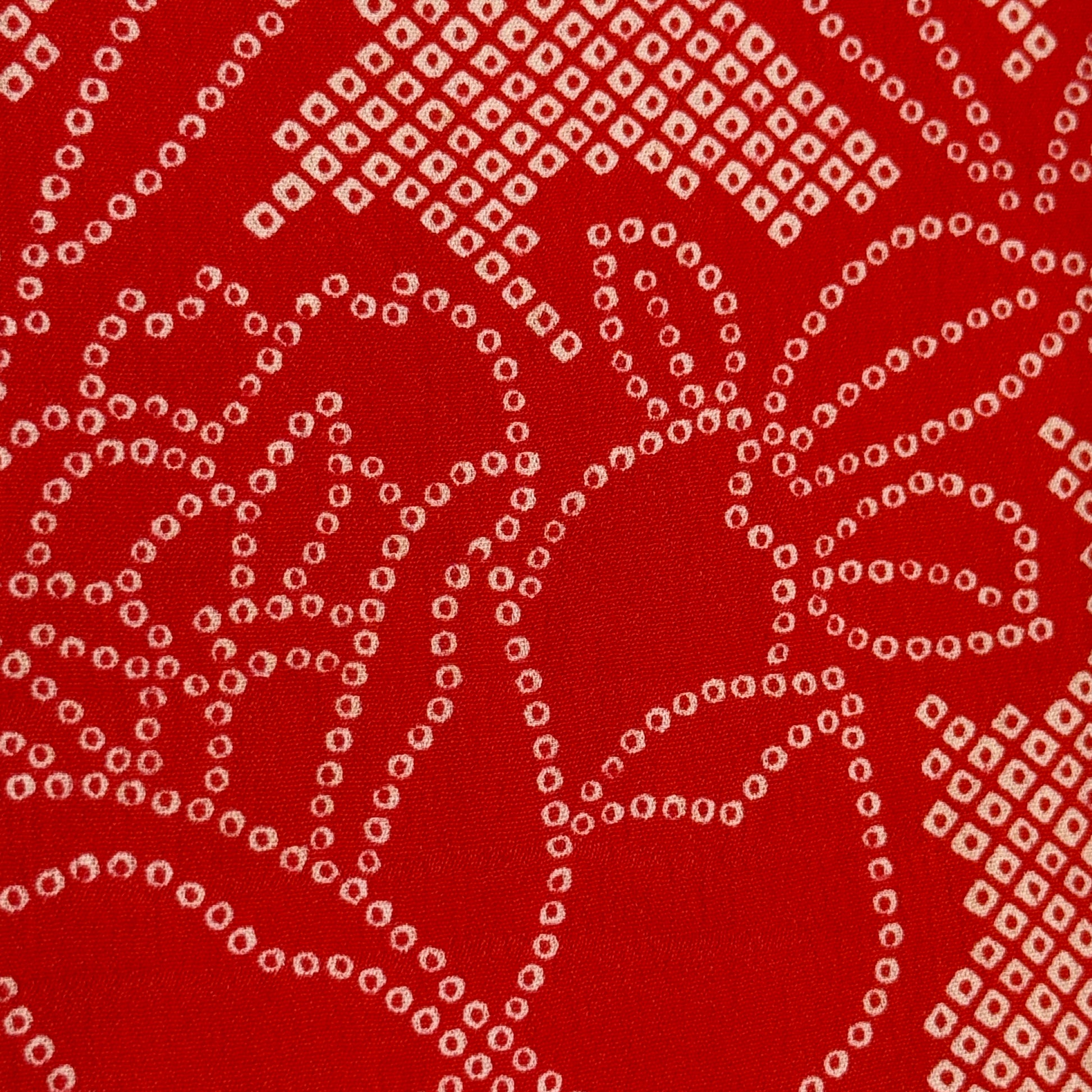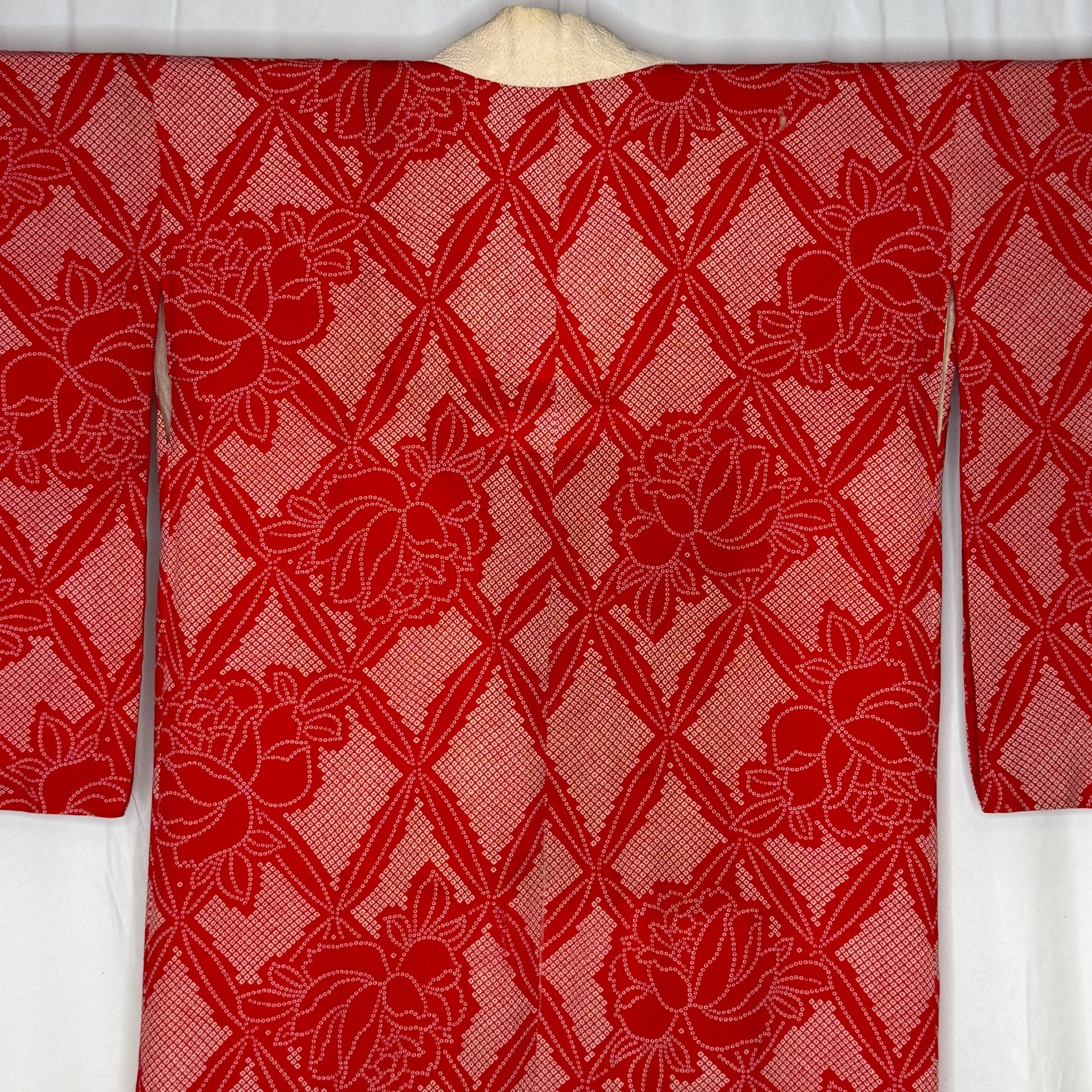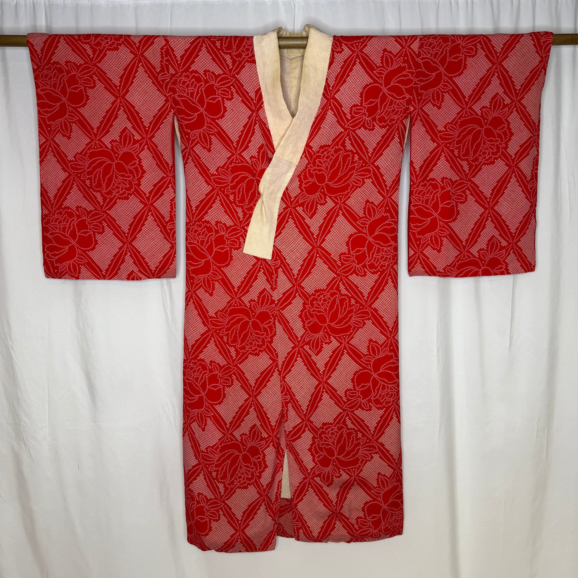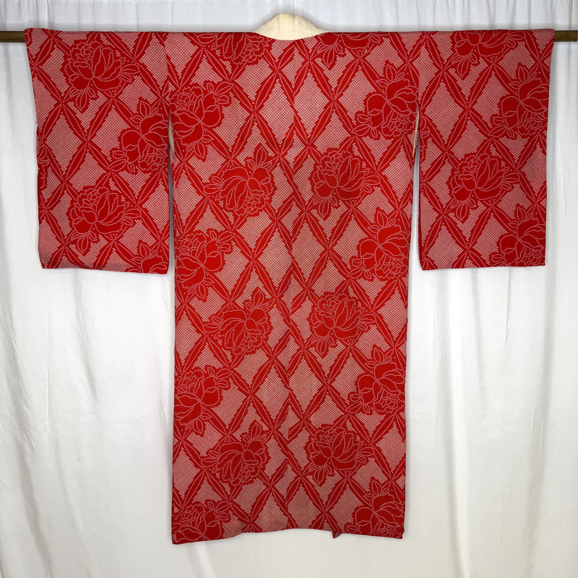 Vibrant and full of vintage charm, this women's underkimono showcases a large lattice grid pattern filled with stylized roses, each one formed from hundreds of tiny, stenciled dots that mimic the traditional kanoko (fawn spot) shibori pattern. The bright red field creates a festive feeling that fits beautifully into a holiday themed collection, while the subtle pattern work adds softness and depth.