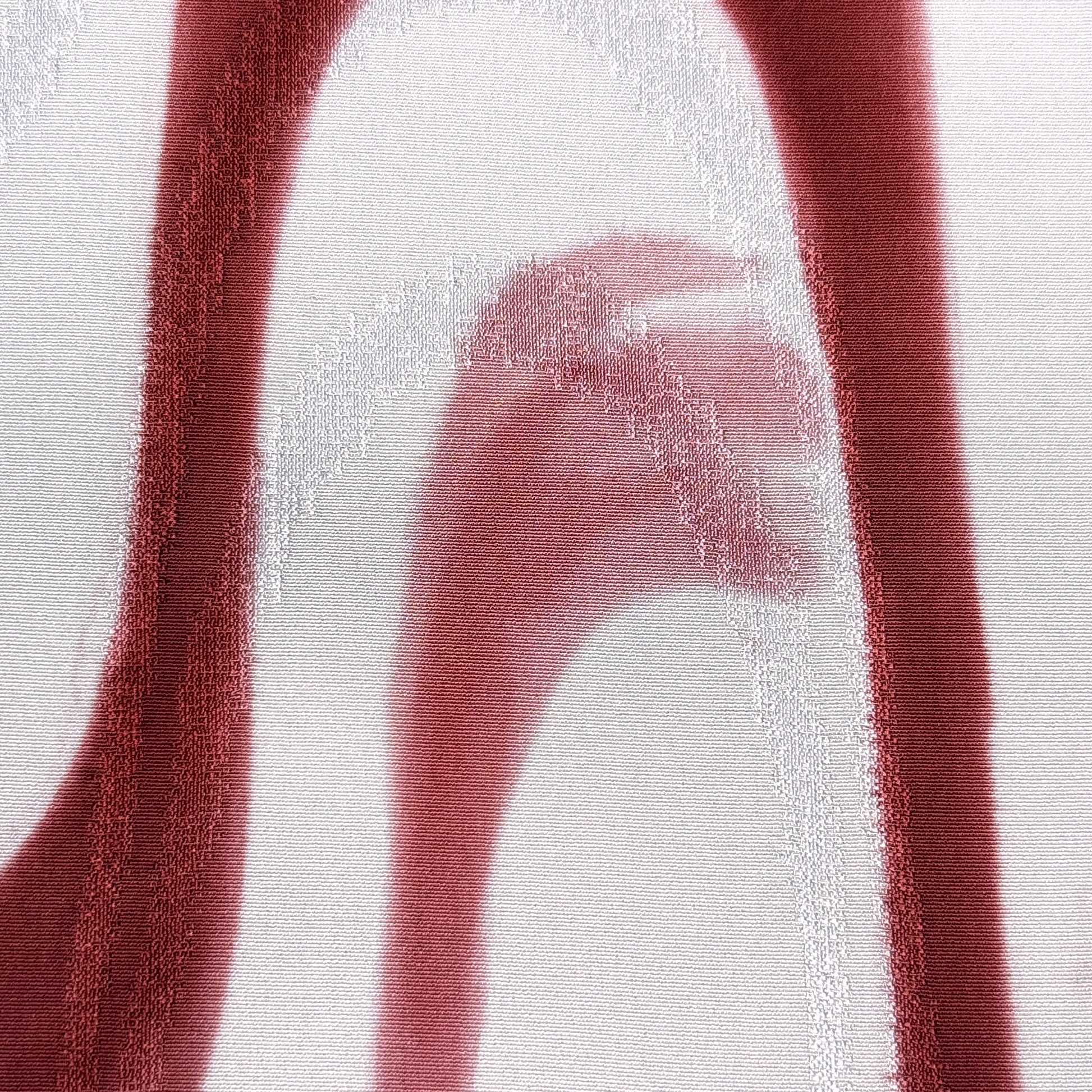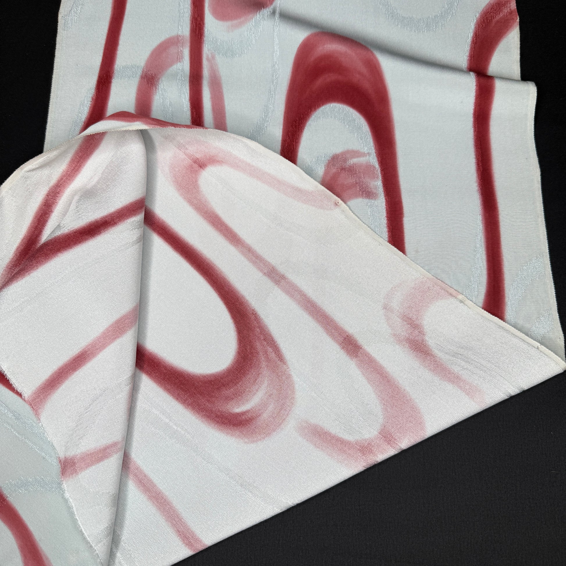 This is soft drapey silk - great scarf weight - with a layered design of long red curves that resemble swirling water to us. The pattern was brush-dyed by hand and offers a genuine artist appeal. Underneath those curves is a woven jacquard that echoes the same curved design in an eggshell shade of ivory with almost a gray cast.