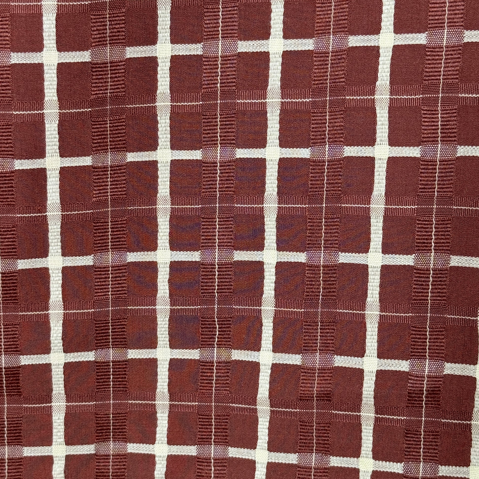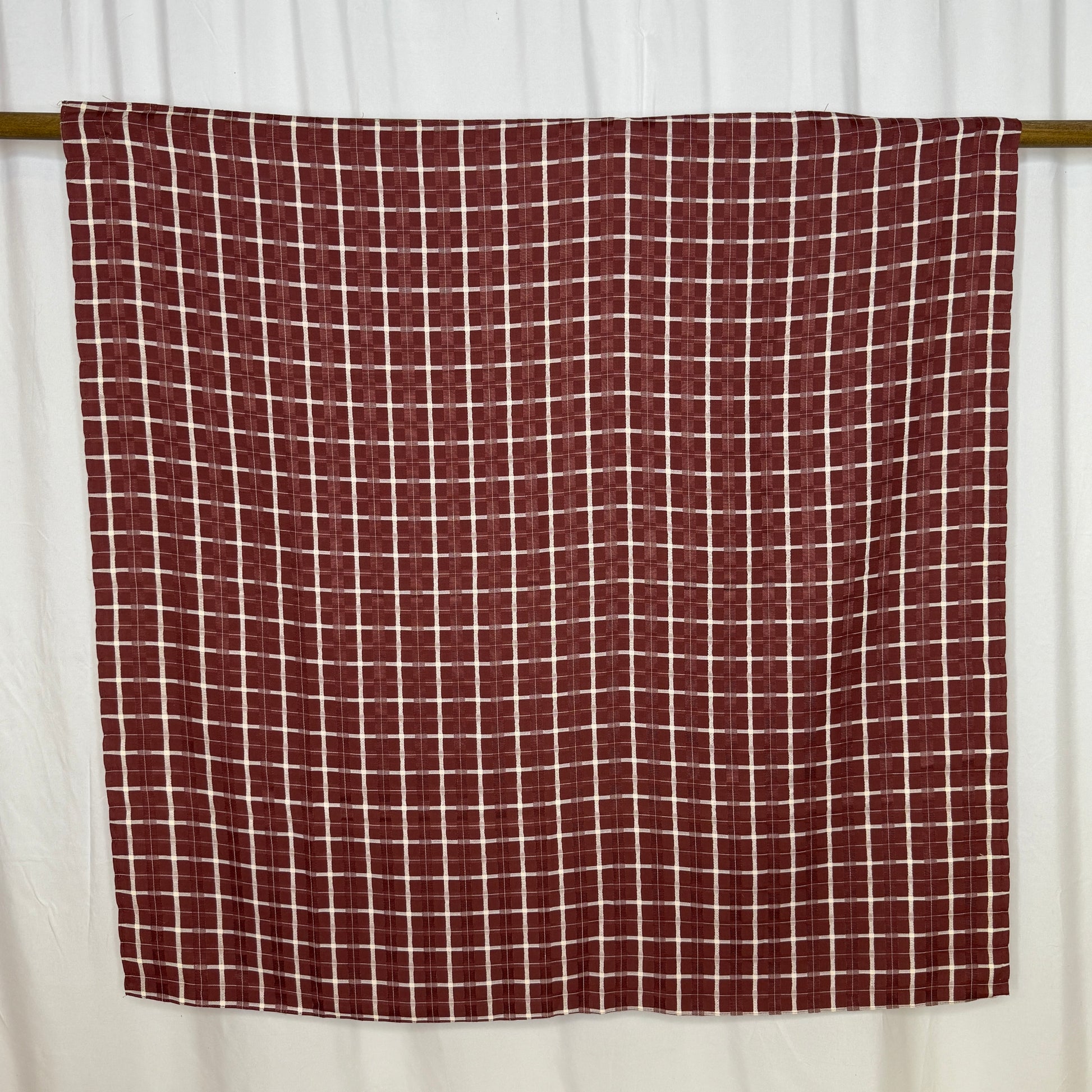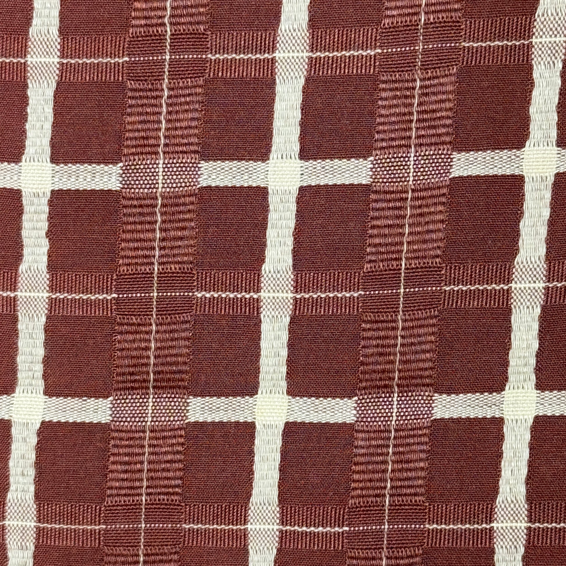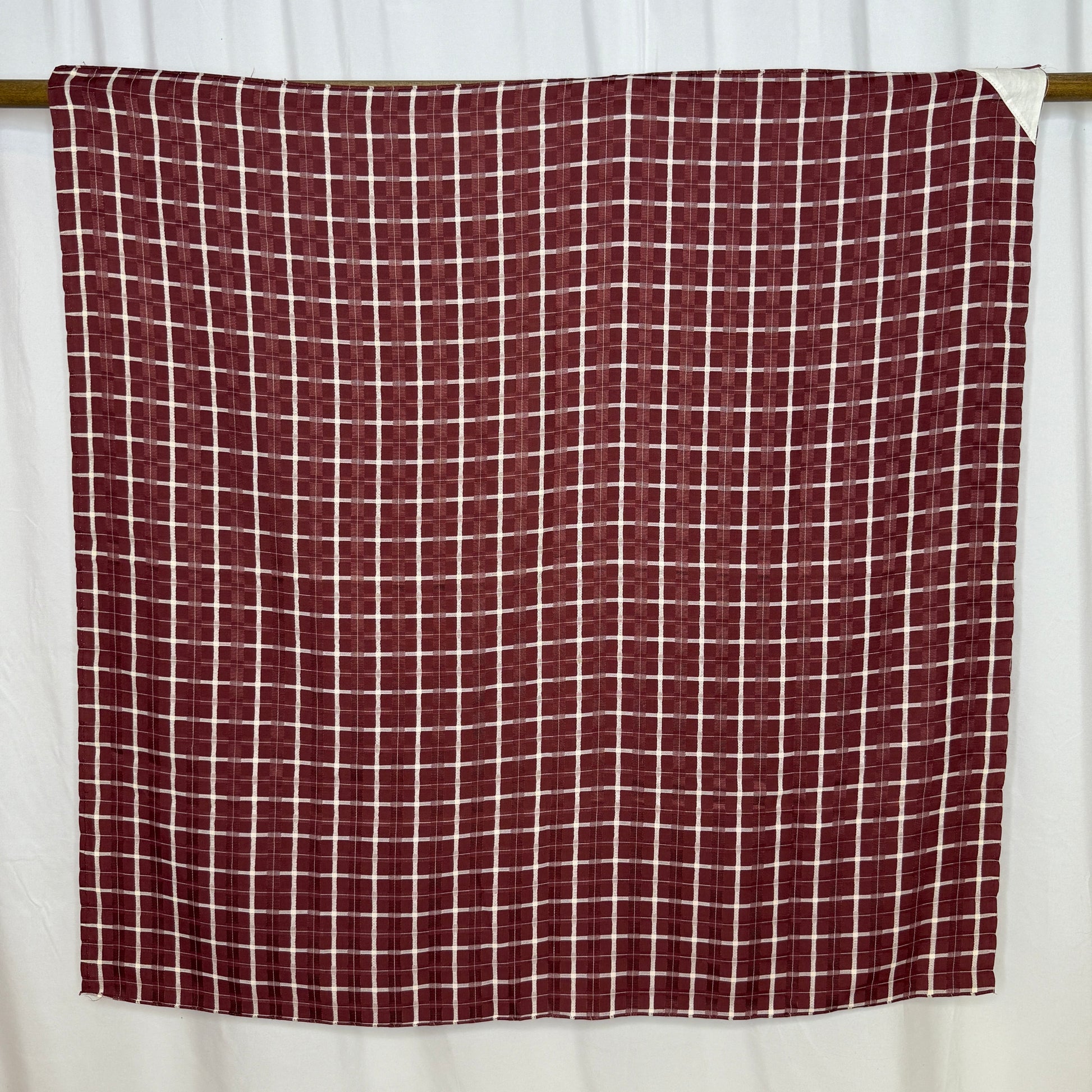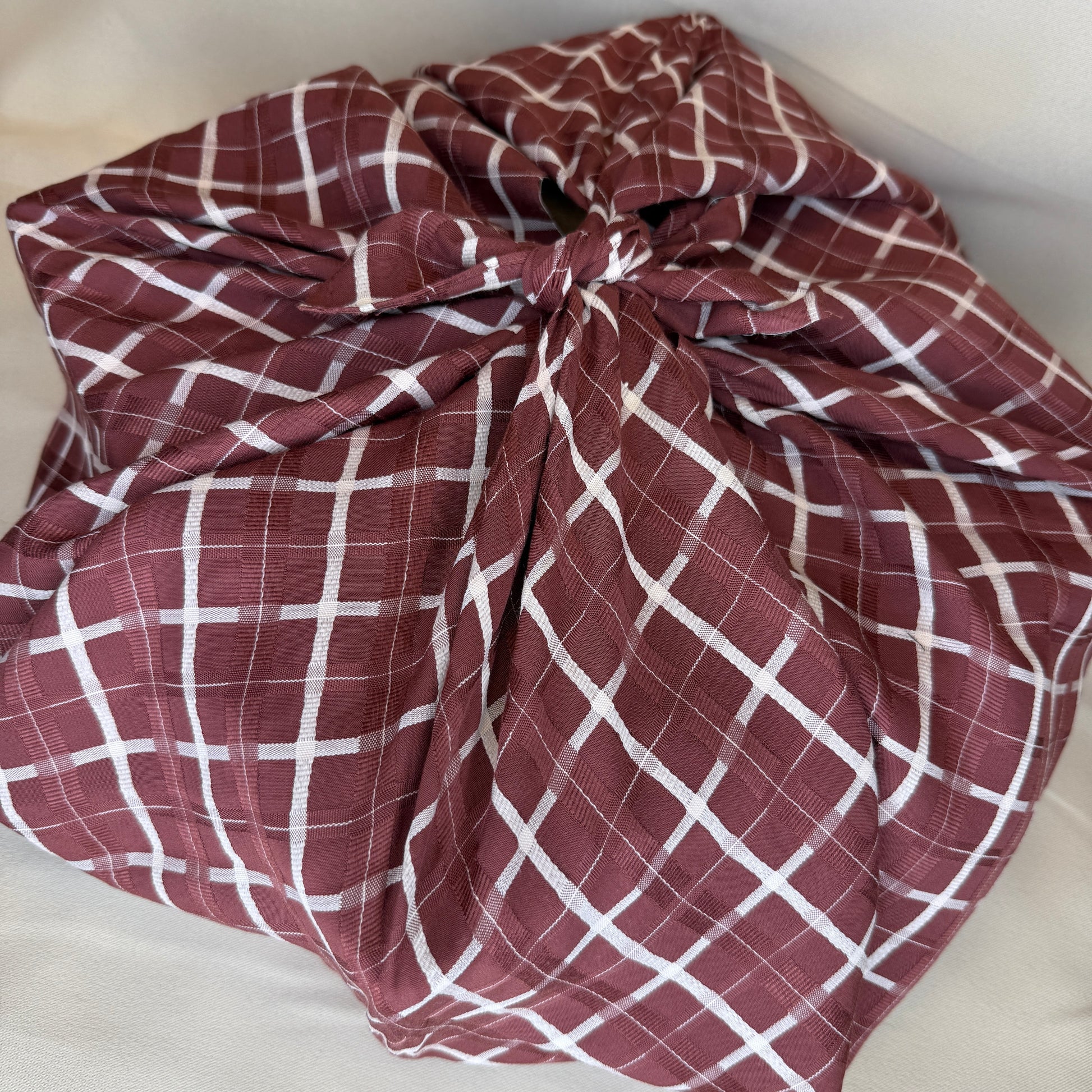 This vintage furoshiki has a warm, deep mauve and cream grid pattern that gives it a grounded, earthy feel perfect for everyday wrapping. The woven texture features subtle raised sections along the intersecting lines, adding dimension. The silk is soft and refined with a slippery drape.